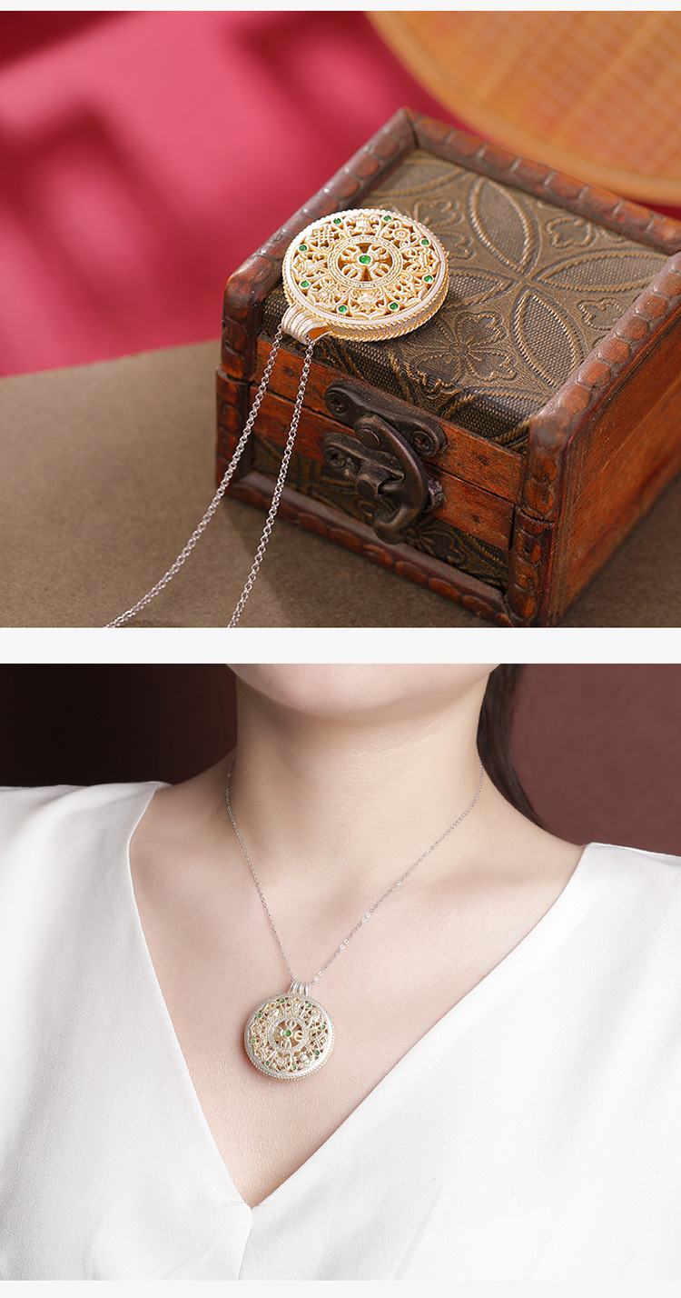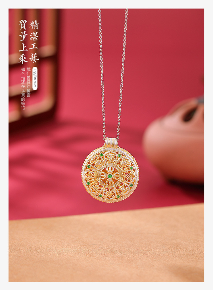 S999足银撒金翡翠圆珠圆牌镂空,扭纹复古中式民族国潮风吊坠套链CW-DZ06675