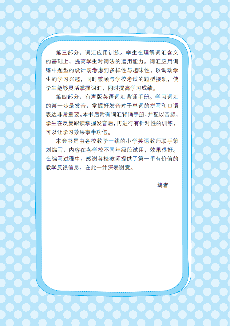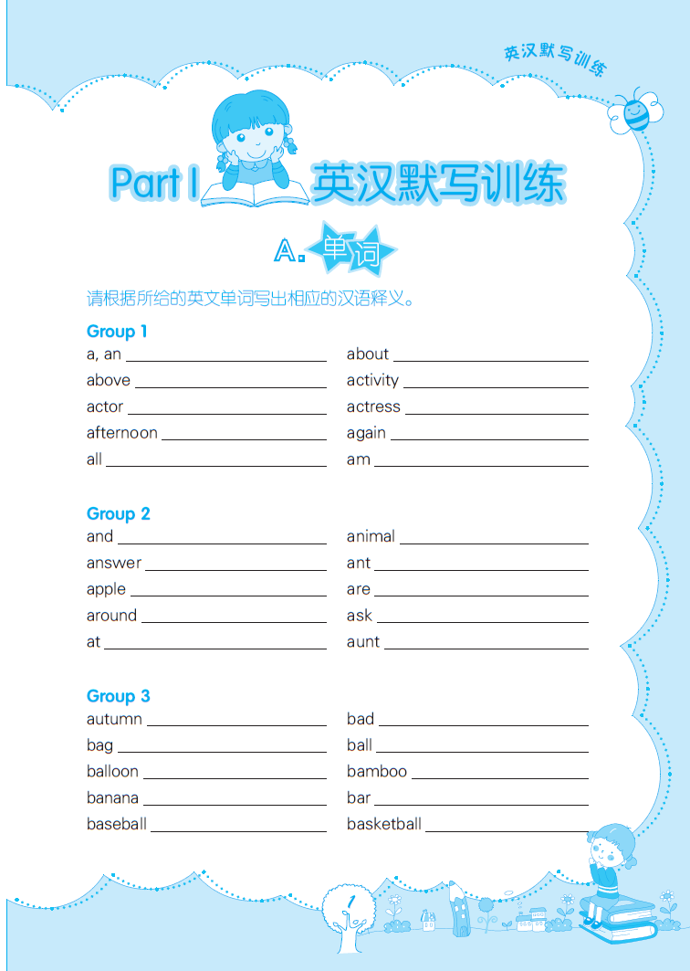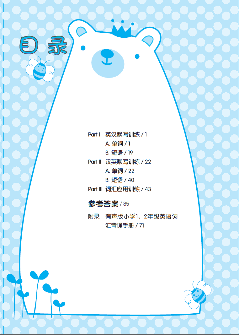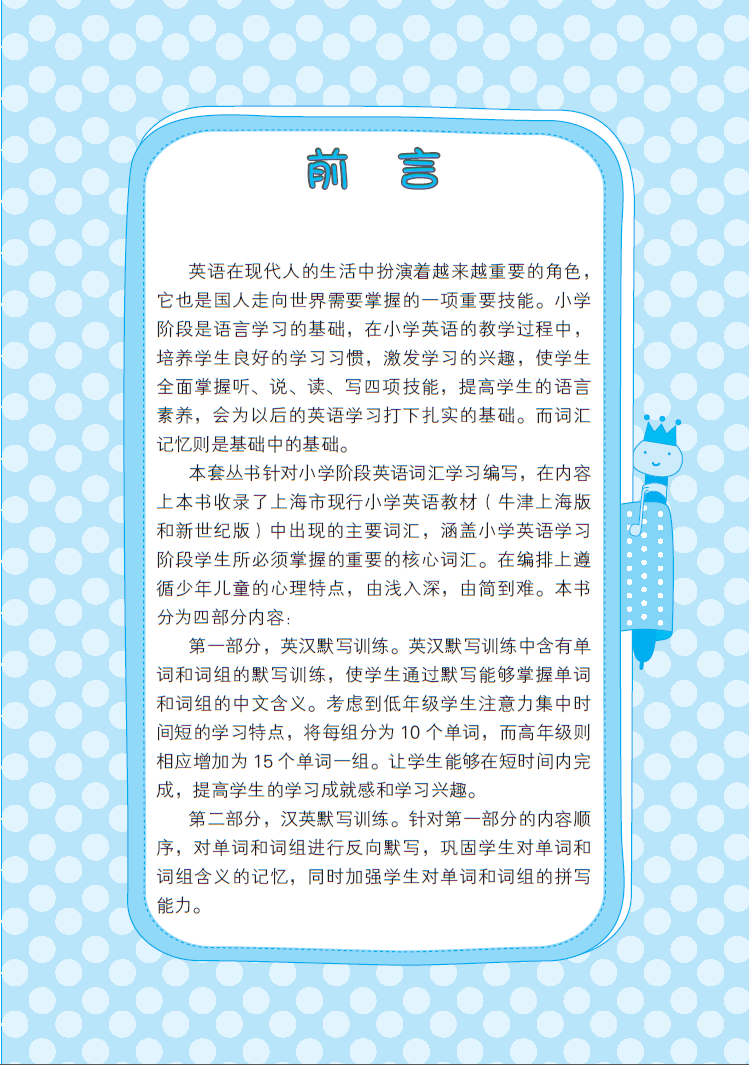 本书针对小学1、2年级英语词汇编写,在内容上本书收录了上海市小学英语现行教材(牛津上海版和新世纪版)中出现的主要词汇,涵盖小学英语学习阶段学生所必须掌握的重要的核心词汇。在编排上遵循少年儿童的心理特点,由浅入深,由简到难。本书分为四部分内容:英汉默写训练、汉英默写训练、词汇综合能力训练以及有声版小升初英语词汇背诵手册,通过跟读音频,记忆单词,并进行有针对性的默写及应用训练,使学生打好英语词汇学习基础。