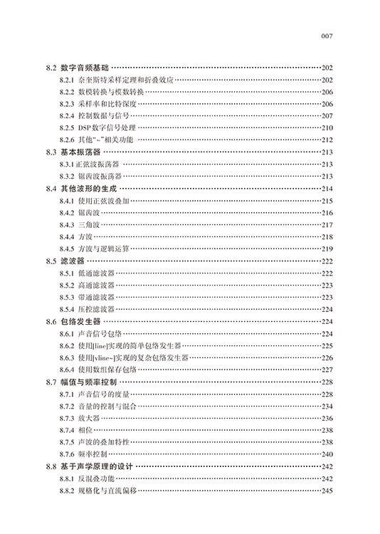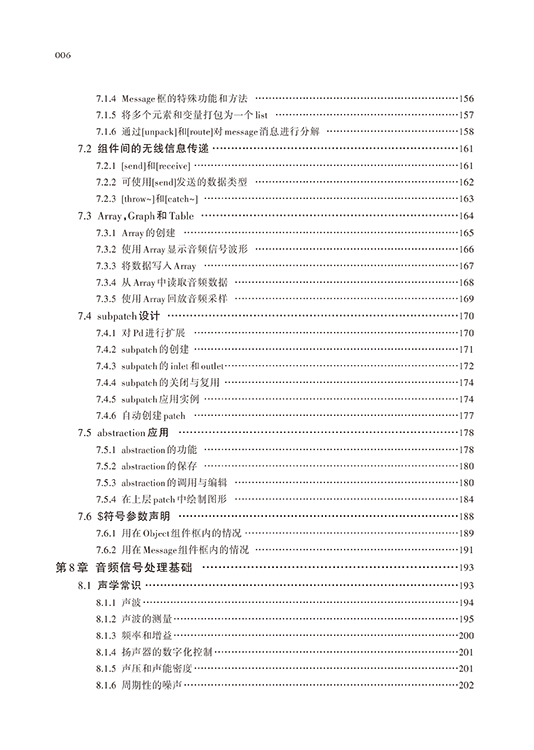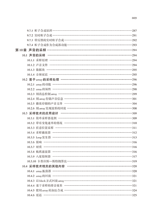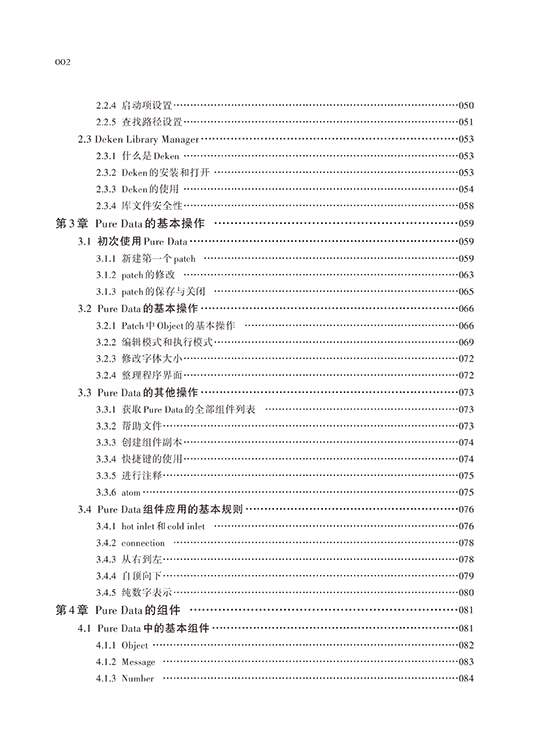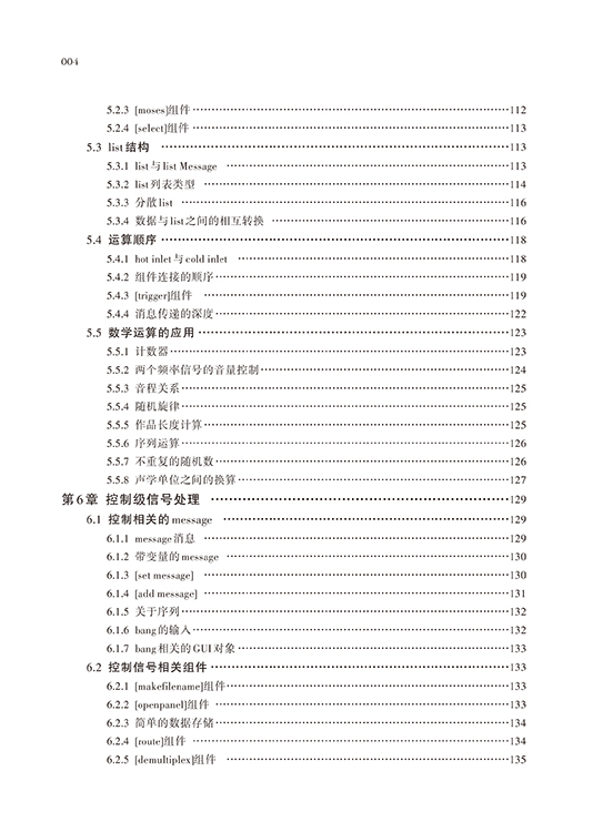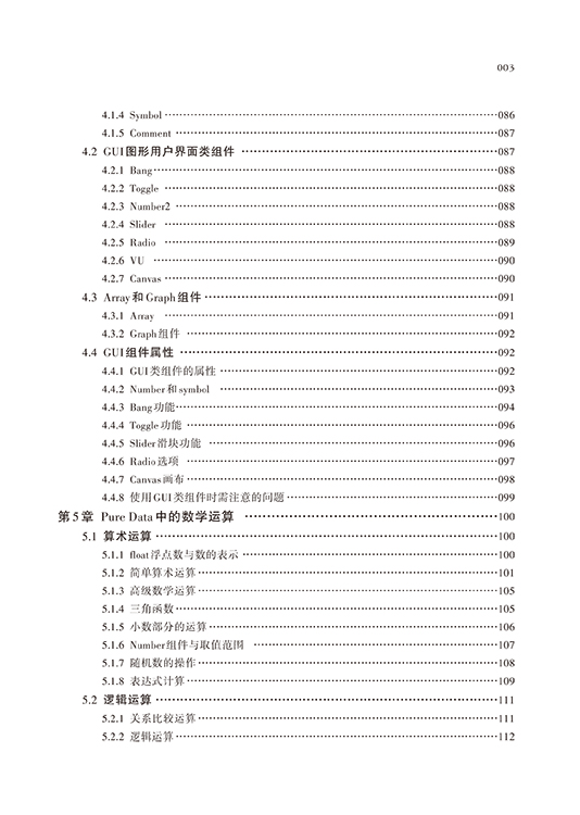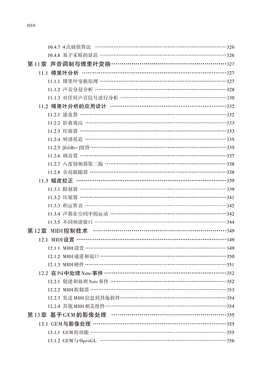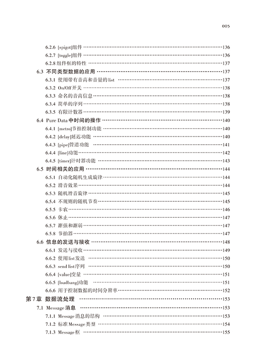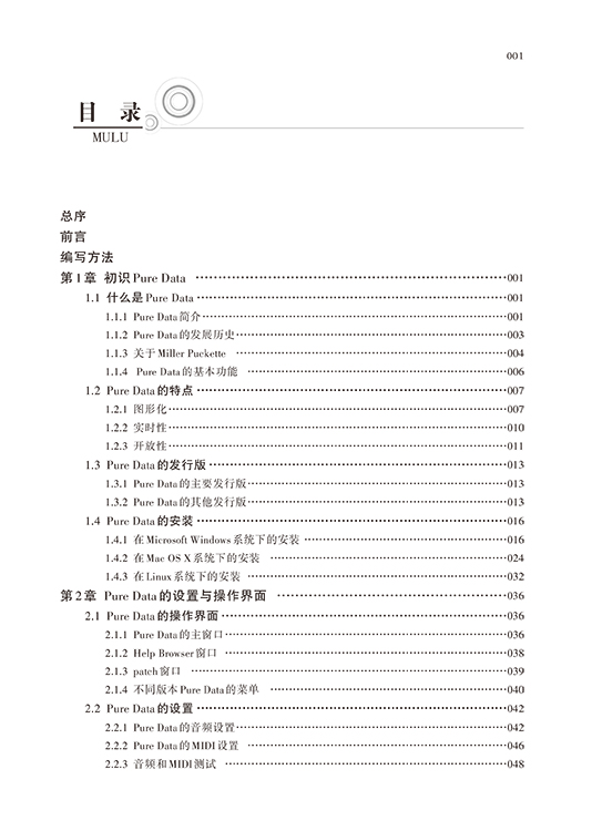 PURE DATA(PD)是一门专业高效的用于电子音频处理的声音编程语言,是一种为音频、视频和图像处理专门设计的实时图形化编程环境,通常用于实时音乐表演、音效设计、作曲、音频分析等。全书共十五章:初识PD、PD的设置与操作界面、PD的基本操作、PD的组件、PD中的数学运算、控制级信号处理、数据流处理、音频信号处理基础、声音合成与采样、声音的采样、声音调制与傅里叶变换、MIDI控制技术等。作者在各章内容中从基础的计算机相关知识进行讲述,首先介绍了PD的基本认识及编程常识等,然后由浅入深地讲述了电子音乐处理技术;分析的内容以电子音乐学习者们更容易接受的方式来进行,主要集中在听觉和音响方面;叙述方式上用简短的介绍构建程序来说明,避免使用抽象的公式。本书作为电子音乐专业的必修教材,既可用于高校电子音乐专业教学使用,还可用于电子音乐研究者、新媒体技术艺术家等以及需要进行电子音乐创作和编程的用户使用。