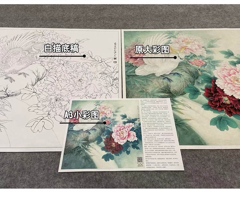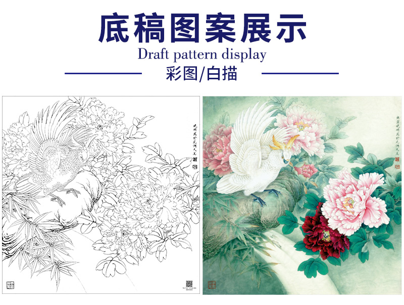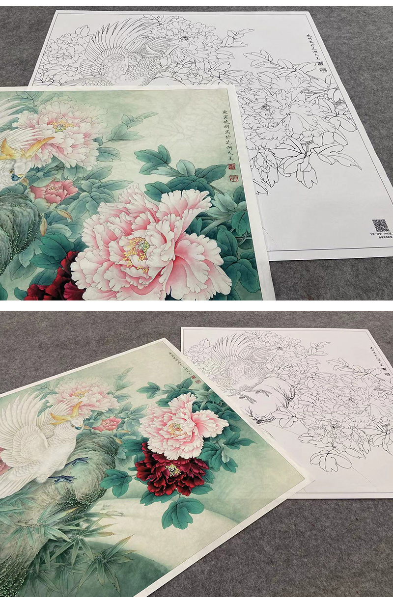 【大彩图】李晓明工笔画白描底稿斗方小品《独舞花间》牡丹鹦鹉临摹勾线花鸟线稿KA07