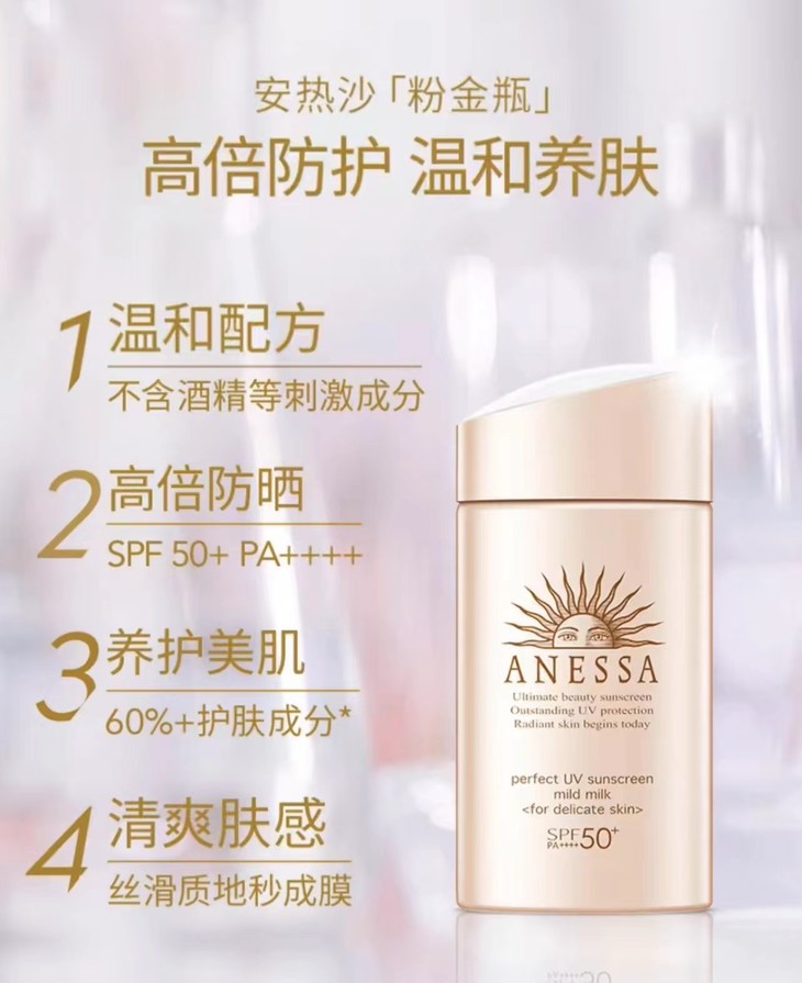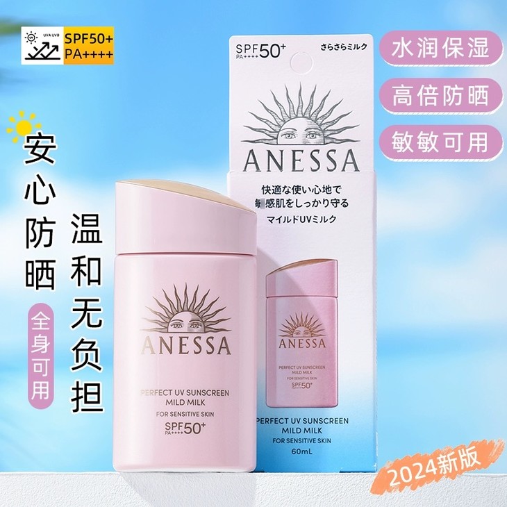 👑资生堂安耐晒防晒霜60ml-粉色 24年款 💎敏感肌专用,全天候安心防晒 🔥【最新防紫外线科技】新添加“紫外线防御粉末”,物理防晒力up 🔥【新添加植物保湿成分】芍药+樱花+滨海当归三大植物萃取,温和保湿 🔅无酒精、无防腐剂、无香料,不易致敏致痘 💯乳液质地,肤感清爽,适合皮肤脆弱的人群使用!