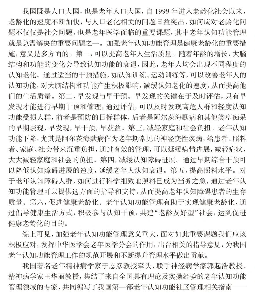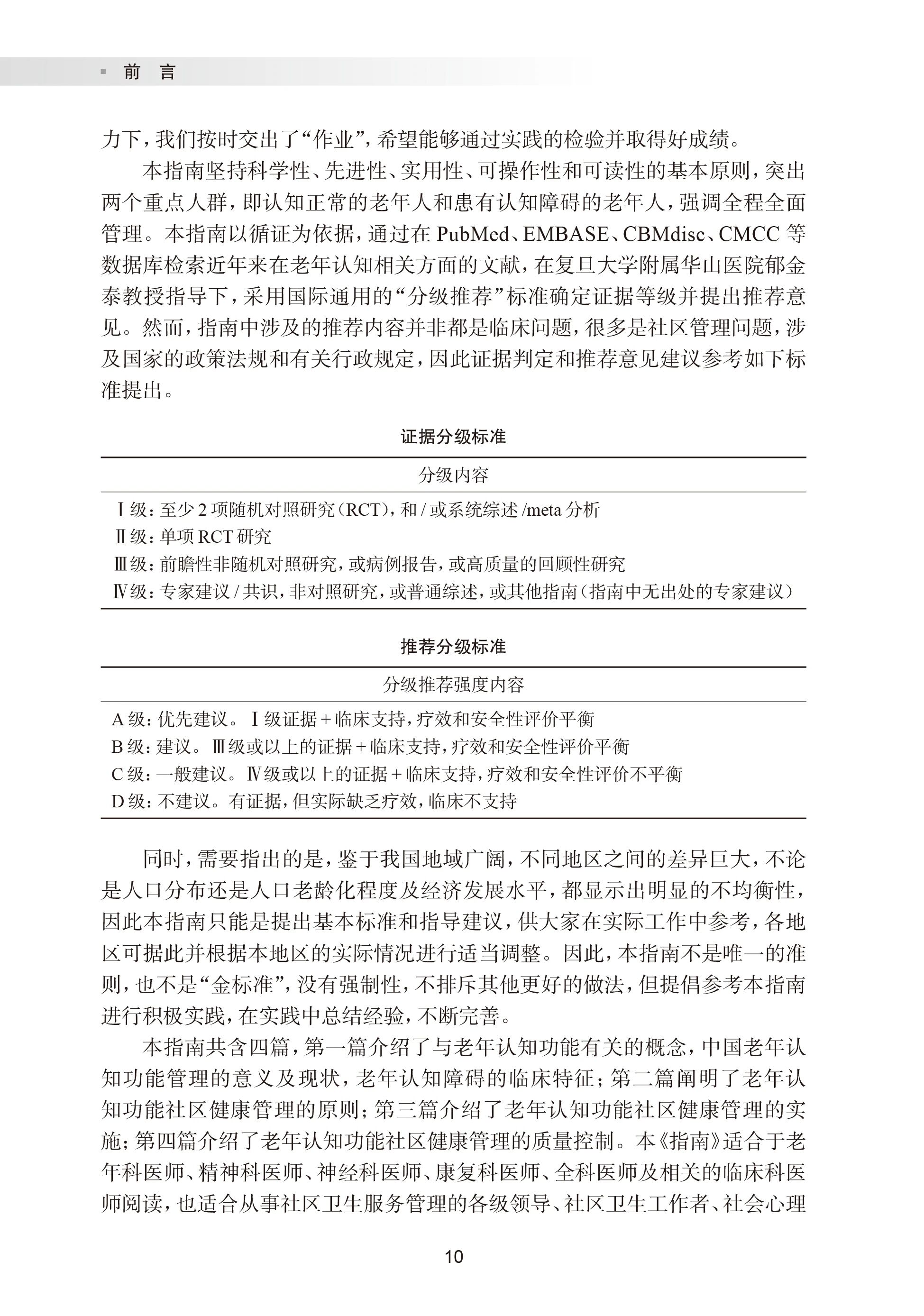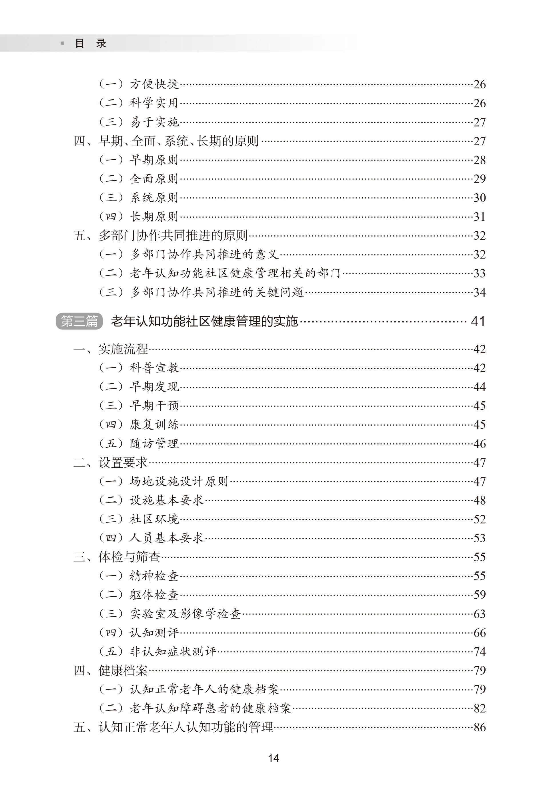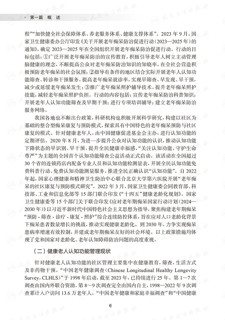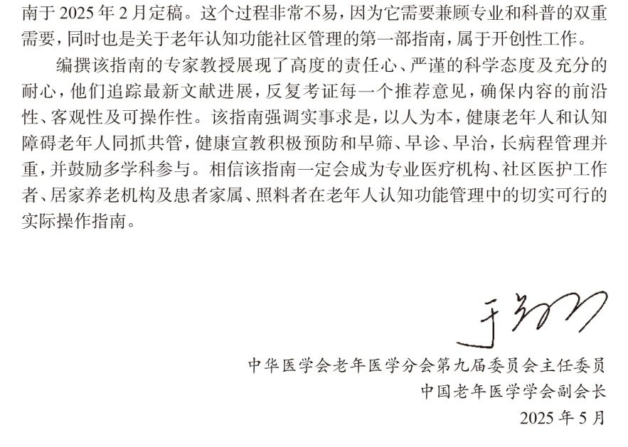 内容实操性强且全面,贴合社区应用场景 本指南聚焦社区健康管理的实际需求,从认知功能筛查评估、早期干预、日常照护到风险防控等全流程提供具体操作方法,同时涵盖不同健康状况老年人的个性化方案,既符合我国国情和社区管理特点,又具有科学性、实用性和可操作性,可直接指导社区医护人员、照护者开展工作,兼具实用性与全面性,对我国实现积极老龄化,促进老年人身心健康具有积极意义。