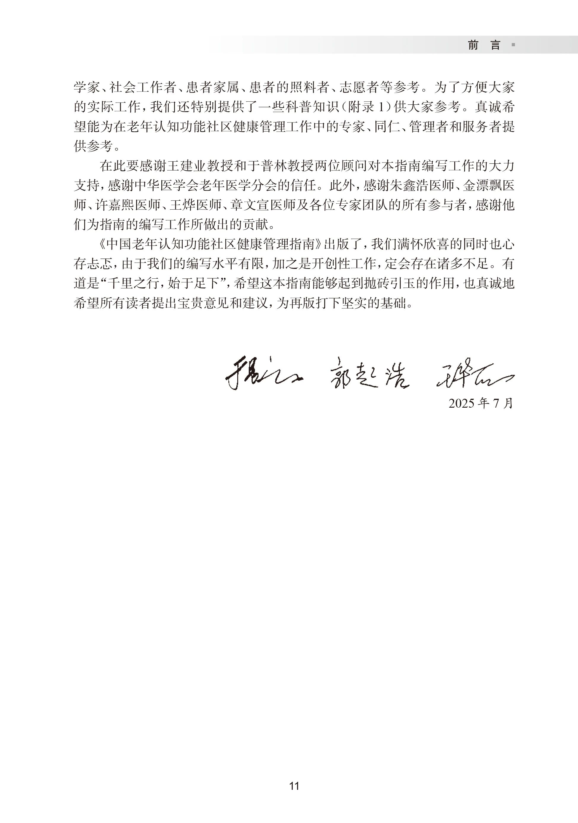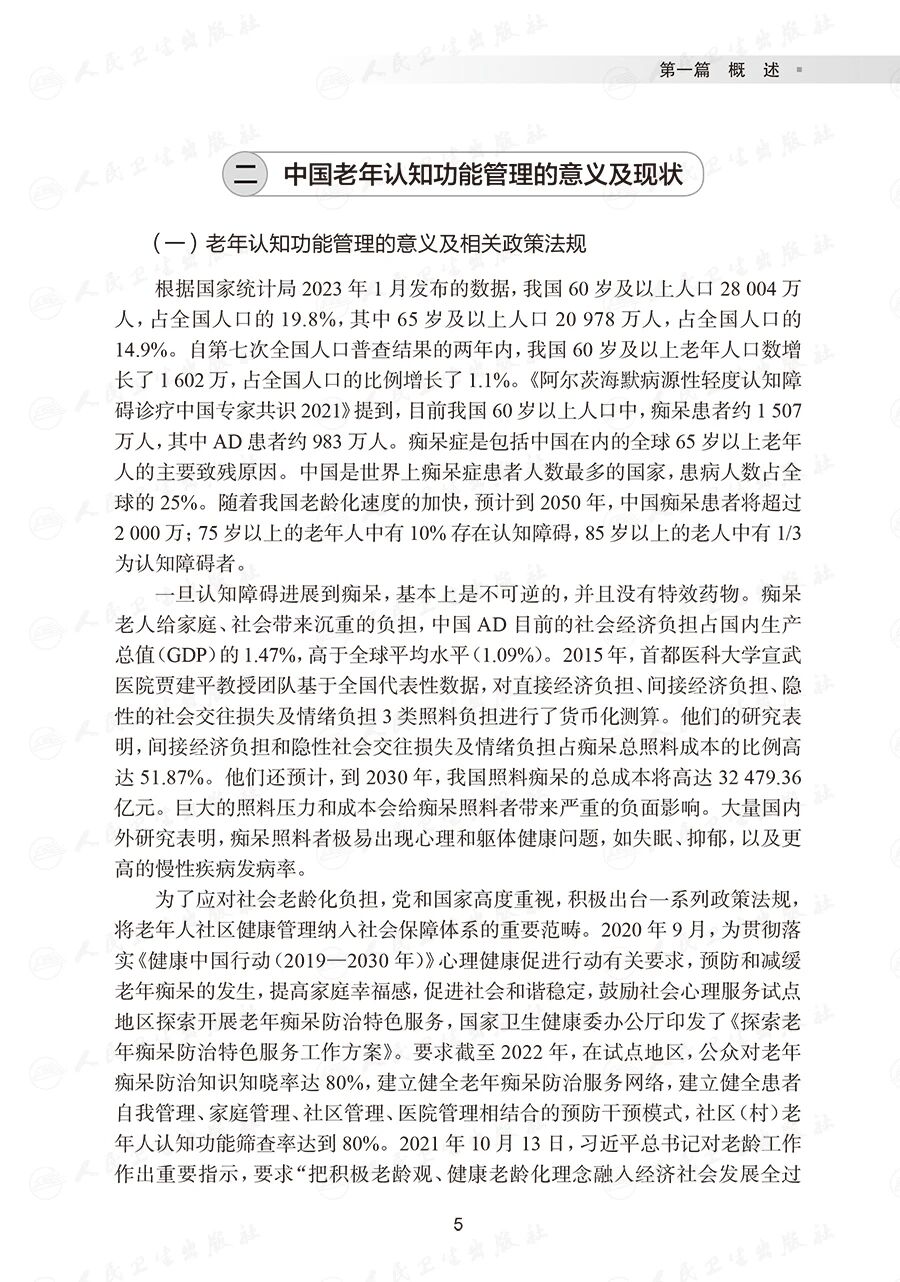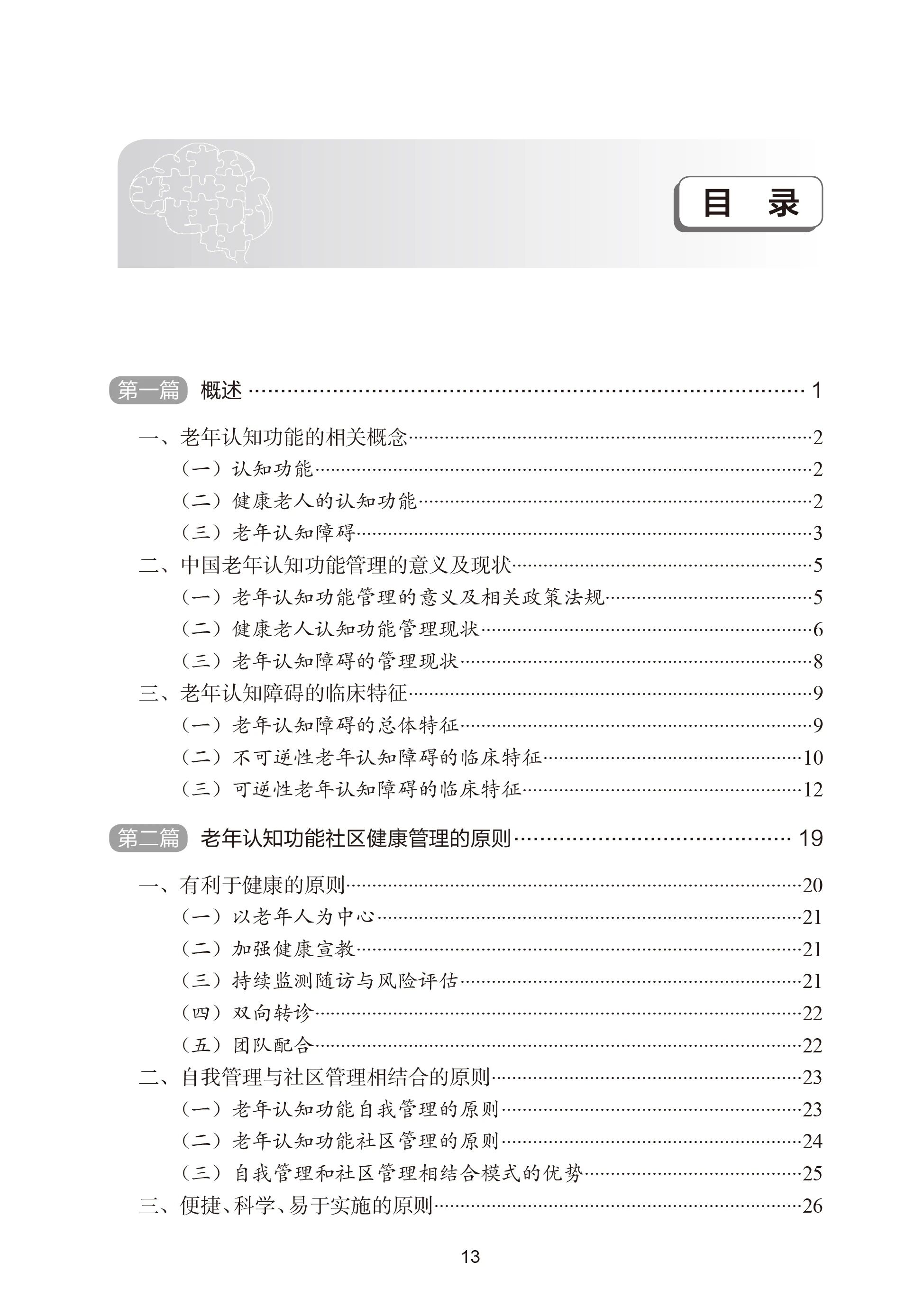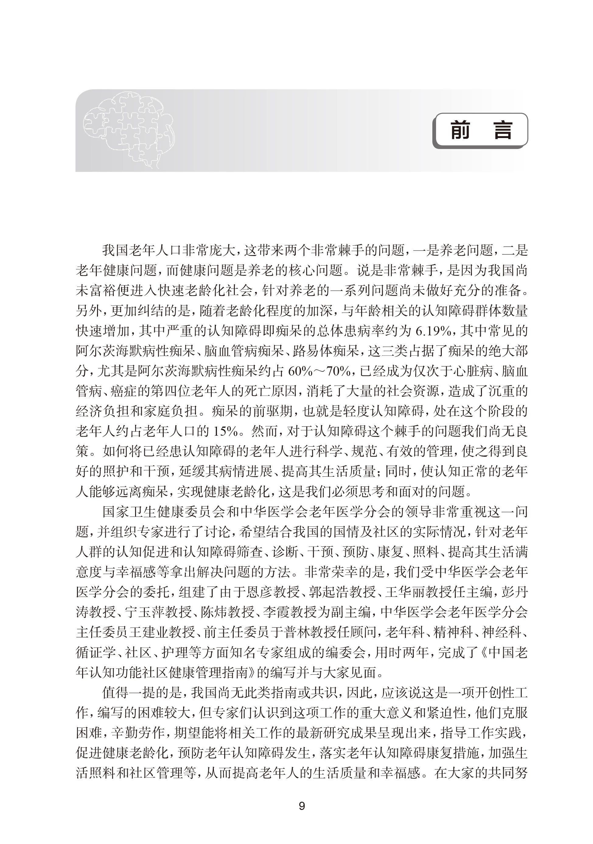 内容实操性强且全面,贴合社区应用场景 本指南聚焦社区健康管理的实际需求,从认知功能筛查评估、早期干预、日常照护到风险防控等全流程提供具体操作方法,同时涵盖不同健康状况老年人的个性化方案,既符合我国国情和社区管理特点,又具有科学性、实用性和可操作性,可直接指导社区医护人员、照护者开展工作,兼具实用性与全面性,对我国实现积极老龄化,促进老年人身心健康具有积极意义。
