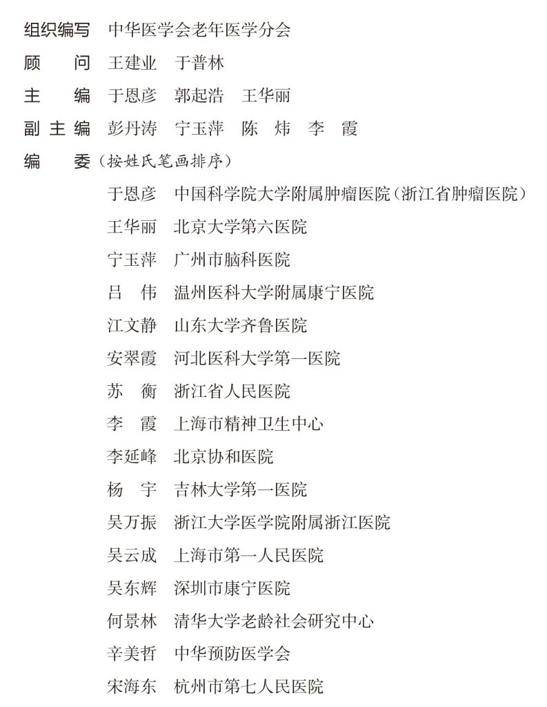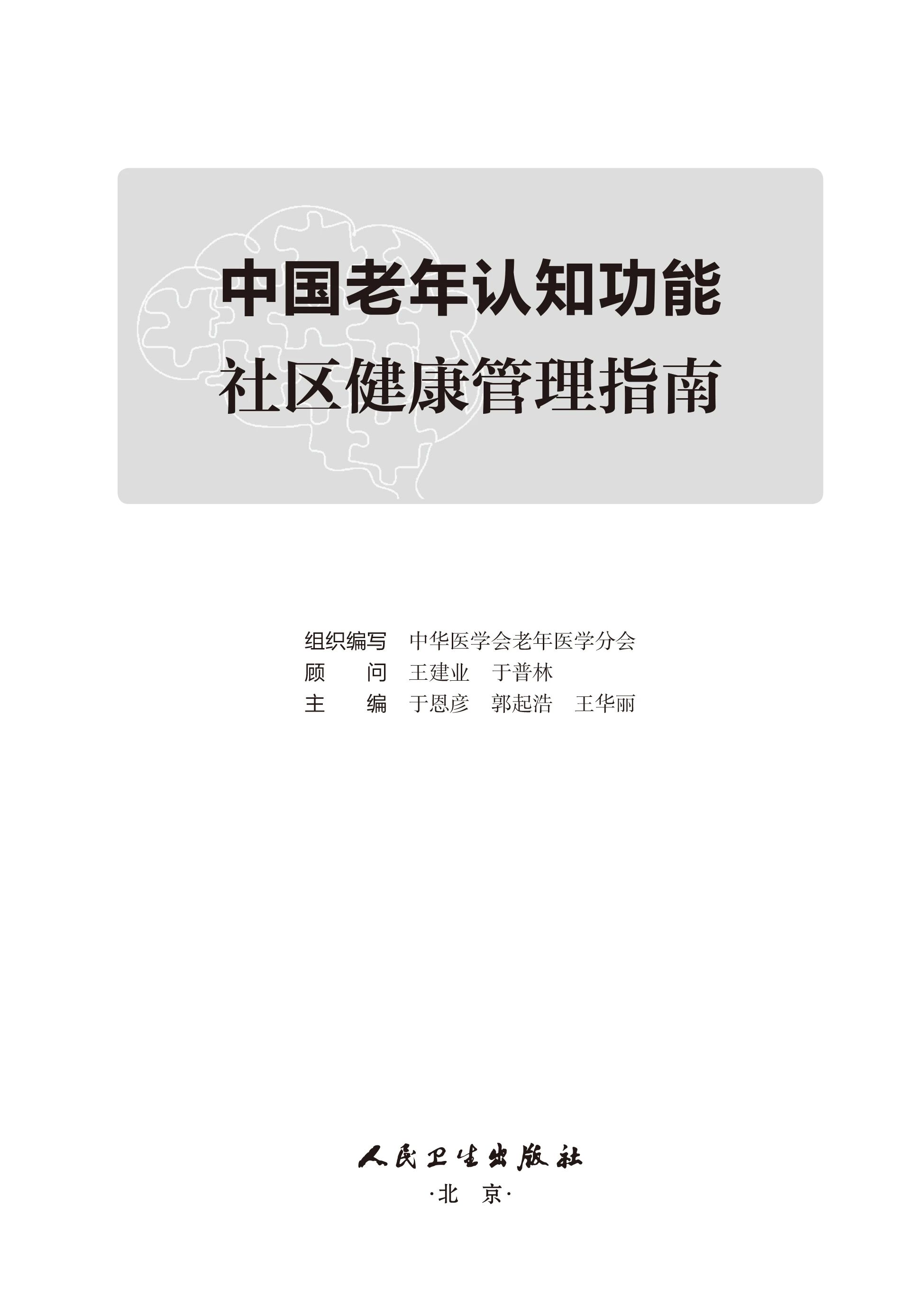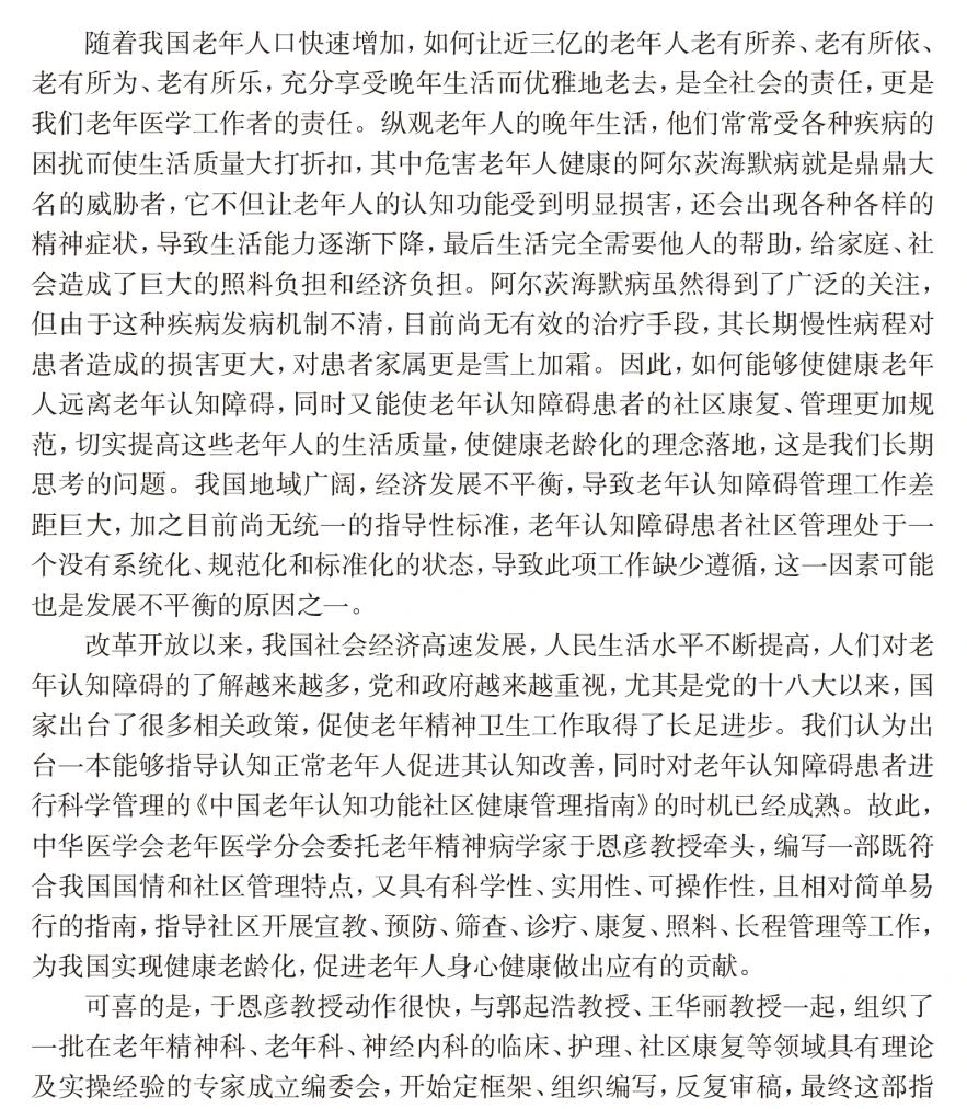 编写团队权威专业,奠定指南科学基石 本指南是我国第一本老年认知功能社区管理相关指南,由我国著名老年精神病学家于恩彦教授牵头,联手神经病学家郭起浩教授、精神病学家王华丽教授,集结了来自全国具有理论及实操经验的老年认知专家,是国内老年医学、认知神经科学、社区公共卫生等领域的顶尖专家学者多学科群策群力的智慧结晶。为本指南提供了权威、可靠的学术支撑。