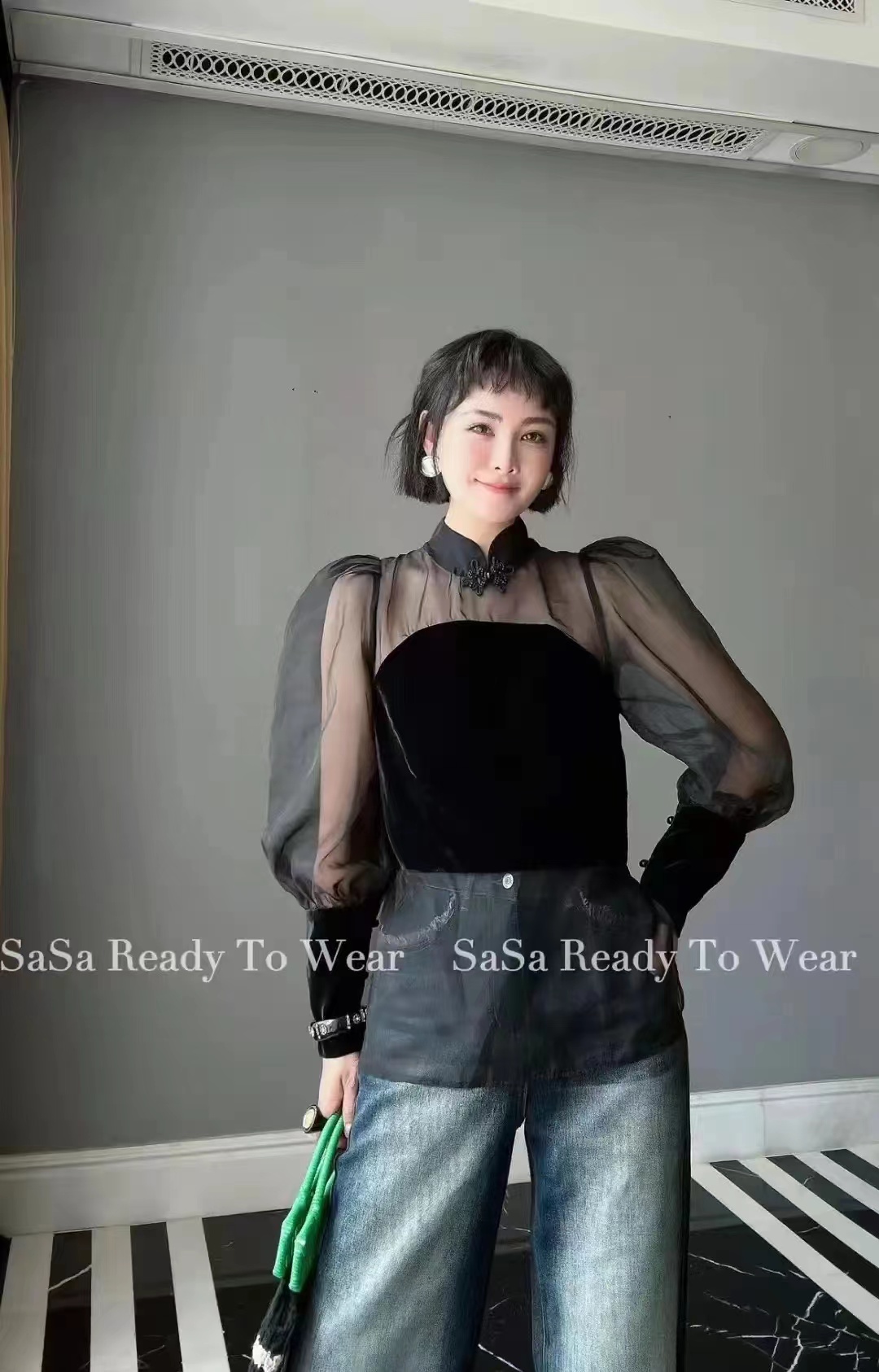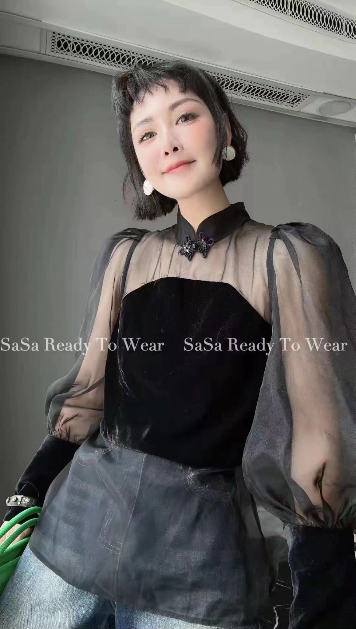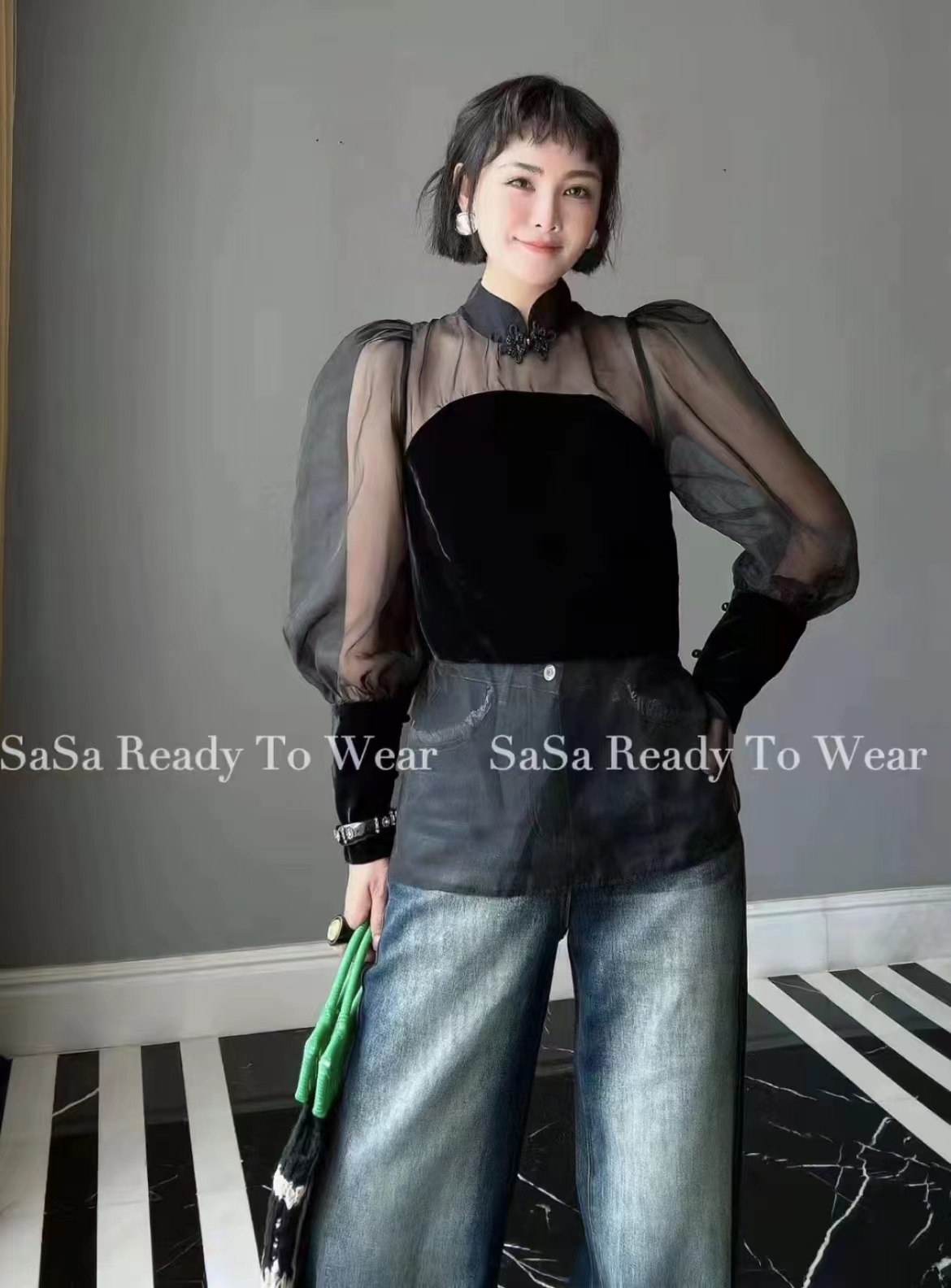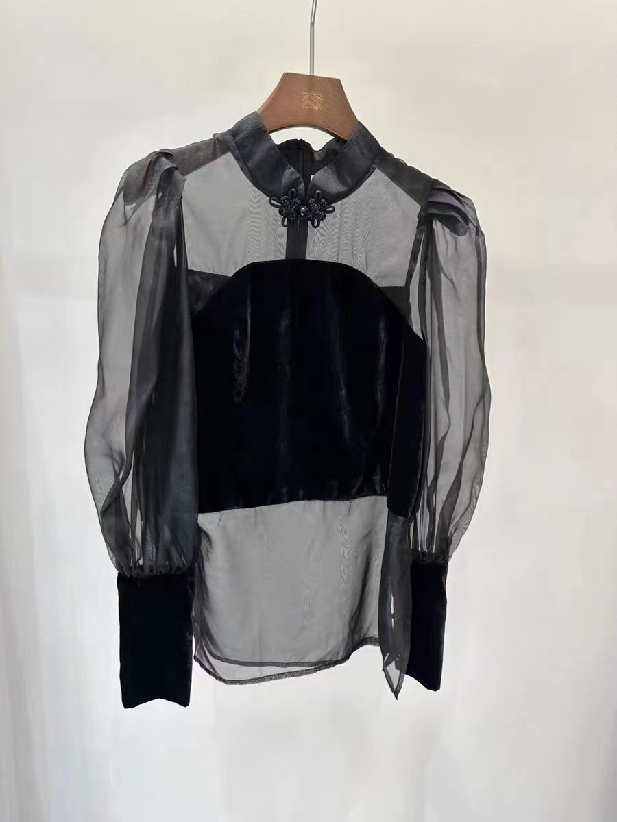 11.11促(NO退换)【特卖】 好看的哦~3962原创设计师金丝绒拼网纱袖小衫上衣-喜出
