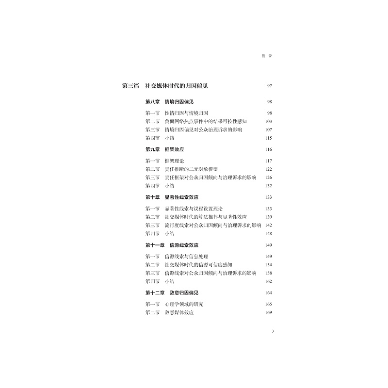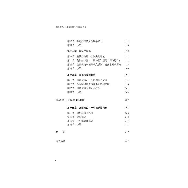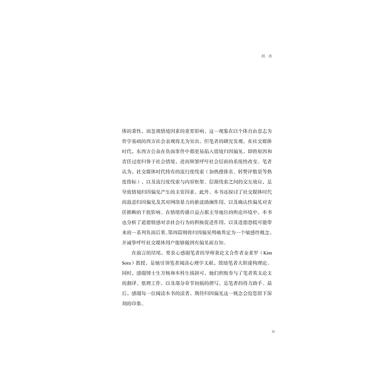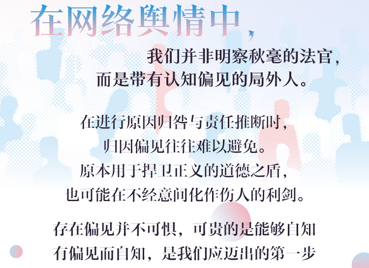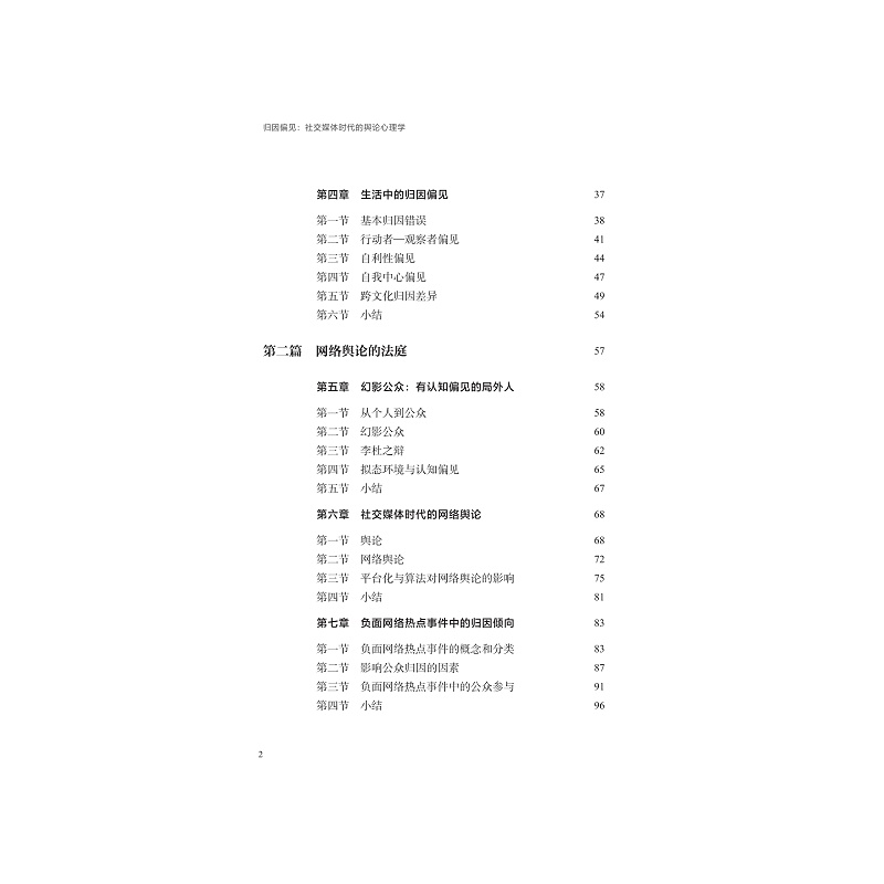 本书立足于传播学与心理学的交叉领域,从网络舆论的视角出发,反思社交媒体时代负面热点事件中的归因偏见现象。随着网络暴力、舆论审判和极端对立言论的频繁出现,归因理论集大成者韦纳在20世纪80年代提出的“生活是法庭,人是法官”这一隐喻,已难以契合当下的网络舆论场。在网络法庭中,作为旁观者的公众,往往不自觉地深陷归因偏见的泥沼。本书将归因偏见视为一个敏感性概念,意在提醒人们在归因时保持对偏见的觉察。本书有一个朴素的期望:更多社交媒体用户能意识到,在网络舆论场中,我们并非理性严谨的法官,而是带有偏见的旁观者。偏见本身并不可怕,可贵的是对能够自知。有偏见而自知,是我们应迈出的第一步。