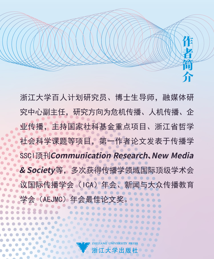 纪盈如 浙江大学百人计划研究员、博士生导师,融媒体研究中心副主任,研究方向为危机传播、人机传播、企业传播,主持国家社科基金重点项目、浙江省哲学社会科学课题等项目,di一作者论文发表于传播学 SSCI顶刊 Communication Research、New Media & Society等,多次获得传播学领域国际ding级学术会议国际传播学会(ICA)年会、新闻与大众传播教育学会(AEJMC)年会zui佳论文奖。