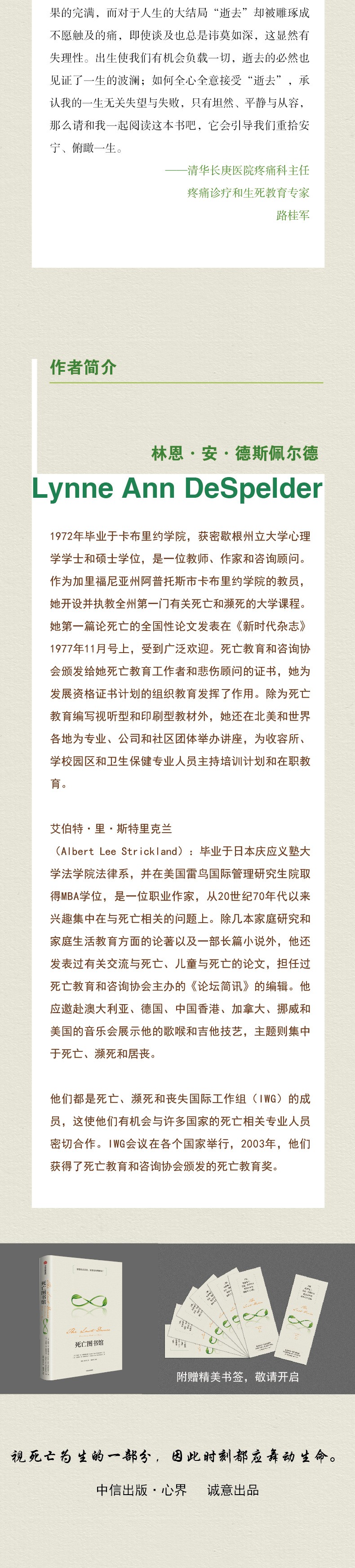 艾伯特·里·斯特里克兰,第二作者艾伯特·李·斯特里克兰是一位职业作家,从上世纪70年代以来兴趣集中在与死亡相关的问题上。除几本家庭研究和家庭生活教育方面的论著以及一部长篇小说外,他还发表过有关交流与死亡、儿童与死亡的论文,担任过死亡教育和咨询协会主办的《论坛简讯》的编辑。他应邀赴澳大利亚、德国、中国香港、加拿大、挪威和美国的音乐会展示他的歌喉和吉他技艺,主题则集中于死亡、濒死和居丧。