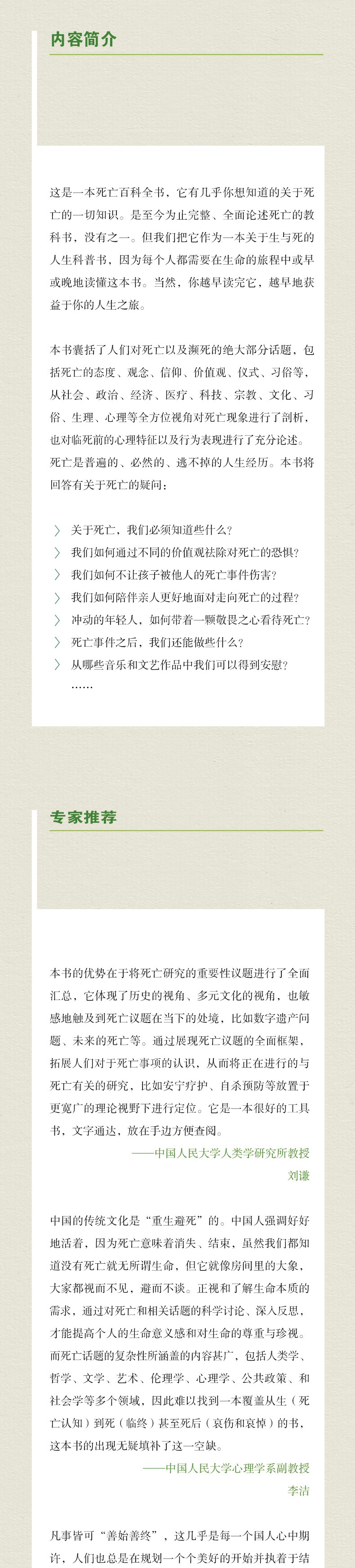 本书的优势在于将死亡研究的重要性议题进行了全面汇总,它体现了历史的视角、多元文化的视角,也敏感地触及到死亡议题在当下的处境,比如数字遗产问题、未来的死亡等。通过展现死亡议题的全面框架,拓展人们对于死亡事项的认识,从而将正在进行的与死亡有关的研究,比如安宁疗护、自杀预防等放置于更宽广的理论视野下进行定位。它是一本很好的工具书,文字通达,放在手边方便查阅。