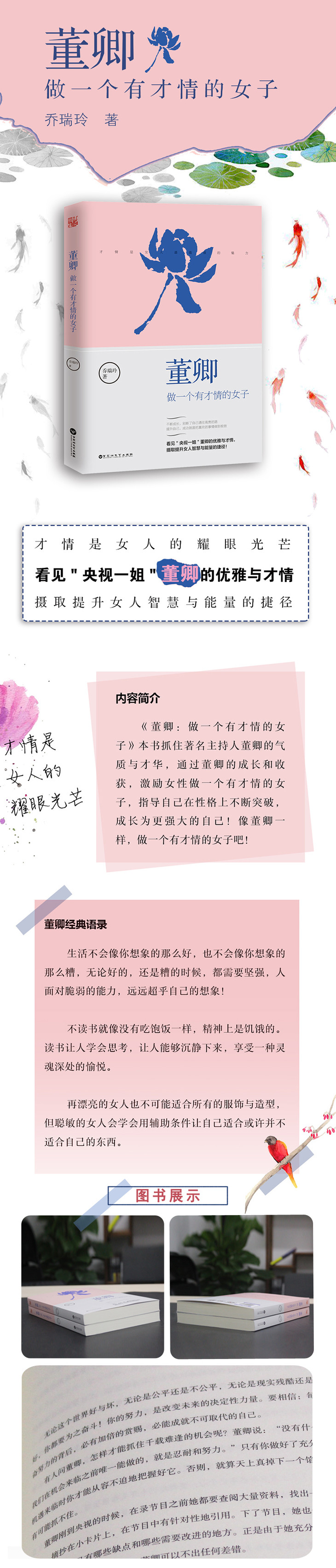 《董卿:做一个有才情的女子》本书抓住著名主持人董卿的气质与才华,通过董卿的成长和收获,激励女性做一个有才情的女子,指导自己在性格上不断突破,成长为更强大的自己!像董卿一样,做一个有才情的女子吧!