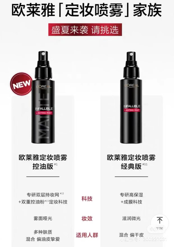 👑欧莱雅定妆喷雾—#经典版/#哑光版 👍夏日定妆神器,断货爆款 🔥能够帮助持妆锁色,长效定妆,同时十分轻盈☄,水润控油光,高保湿不卡粉💦。 ⚡️超细腻广角喷雾,轻柔水雾感,成膜也很快,清爽不黏腻。 🍃长效持妆,16H,把妆焊在脸上