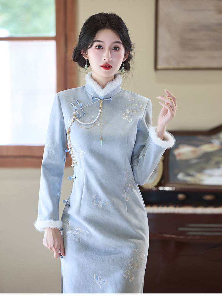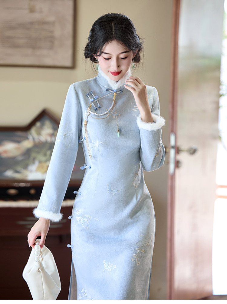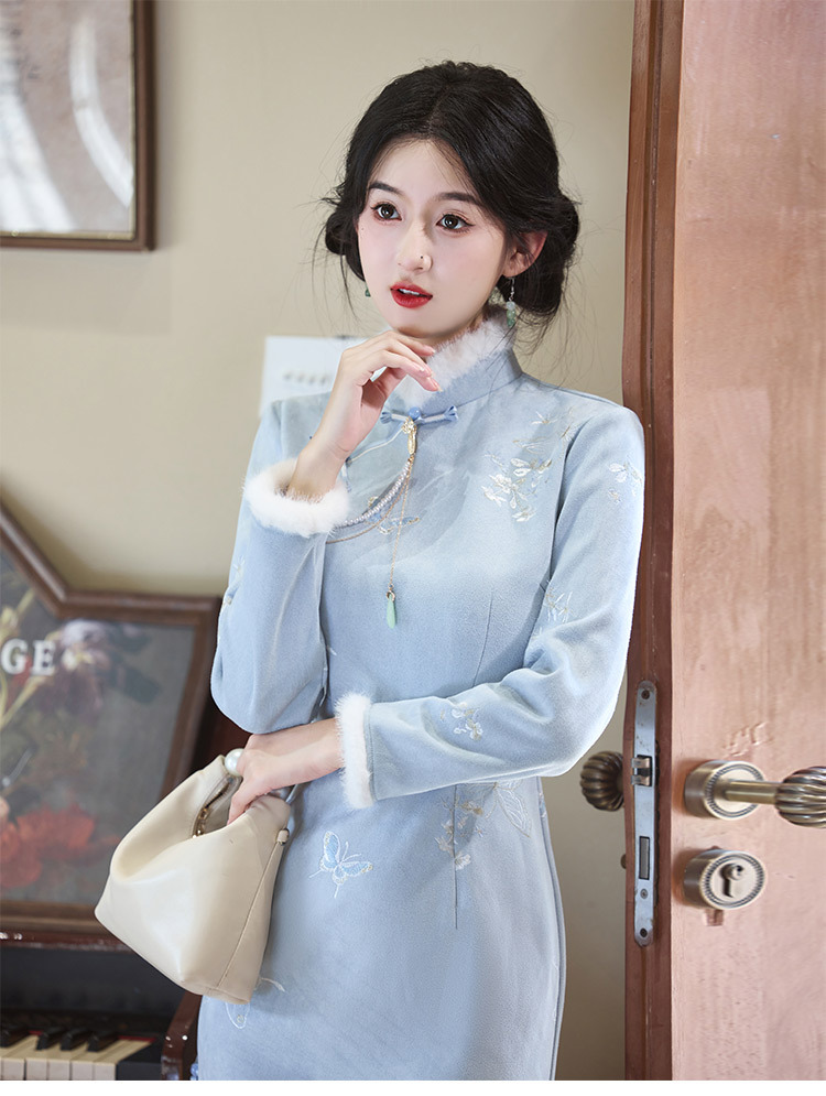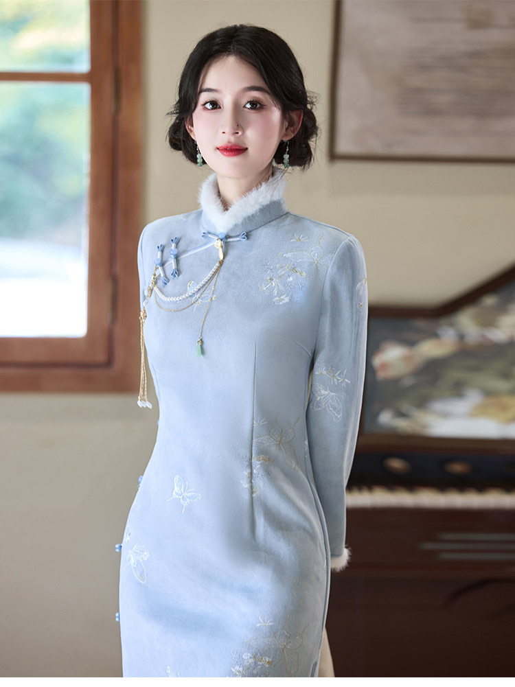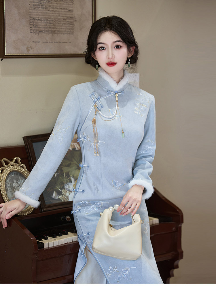 蓝色刺绣加绒加厚冬装国风改良旗袍年轻款 SC22380