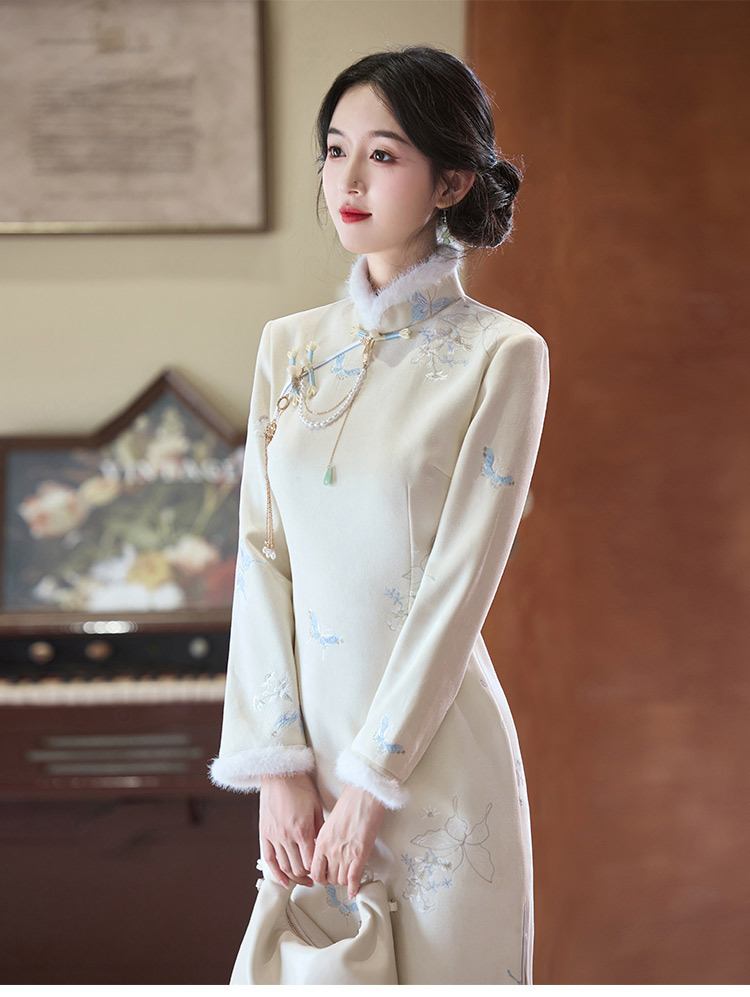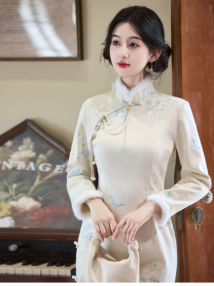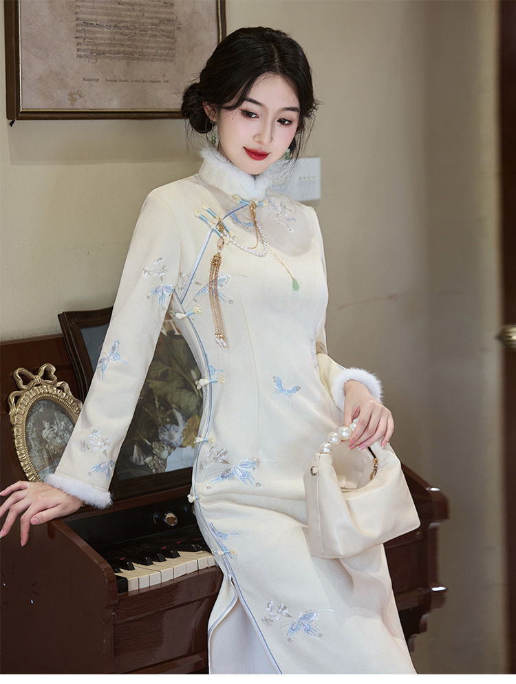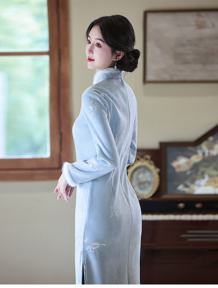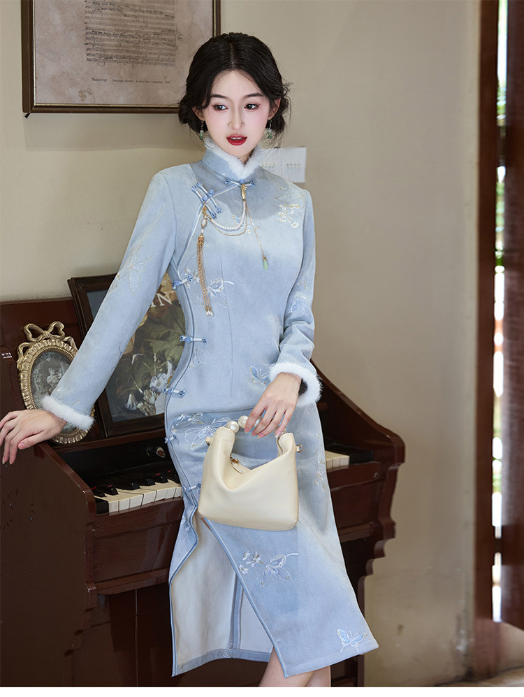 蓝色刺绣加绒加厚冬装国风改良旗袍年轻款 SC22380