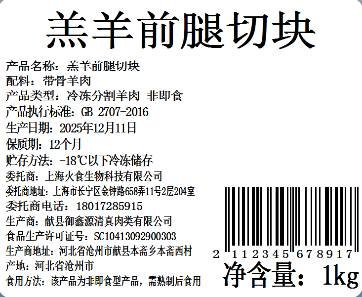 【顺丰发货】HOOORSH 羔羊前腿切块 1kg/袋 精选黄金月龄羔羊 2:1 肥瘦比 肉嫩汁足 精切免处理 液氮极速锁鲜