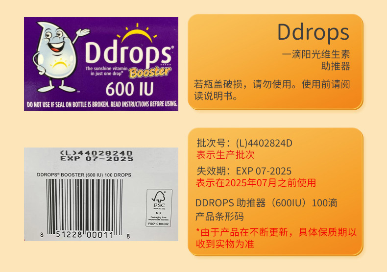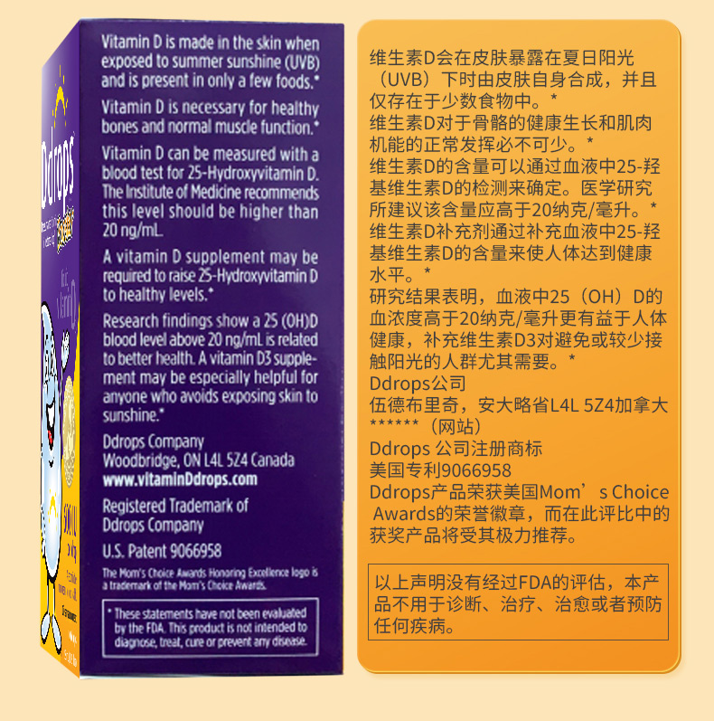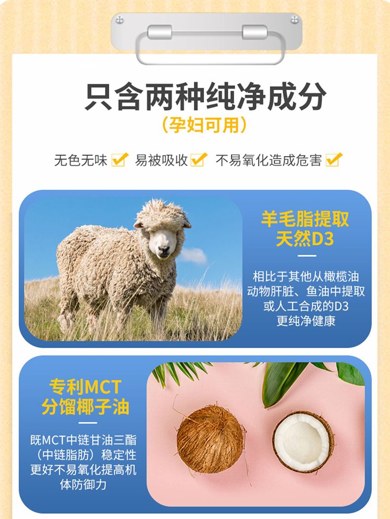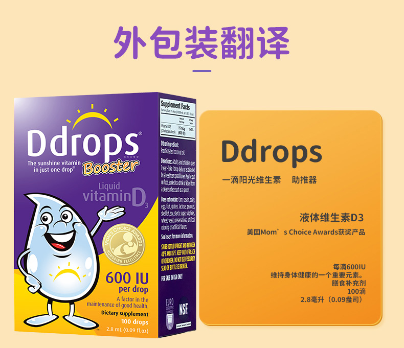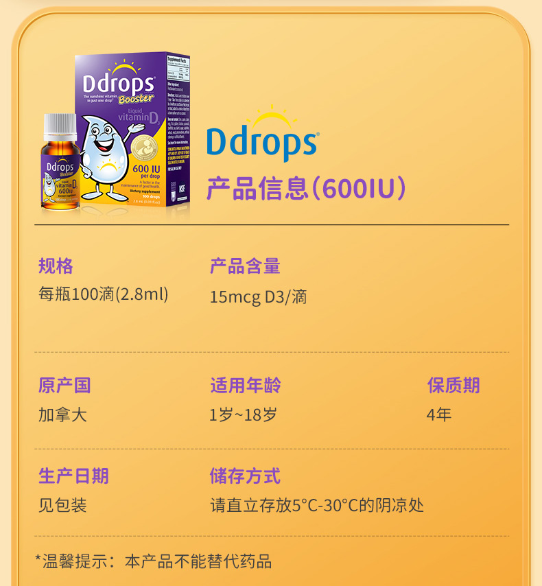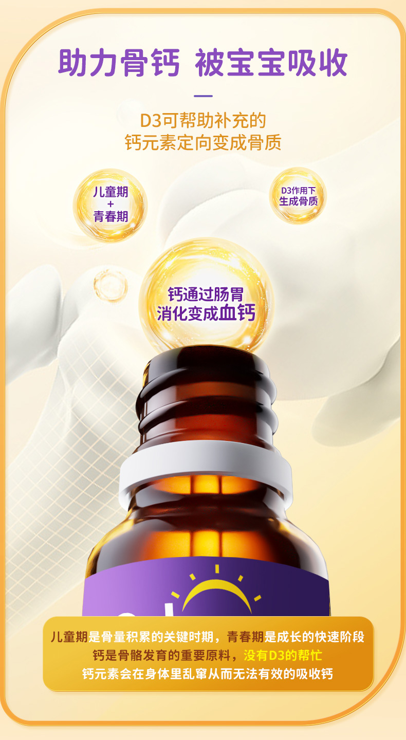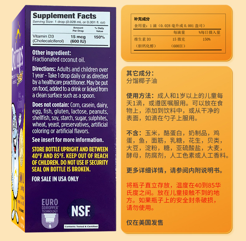 每滴含有:600个国际单位的维生素D3。