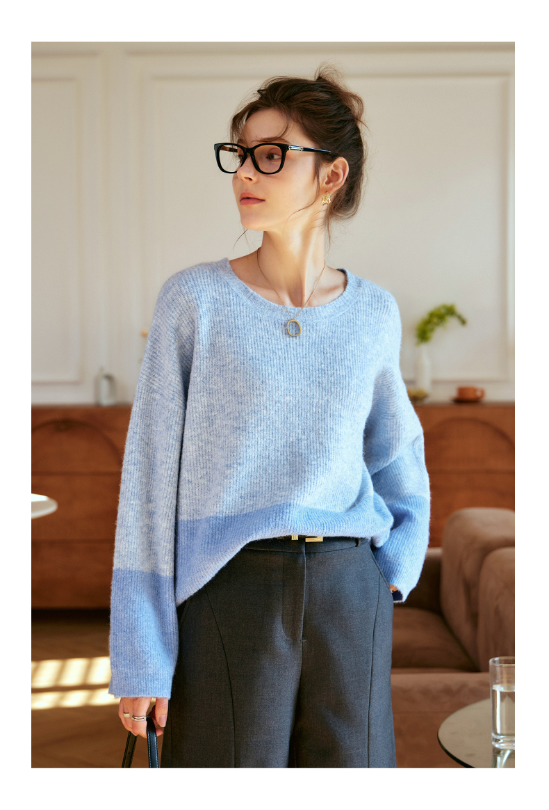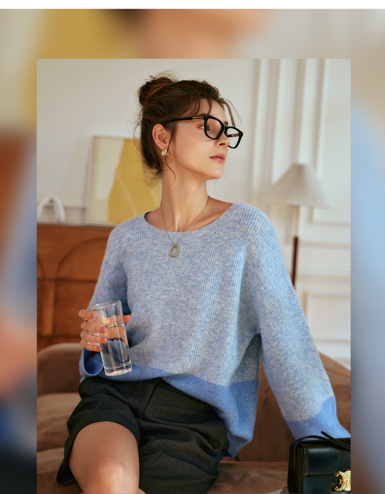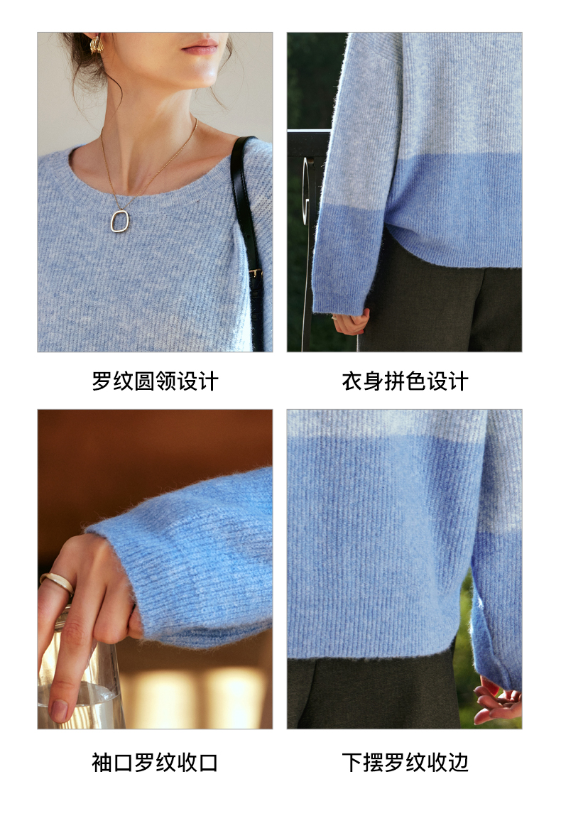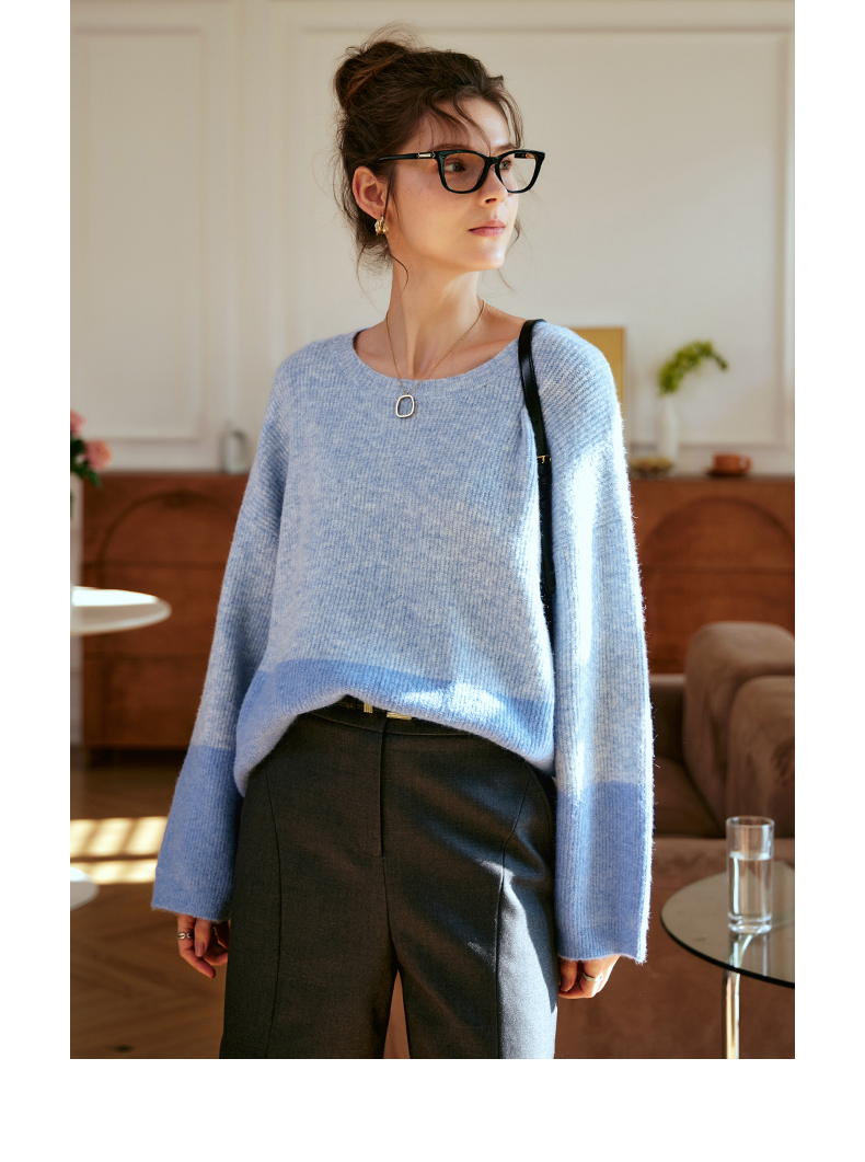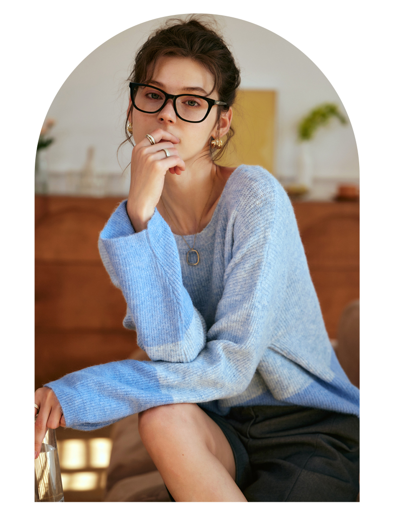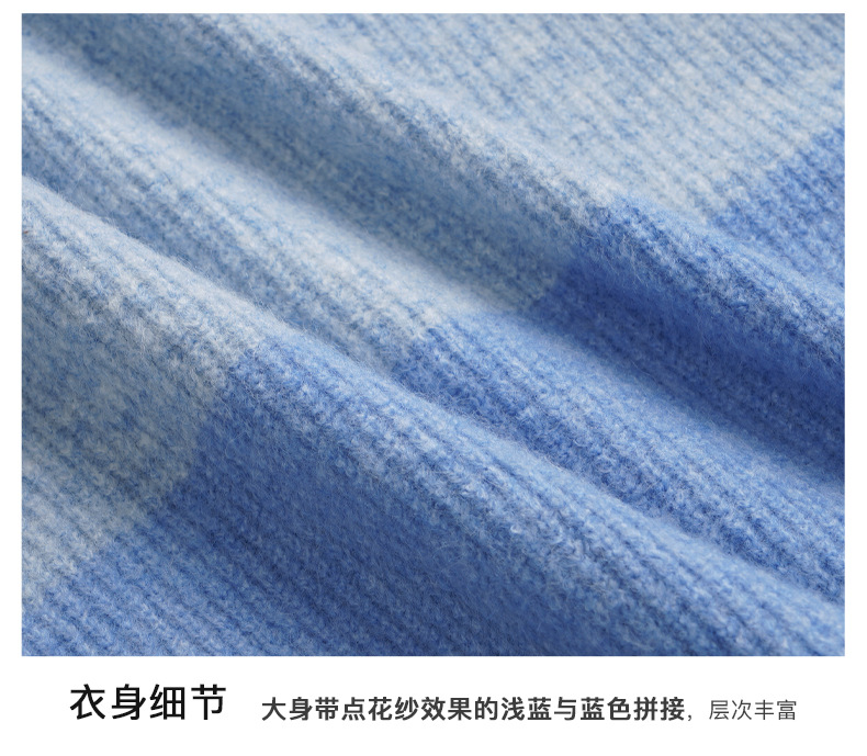 OLrain欧芮儿蓝色针织衫女秋冬2023年新款别致宽松慵懒风毛衣