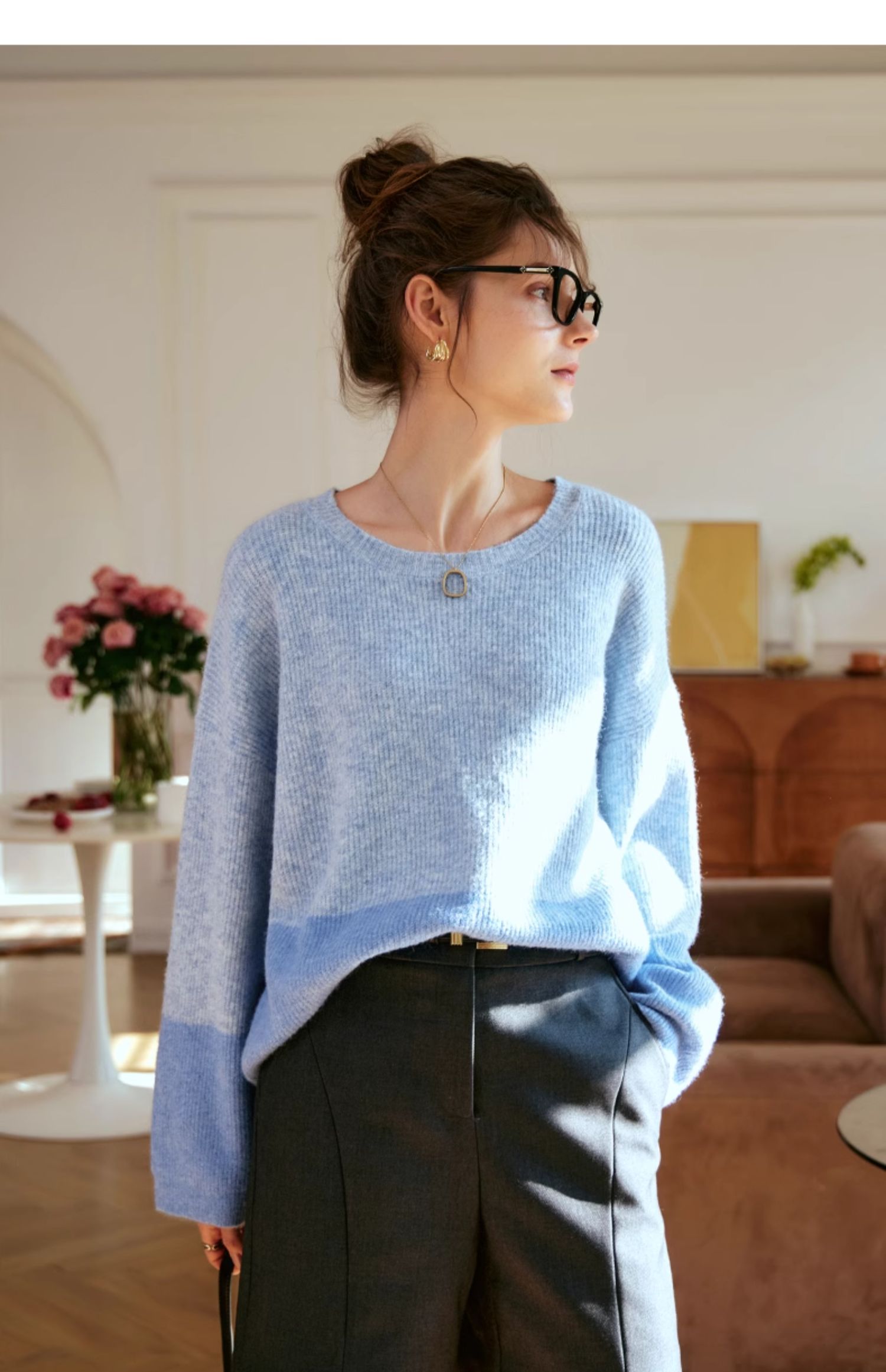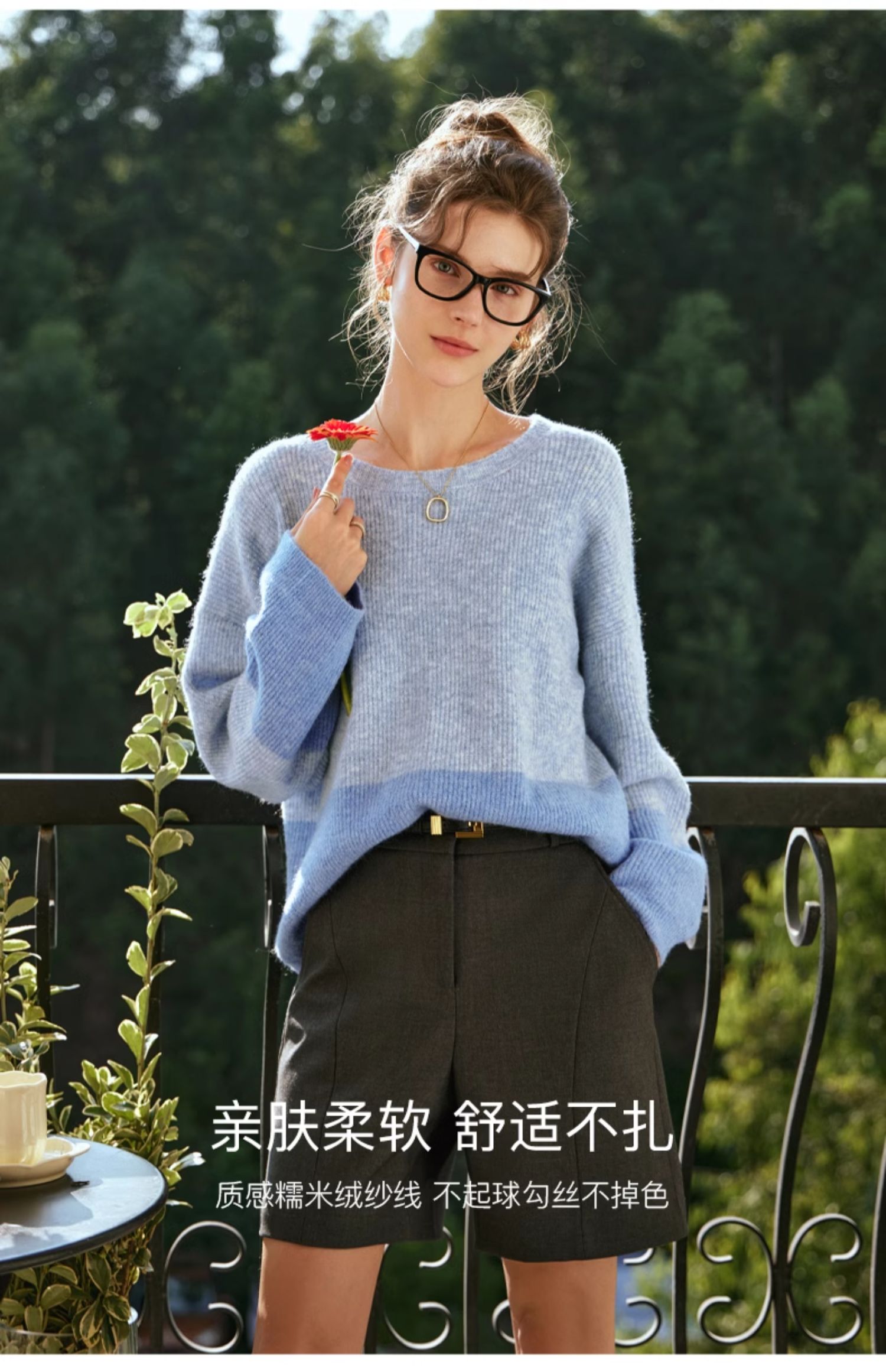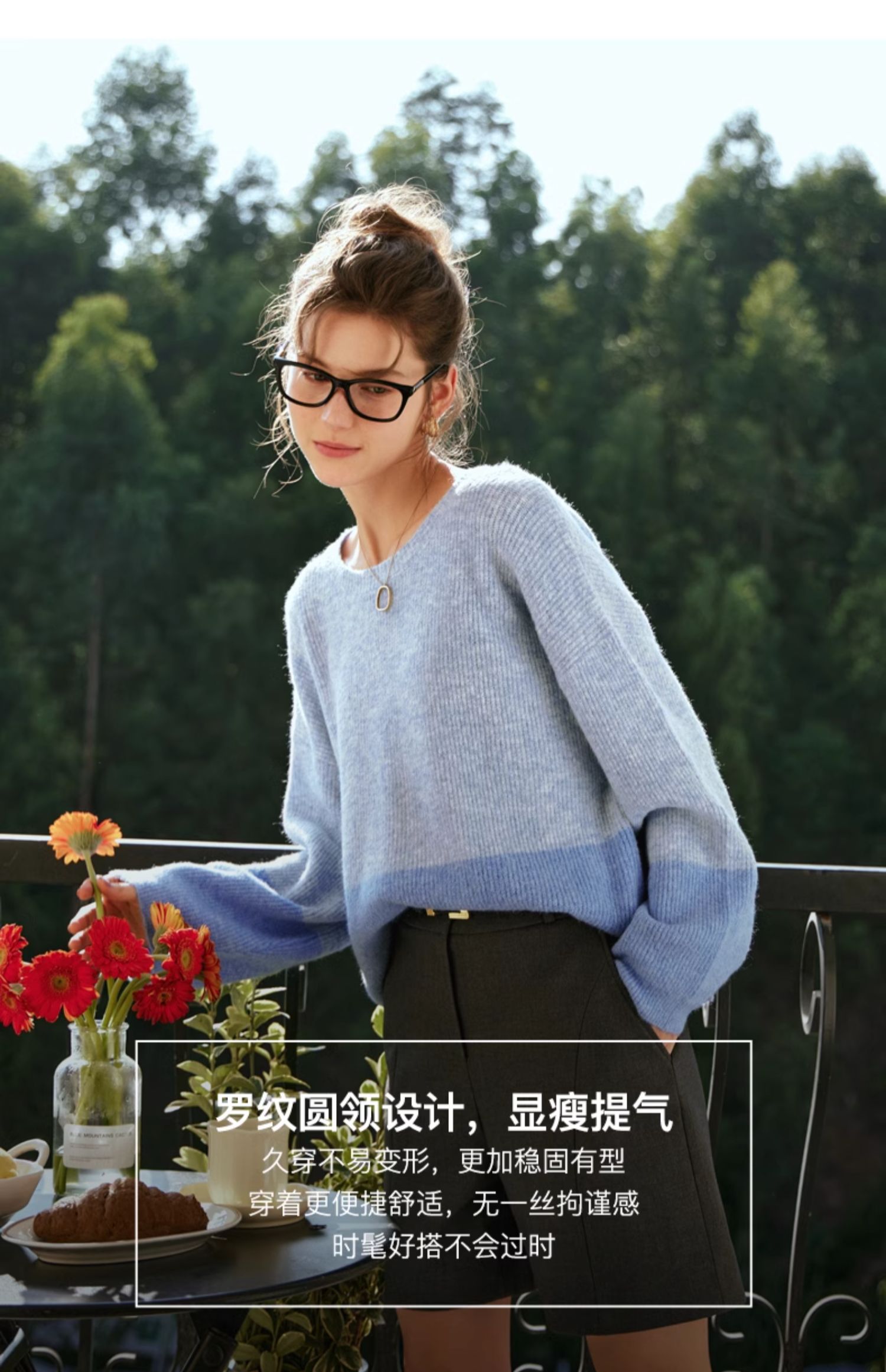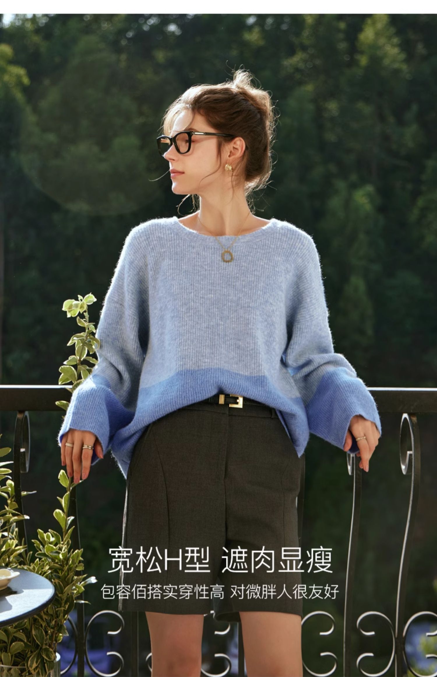 OLrain欧芮儿蓝色针织衫女秋冬2023年新款别致宽松慵懒风毛衣