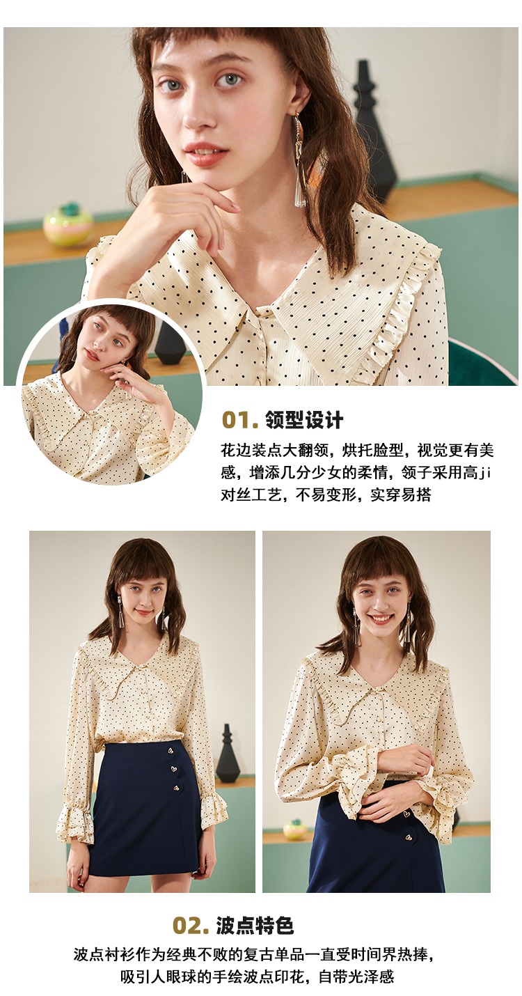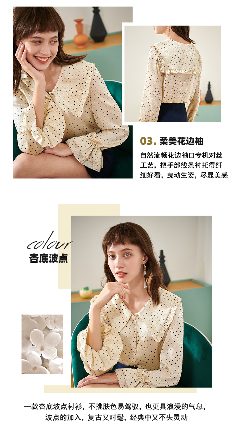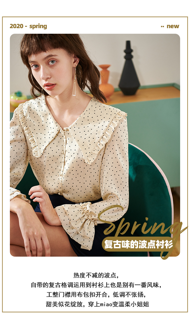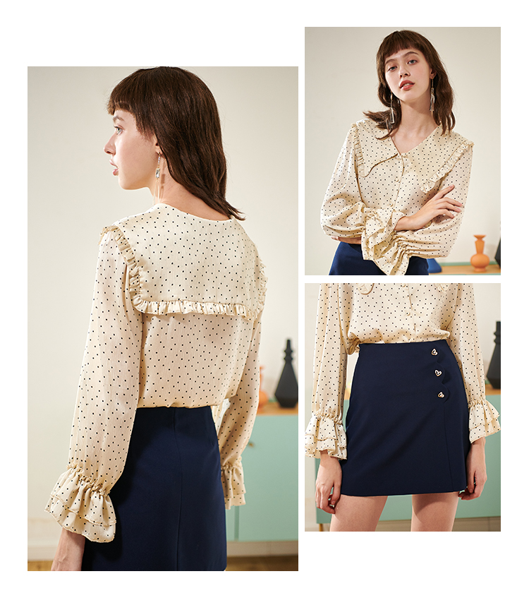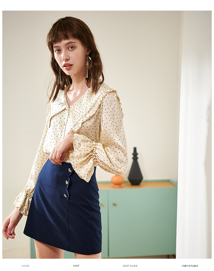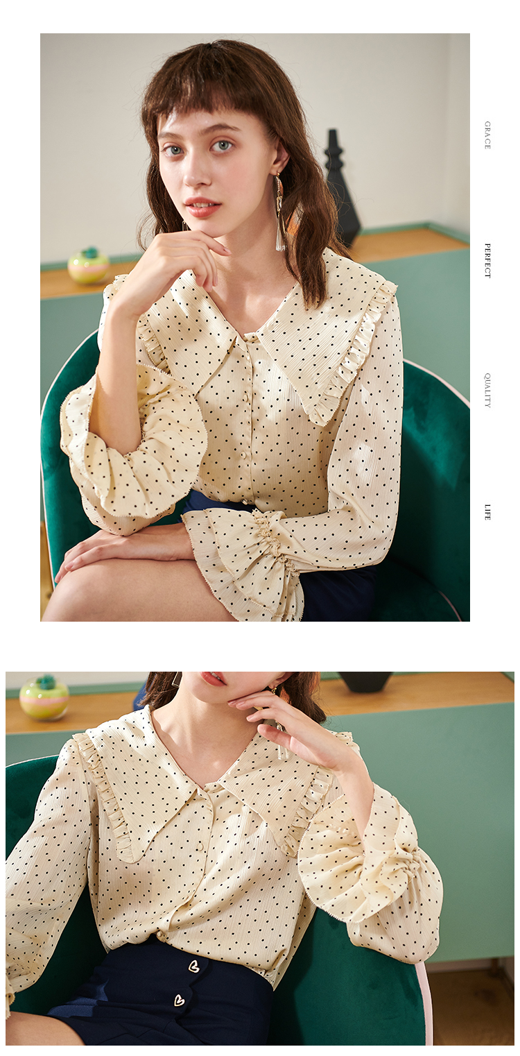欧芮儿春新款喇叭袖V领波点雪纺衬衫女木耳边内搭休闲上衣