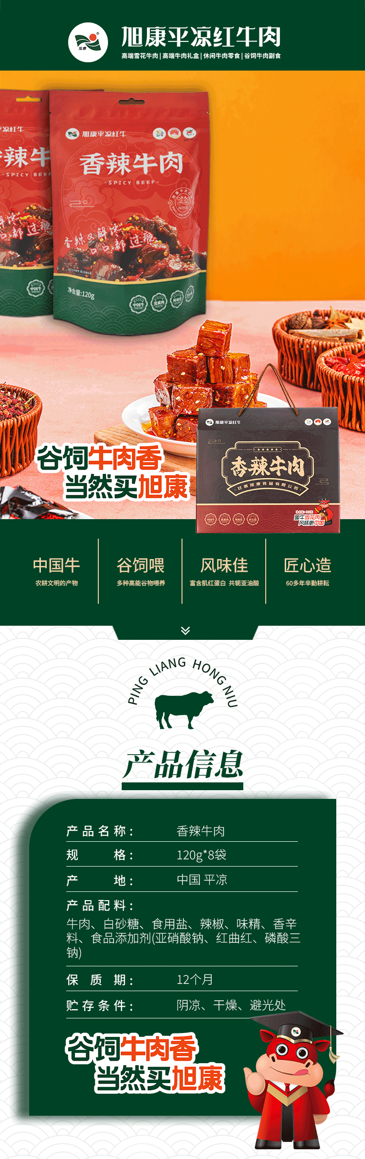 【平凉红牛泾川馆】旭康真空熟食香辣牛肉礼盒装120g*8袋包邮