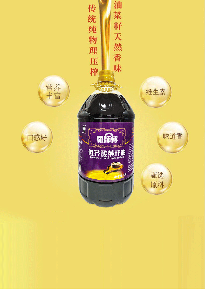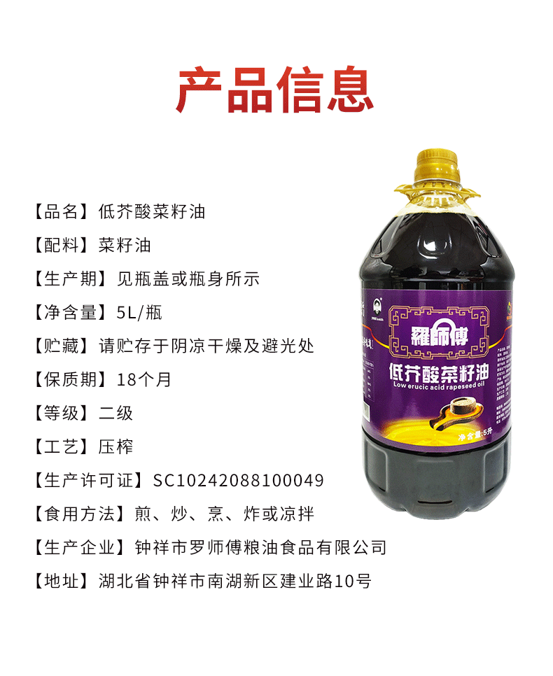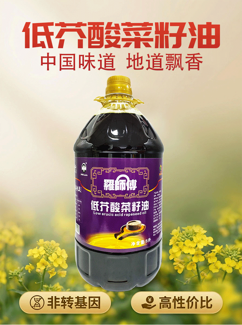 【严选】荆楚好粮油 非转基因双低油菜籽二级压榨罗师傅低芥酸菜籽油5L(厂家直发)