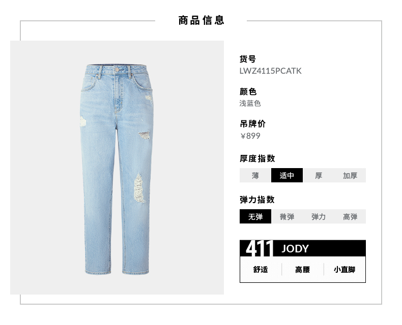 Lee都市骑士411舒适浅蓝男友酷女九分牛仔裤LWZ4115PCATK