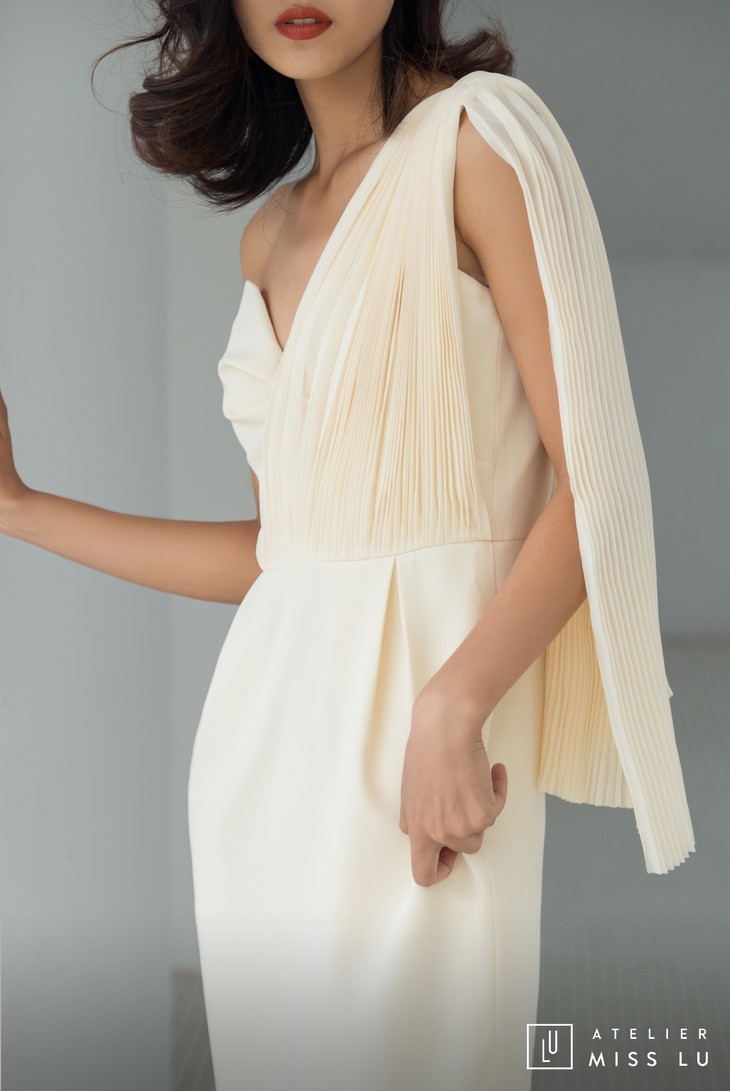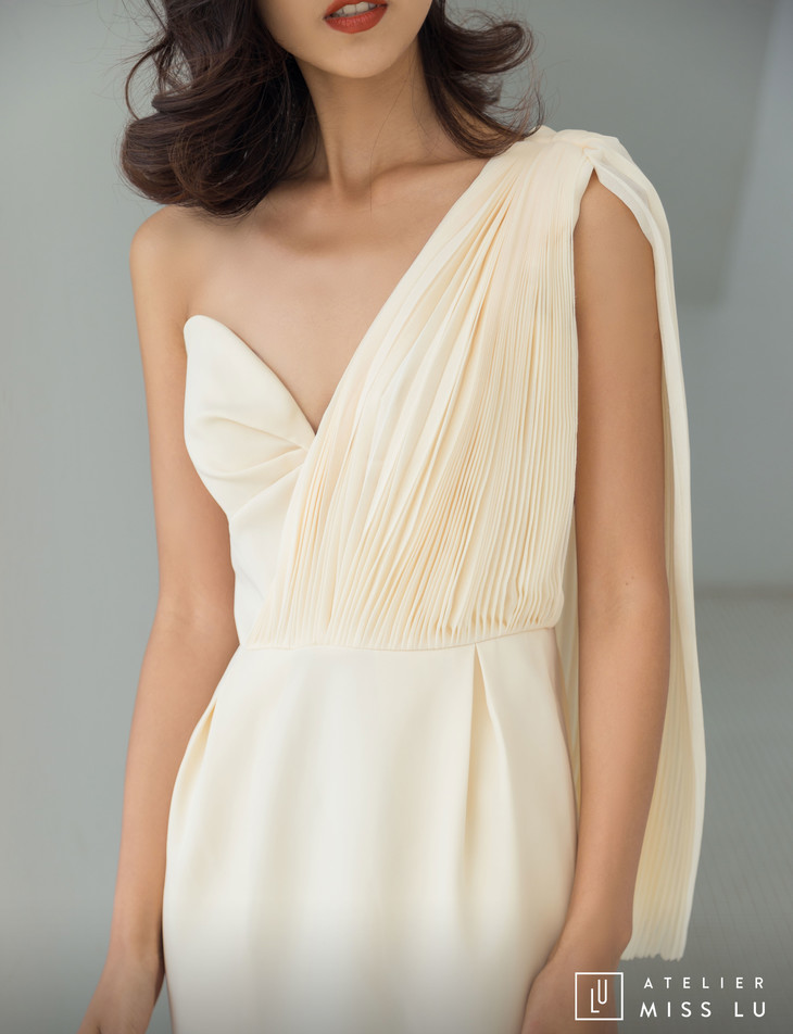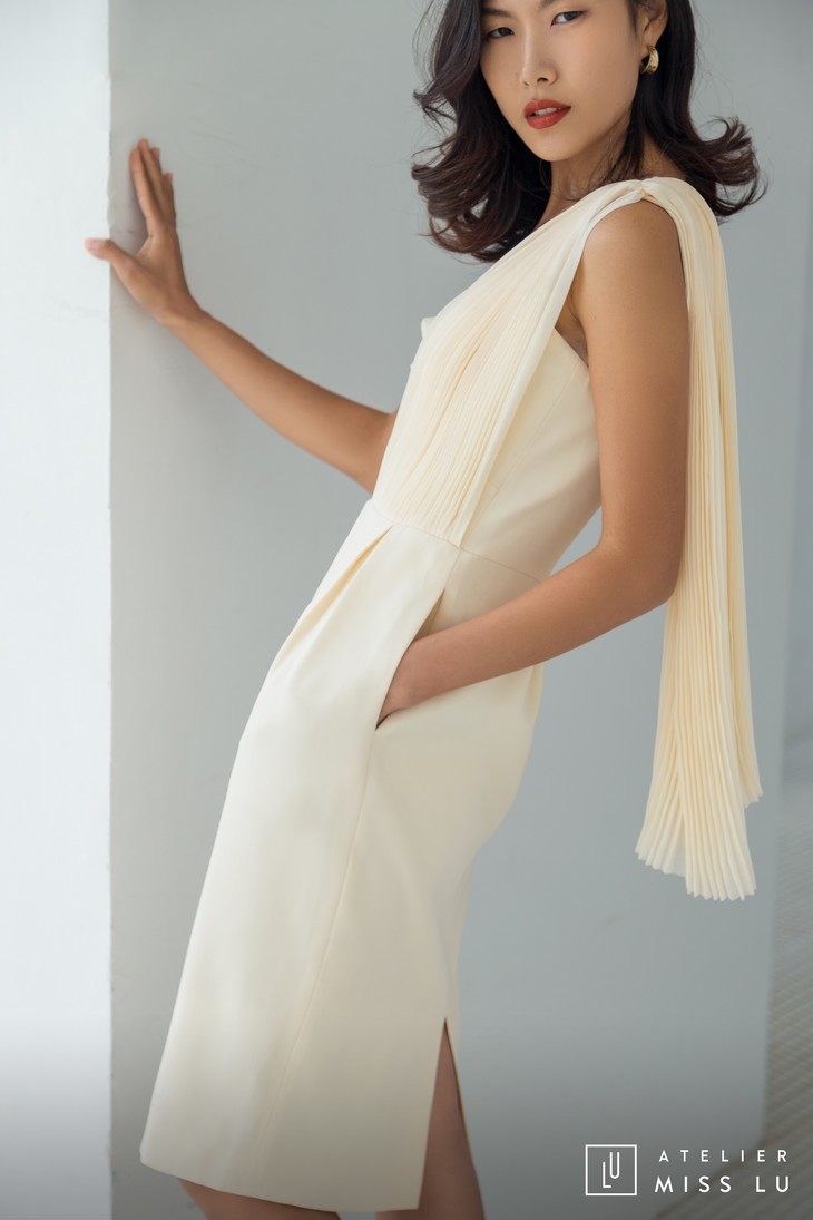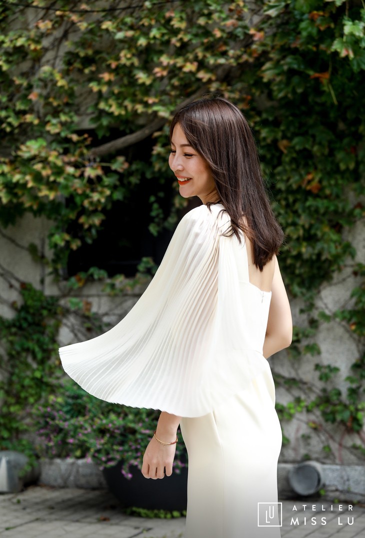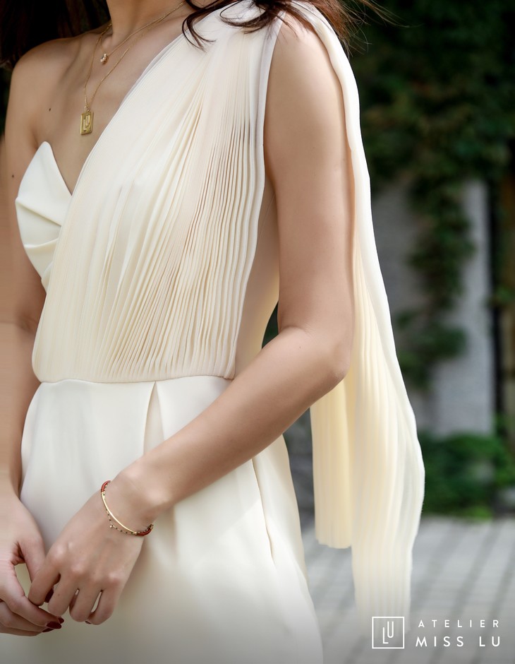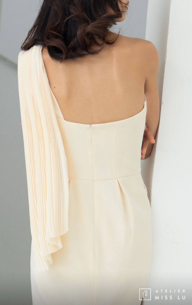 AtelierMissLu / Sinead-白色单肩风琴褶飘带连身裙