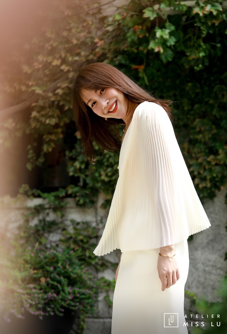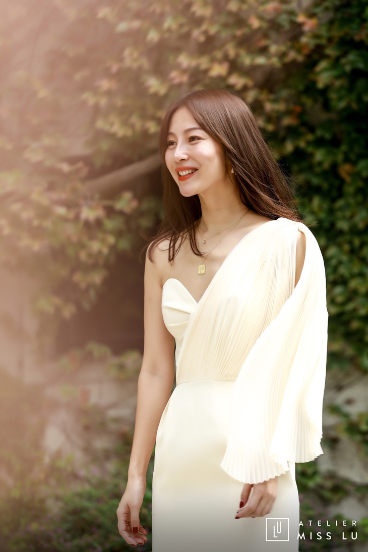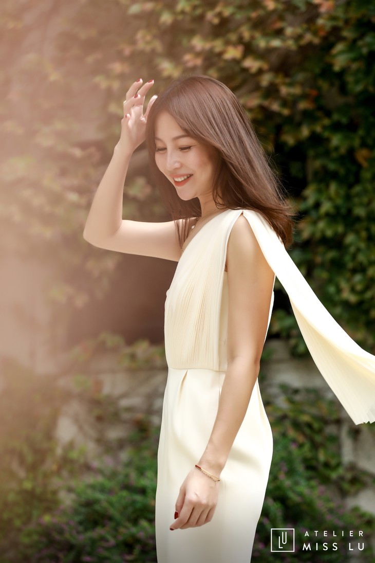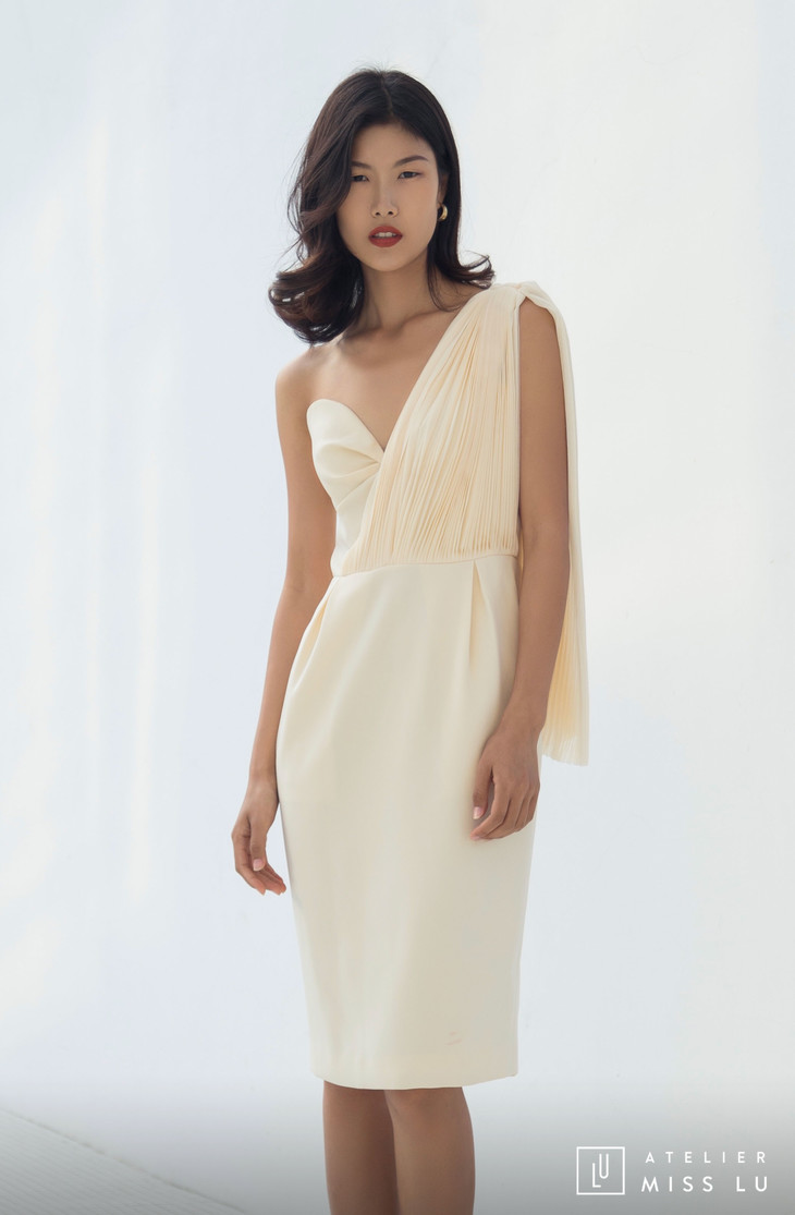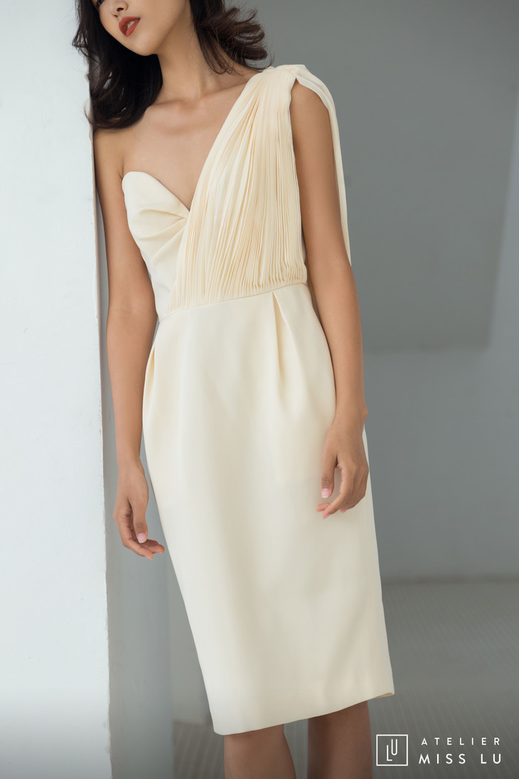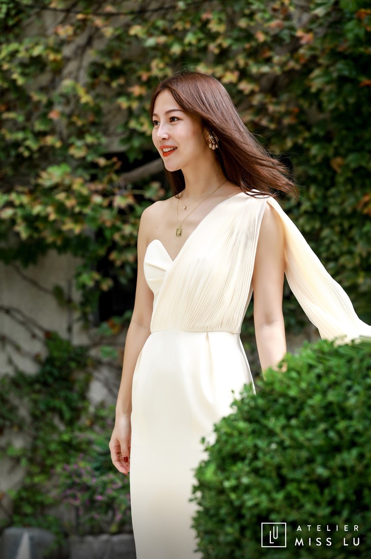 AtelierMissLu / Sinead-白色单肩风琴褶飘带连身裙
