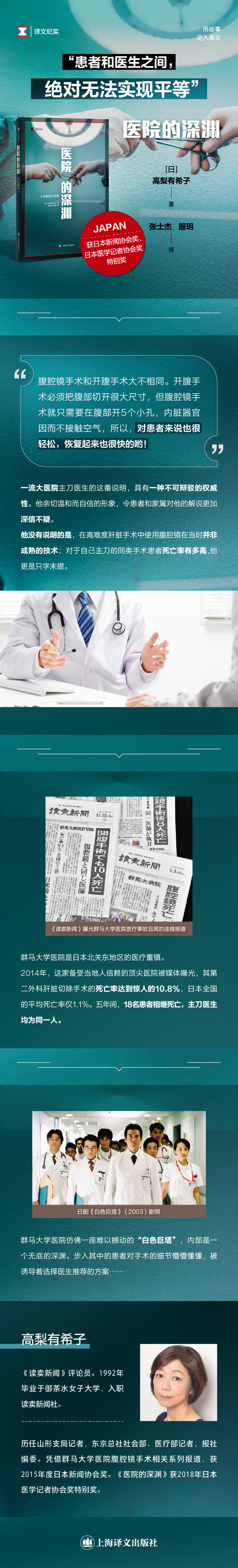 “腹腔镜手术和开腹手术大不相同。开腹手术必须把腹部切开很大尺寸,但腹腔镜手术就只需要在腹部开5个小孔,内脏器官因而不接触空气,所以,对患者来说也很轻松,恢复起来也很快的哟!” 一流大医院主刀医生的这番说明,具有一种不可辩驳的权威性。他亲切温和而自信的形象,令患者和家属对他的解说更加深信不疑。 这名主刀医生没有说明的是,在高难度肝脏手术中使用腹腔镜在当时并非成熟的技术,其风险与业已广泛采用的腹腔镜胆囊切除术无法相提并论;对于自己所在科室同类手术的患者死亡率有多高,他更是只字未提。 《医院的深渊》所记录的群马大学医院医疗丑闻,暴露出的是整个日本医疗界普遍存在的问题:单纯追求个人技术创新而漠视患者利益的伦理和制度的双重缺位。医生是高度专业化的职业,医患之间永远无法实现绝对的信息对称。如何保护处于弱势的患者的权利?群马大学医院事件的曝光和发酵在一定程度上推动了制度改革,在完善医疗安全管理制度和保护病患知情同意权等问题上做出新的尝试……