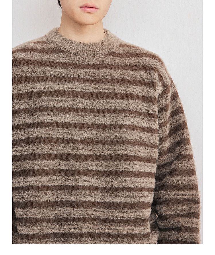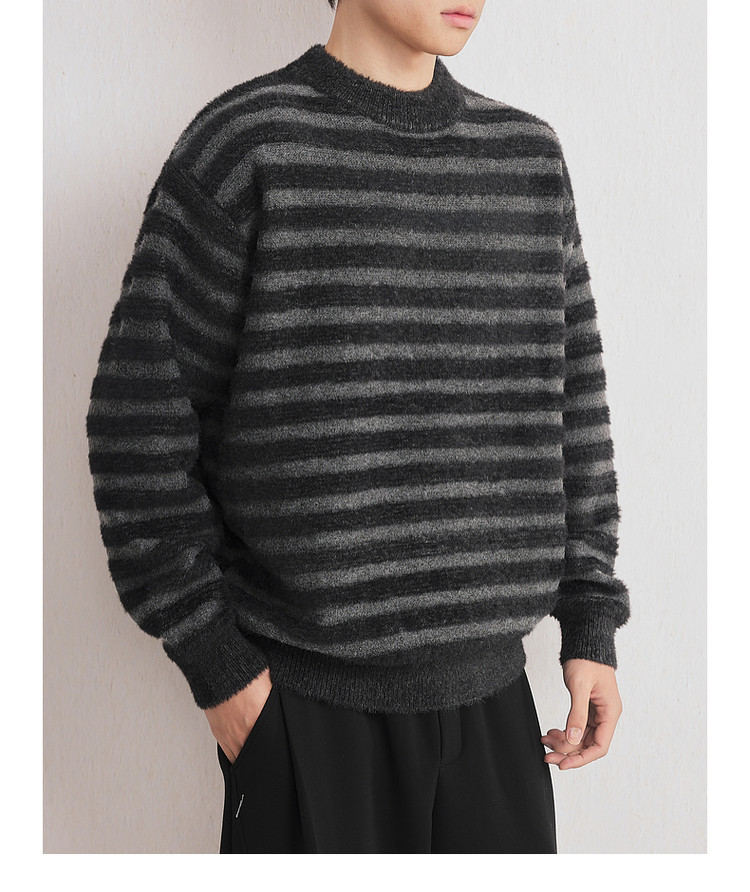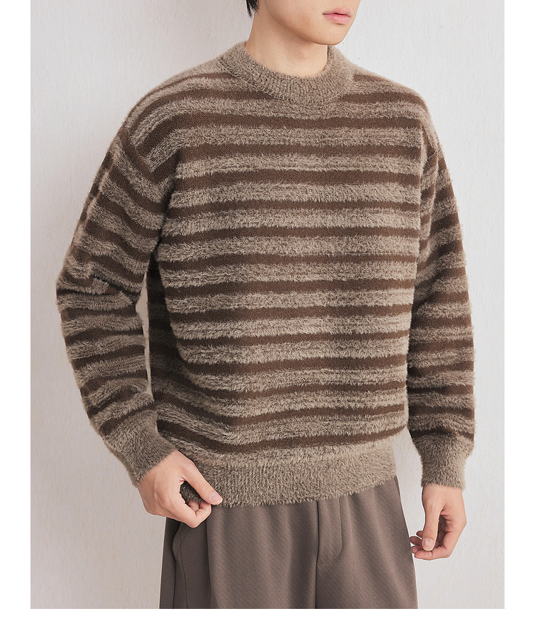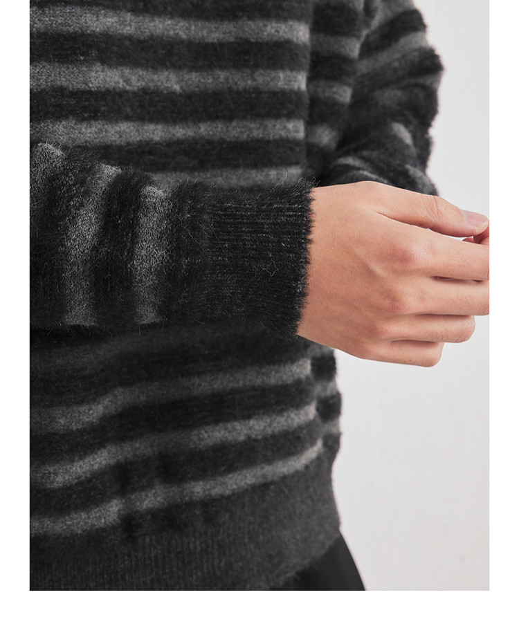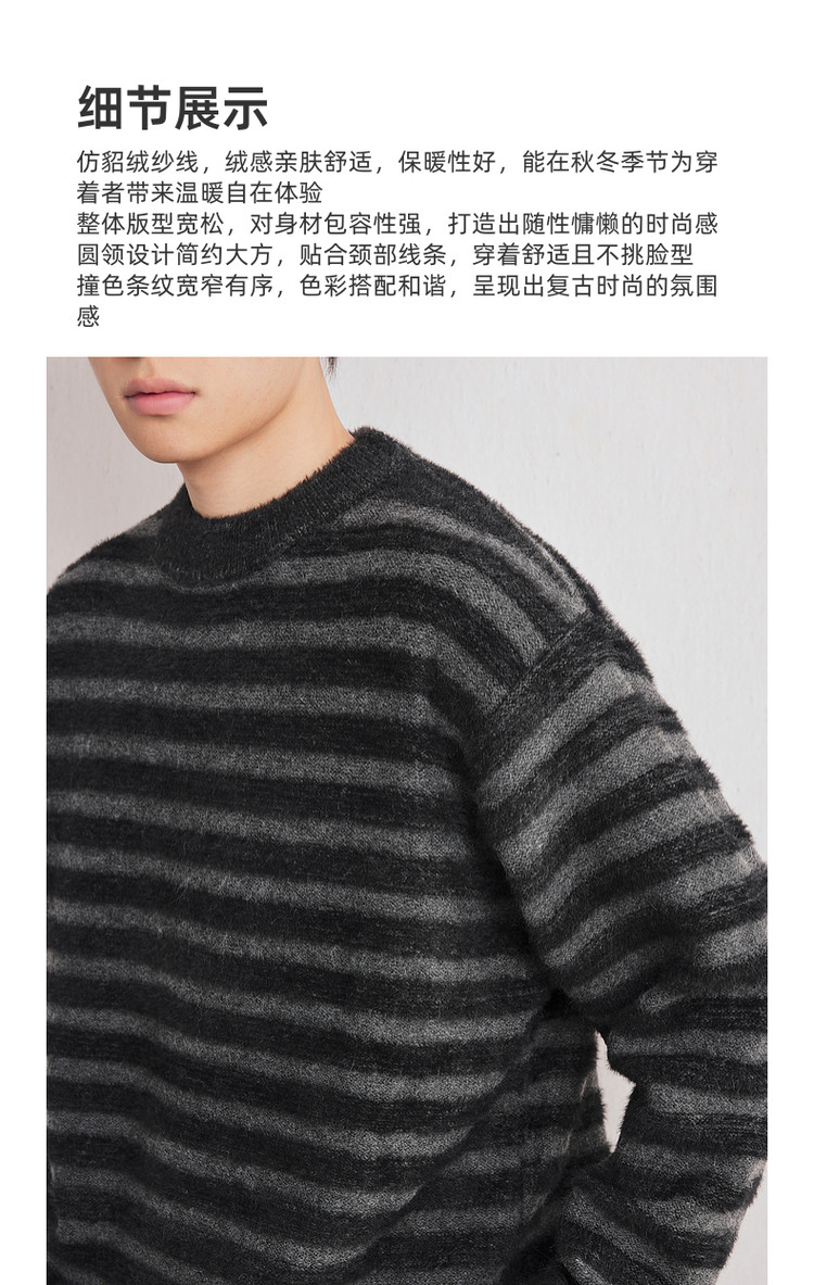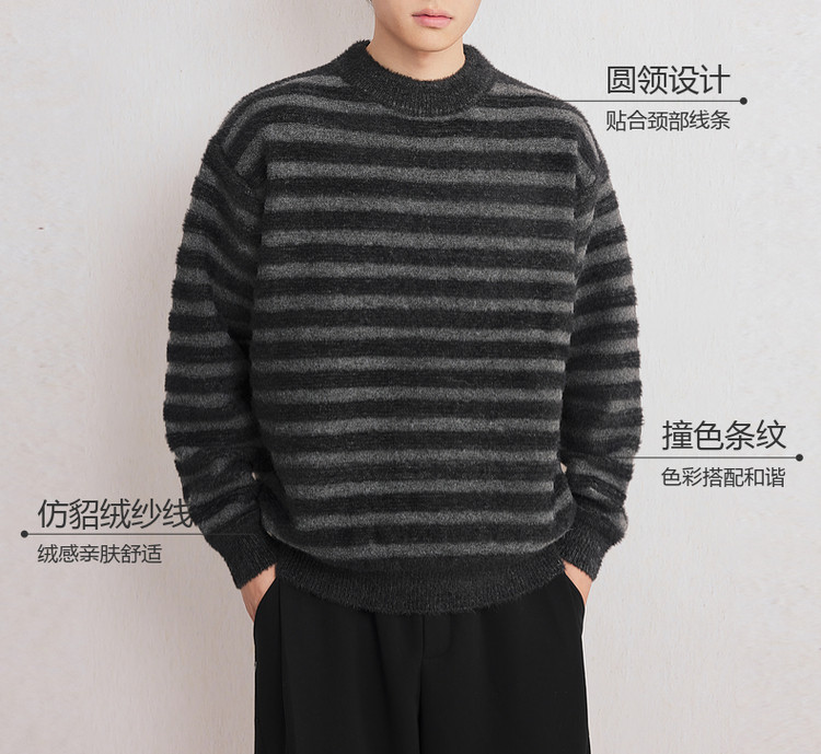 墨麦客男装2025年冬季仿貂绒圆领条纹针织衫男士套头绒感打底衫男