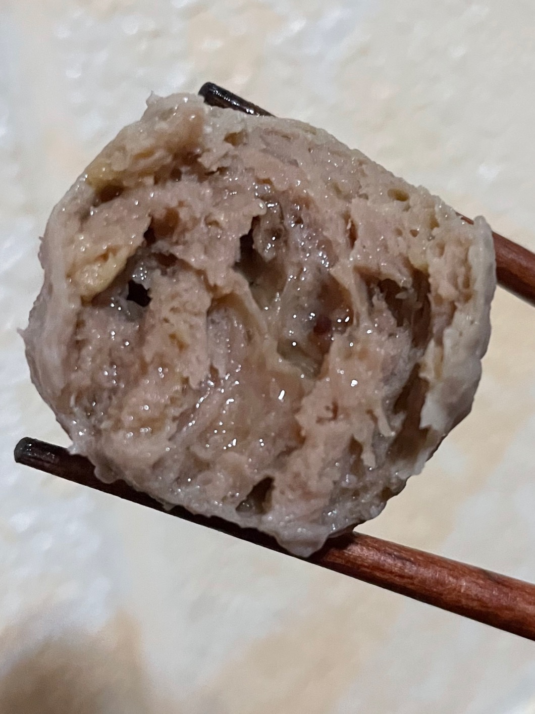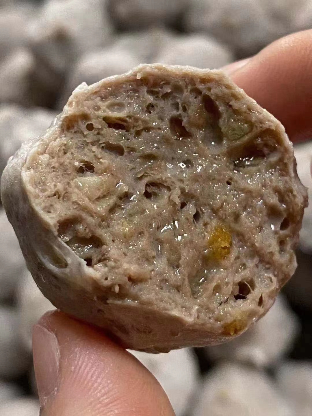 ②外地牛肉或水牛鲜肉,由于纤维度差一些,无添加的情况下,做出来的牛肉丸口感没那么Q弹爽口。