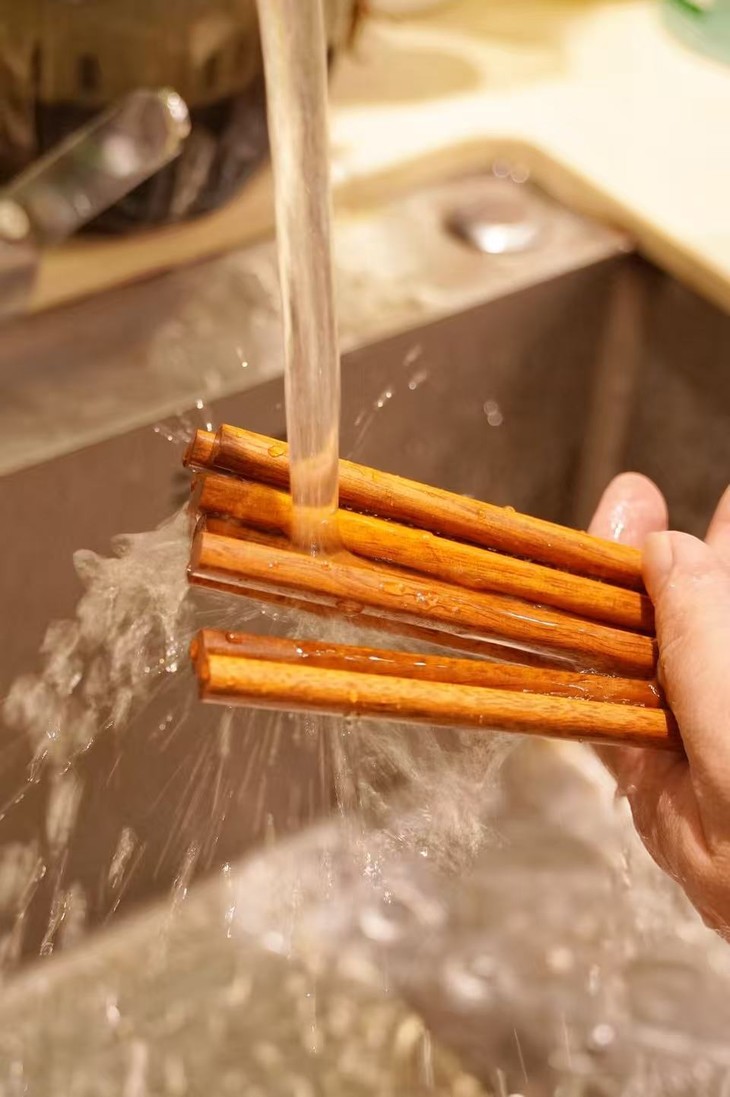 和普通竹筷比 更加坚硬密实,不易变形、耐高温 天然的一体的木纹 每双筷子都是独一无二的花纹 天然油脂形成隔水层 洗后几分钟表面干爽 0渗水0胀裂,杜绝霉斑小黑点 南方梅雨季也能“干”爽在线