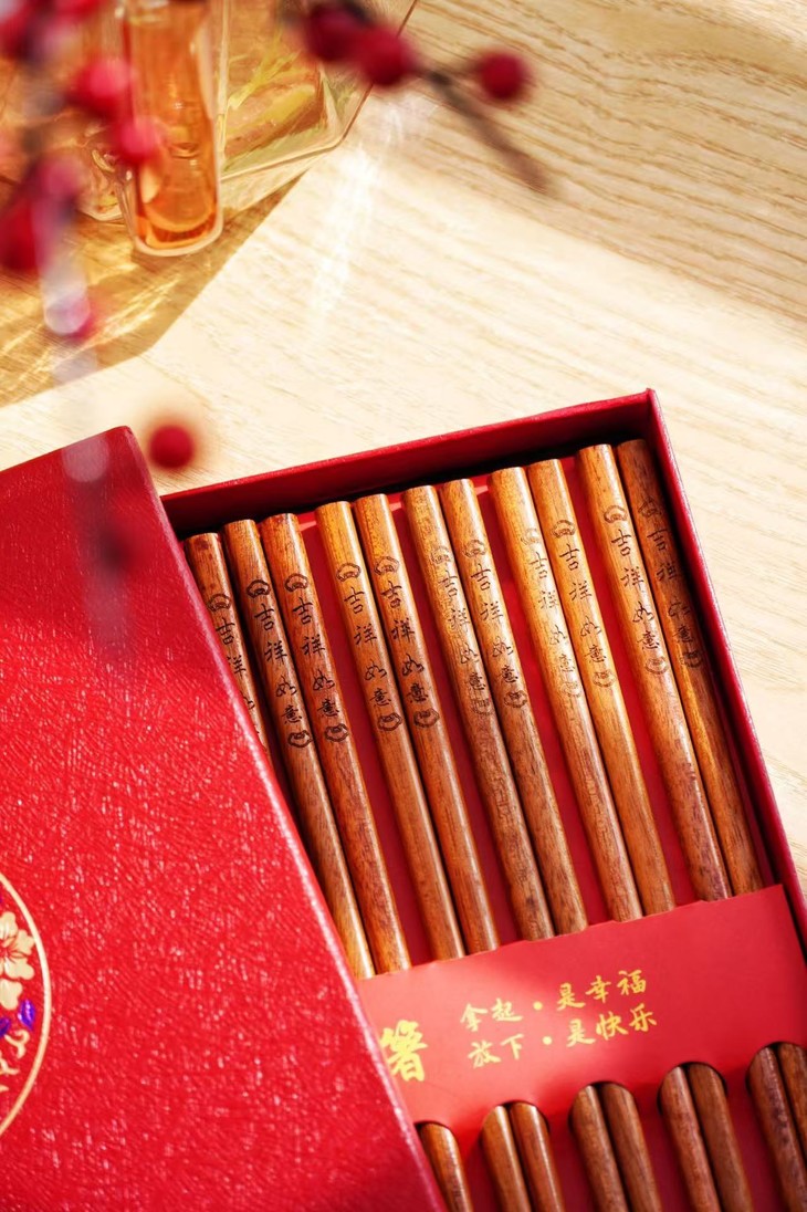 筷尾刻“吉祥如意”字是重彩 一横一划都是祝福的签字,一撇一捺皆藏福运与财运 握在指间是“筷”到福到,摆在礼盒是“金”喜开场 不用多言,一双就已“贵”气外露 让心意和排面,同时上桌