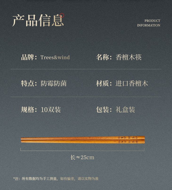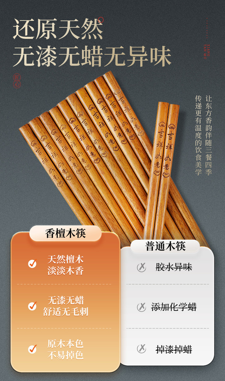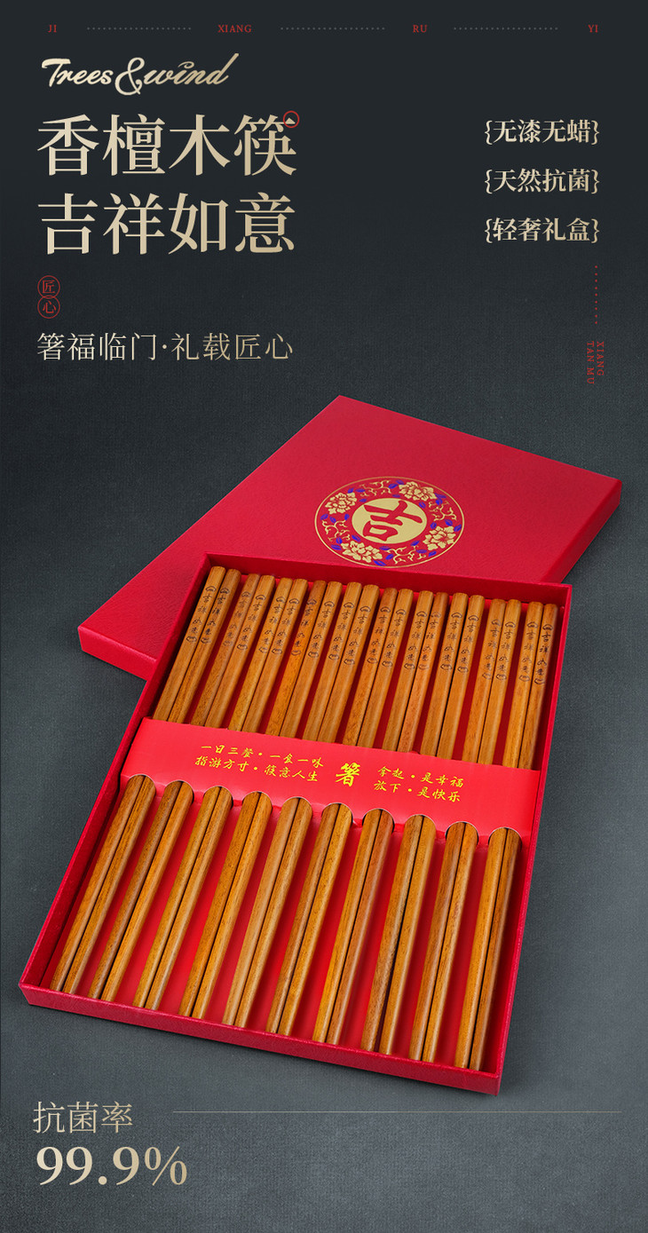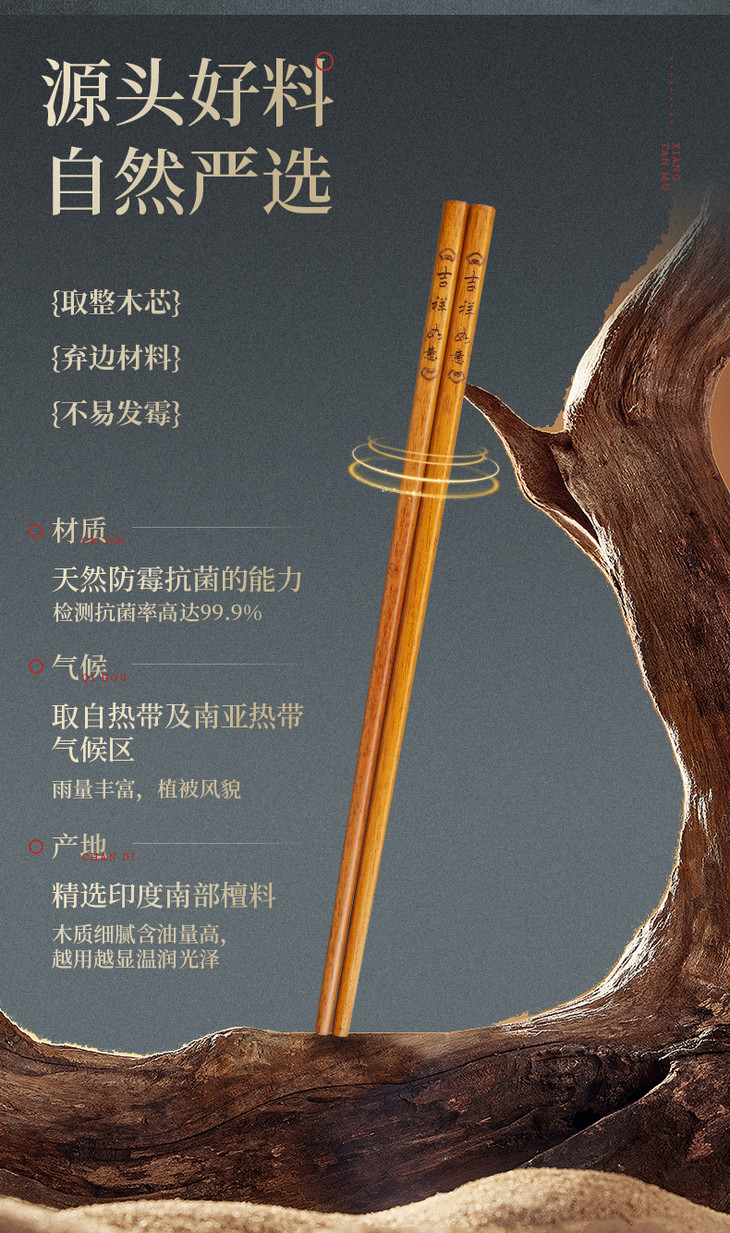一双优秀的筷子,必将有着过人之处 ✅吉祥如意筷的取材,来自印度南部的香檀木 香檀木属于檀木科,号称“木中贵族” 生长极其缓慢,通常要数十年甚至上百年才能成材 集芳香、药用、材用于一身,用途十分广泛 蕞好的香檀木产自于印度,其次是印尼 Trees&wind只做TOP1—— 原材全部采自印度高海拔的香檀木 木质细腻含油量高,越用越显温润光泽 并且自带天然香檀醇,抑菌率高达99.9% 用上几个月都不带发霉的