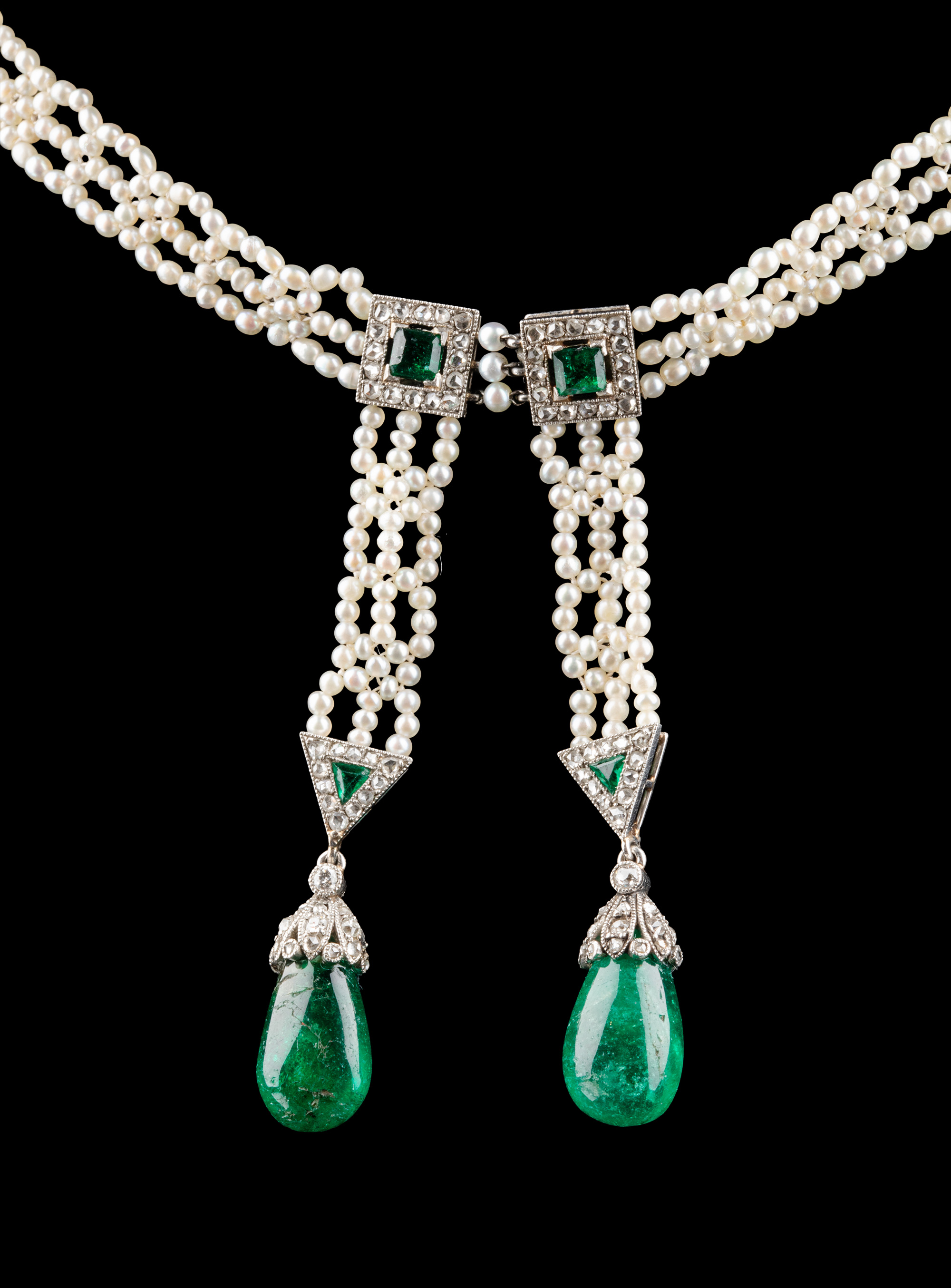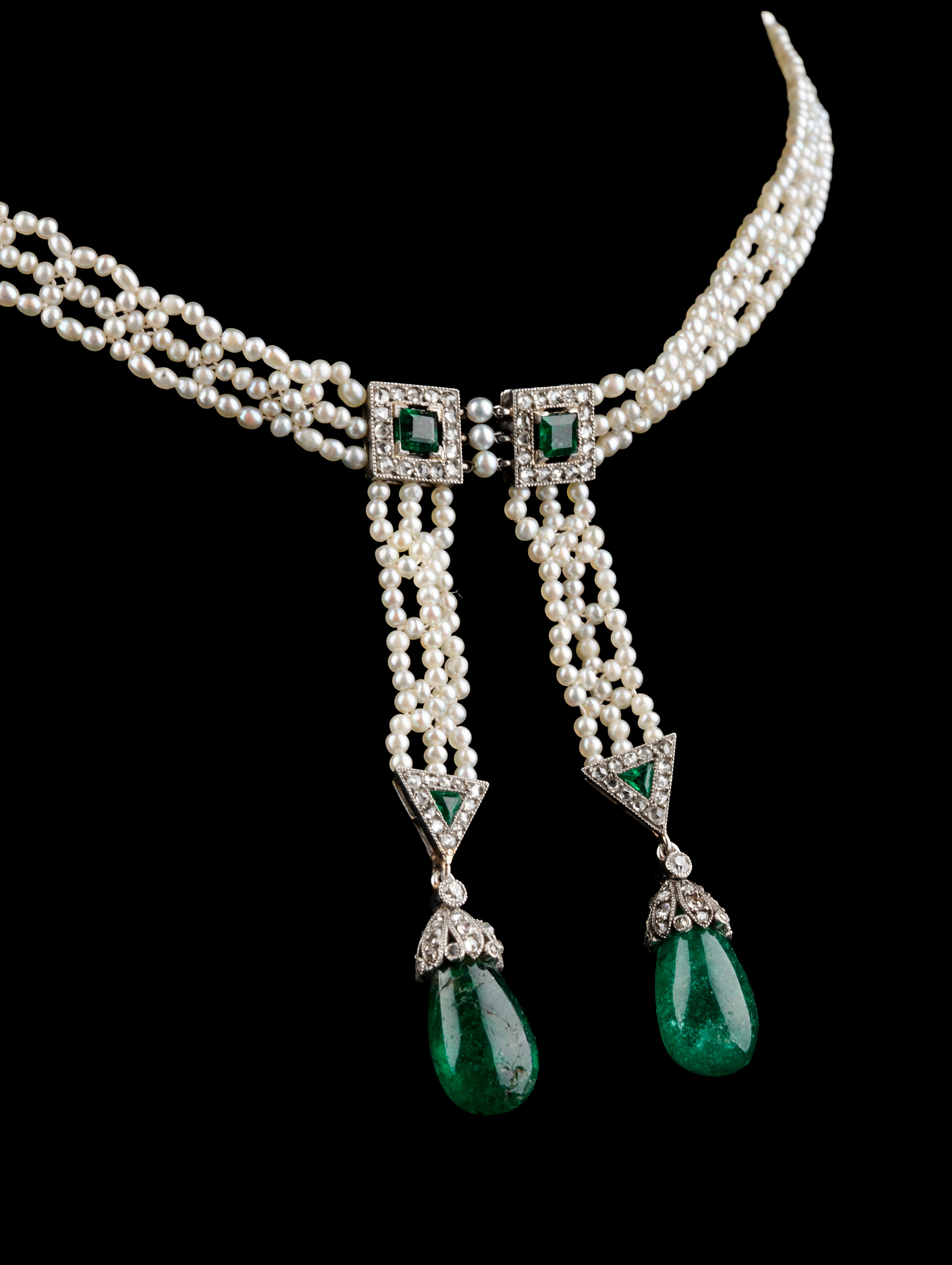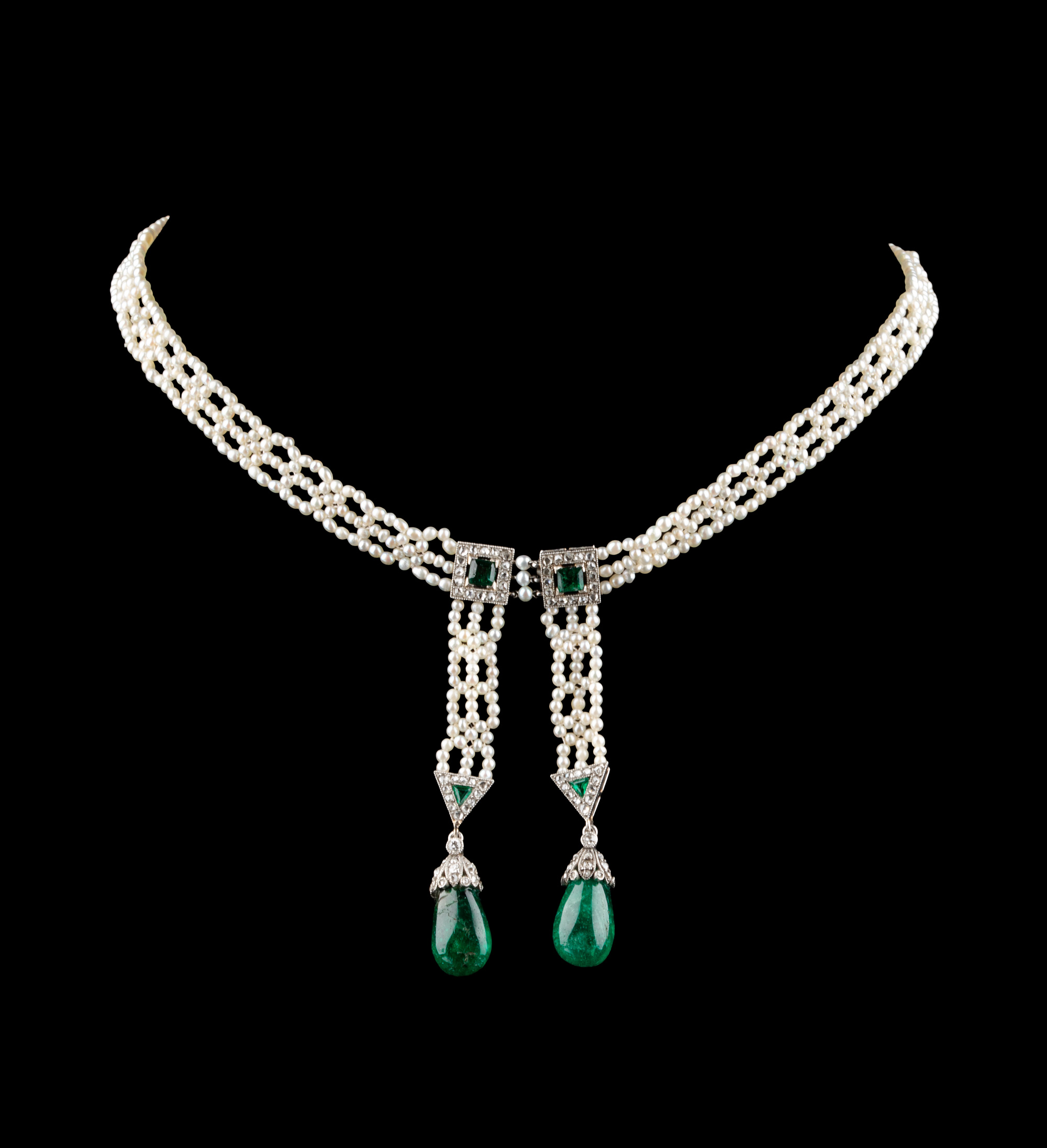 1905年代法国顶级珠宝品牌卡地亚出品18K黄金铂金镶嵌种子珍珠钻石及哥伦比亚祖母绿双穗式吊坠项链