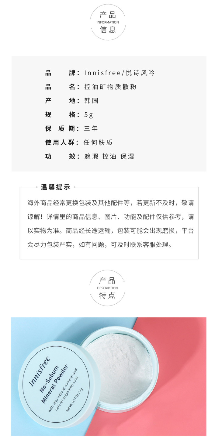 悦诗风吟散粉 新款 控油 透明 适合大油田~ 矿物质遮瑕定妆薄荷蜜粉 5g INNISFREE/innisfree