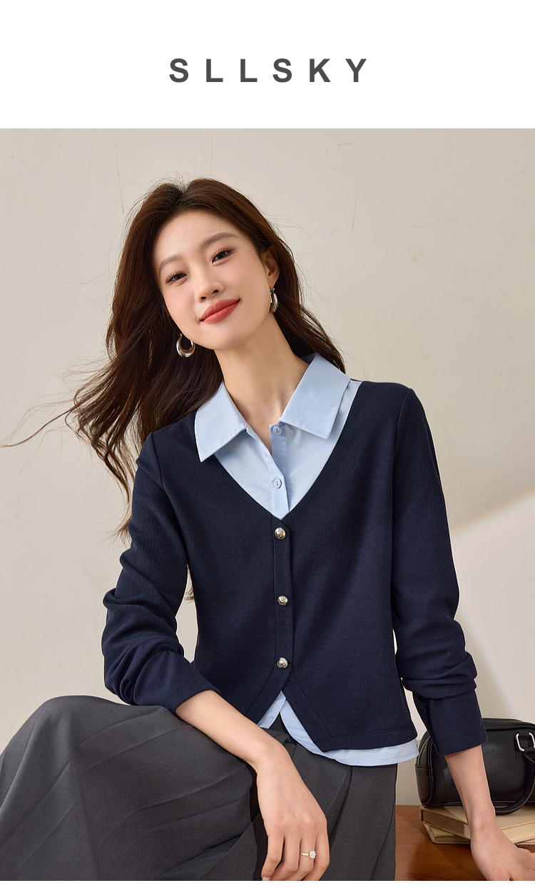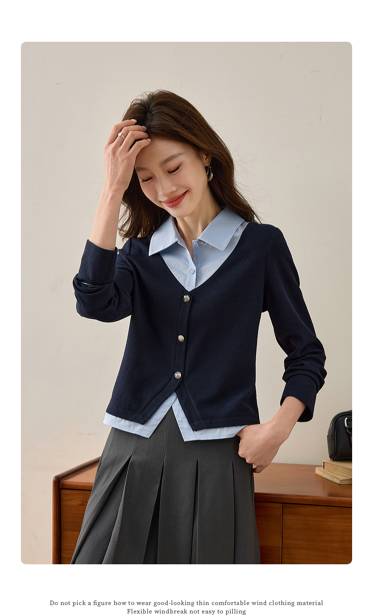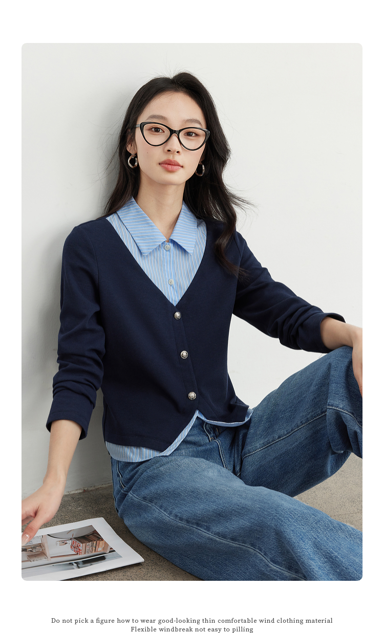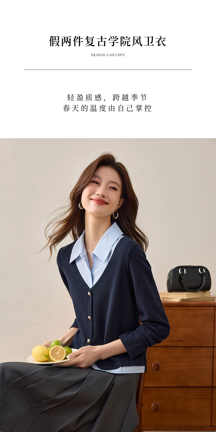 【1件75折】熙世界2025春秋新款复古学院风卫衣女假两件衬衫领拼接针织上衣