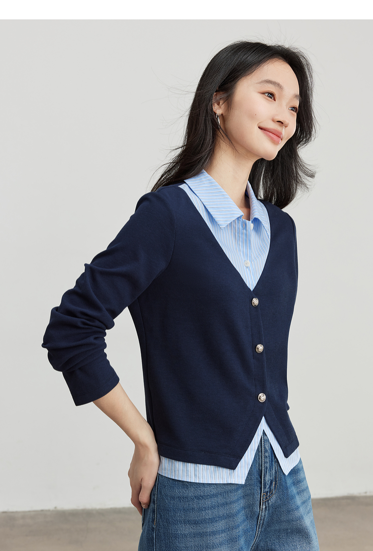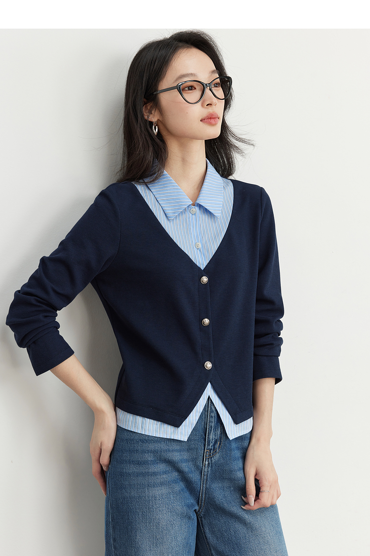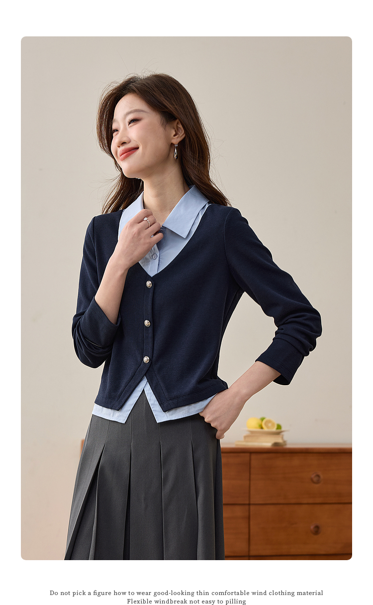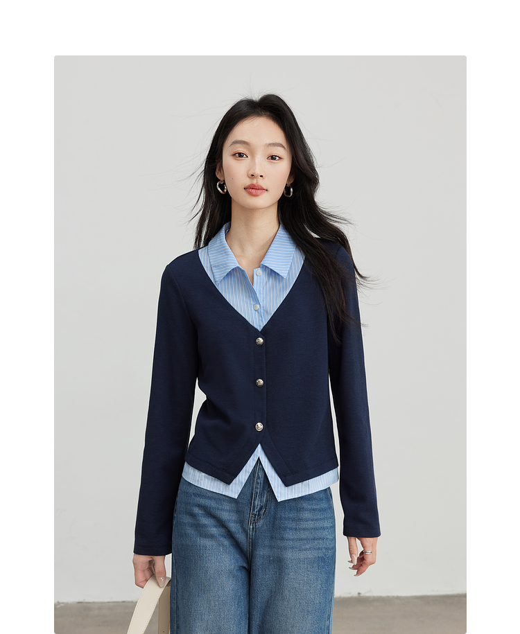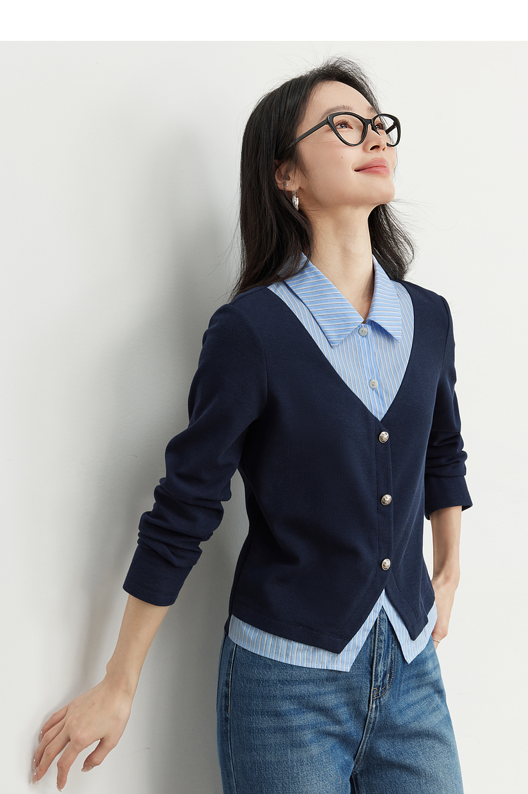【1件75折】熙世界2025春秋新款复古学院风卫衣女假两件衬衫领拼接针织上衣