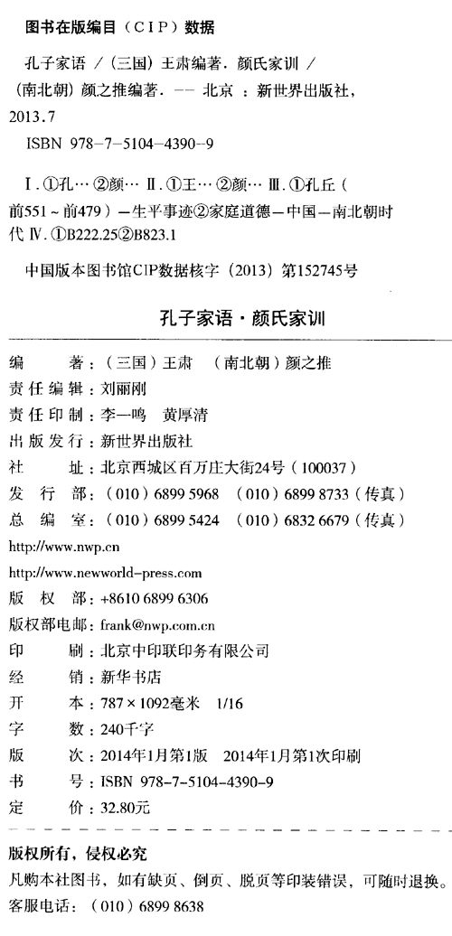 (仓发) 家藏四库:孔子家语·颜氏家训(化读本 插图版)/新世界出版社/[三国]王肃,[南北朝]颜之推/9787510443909