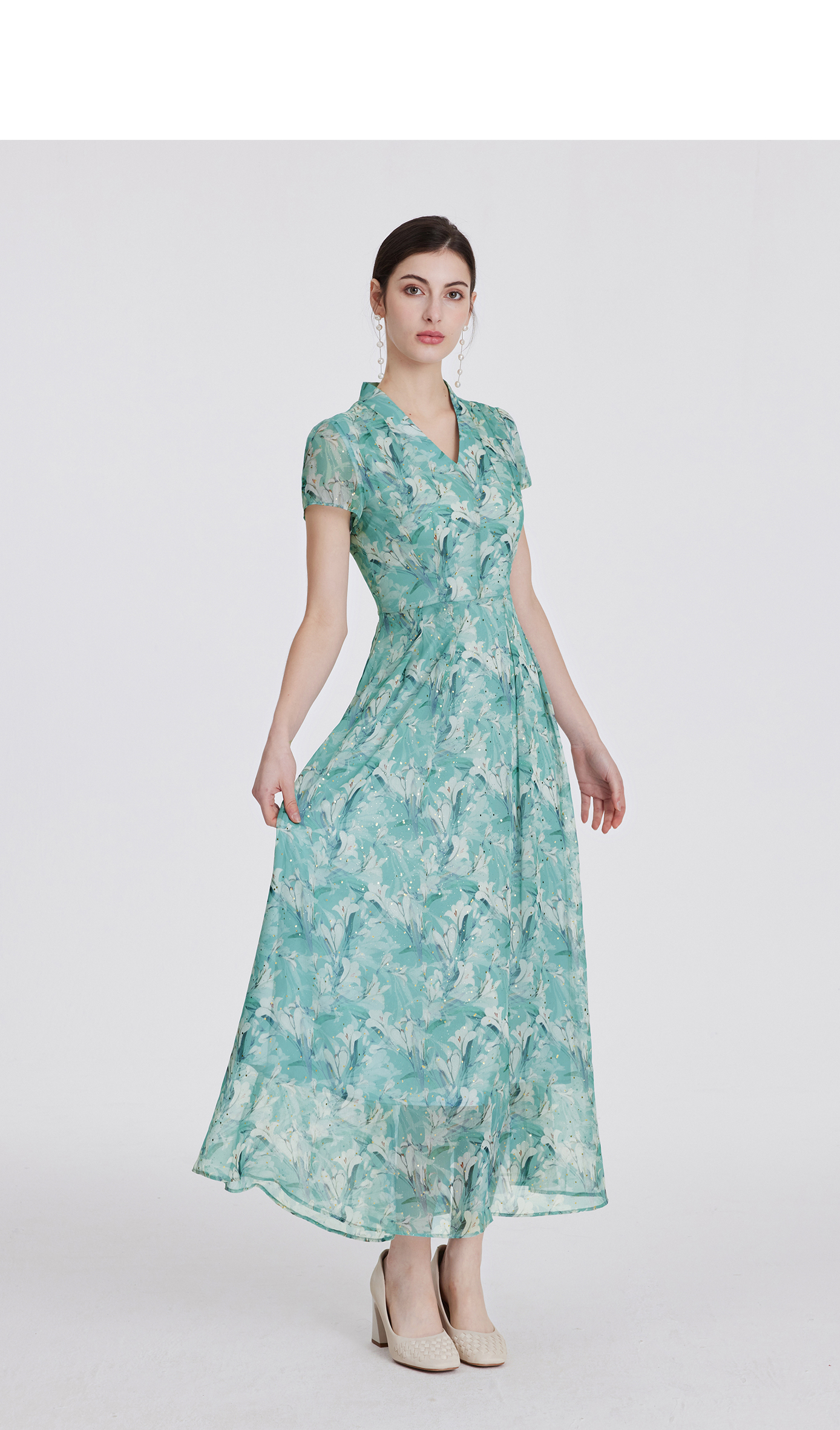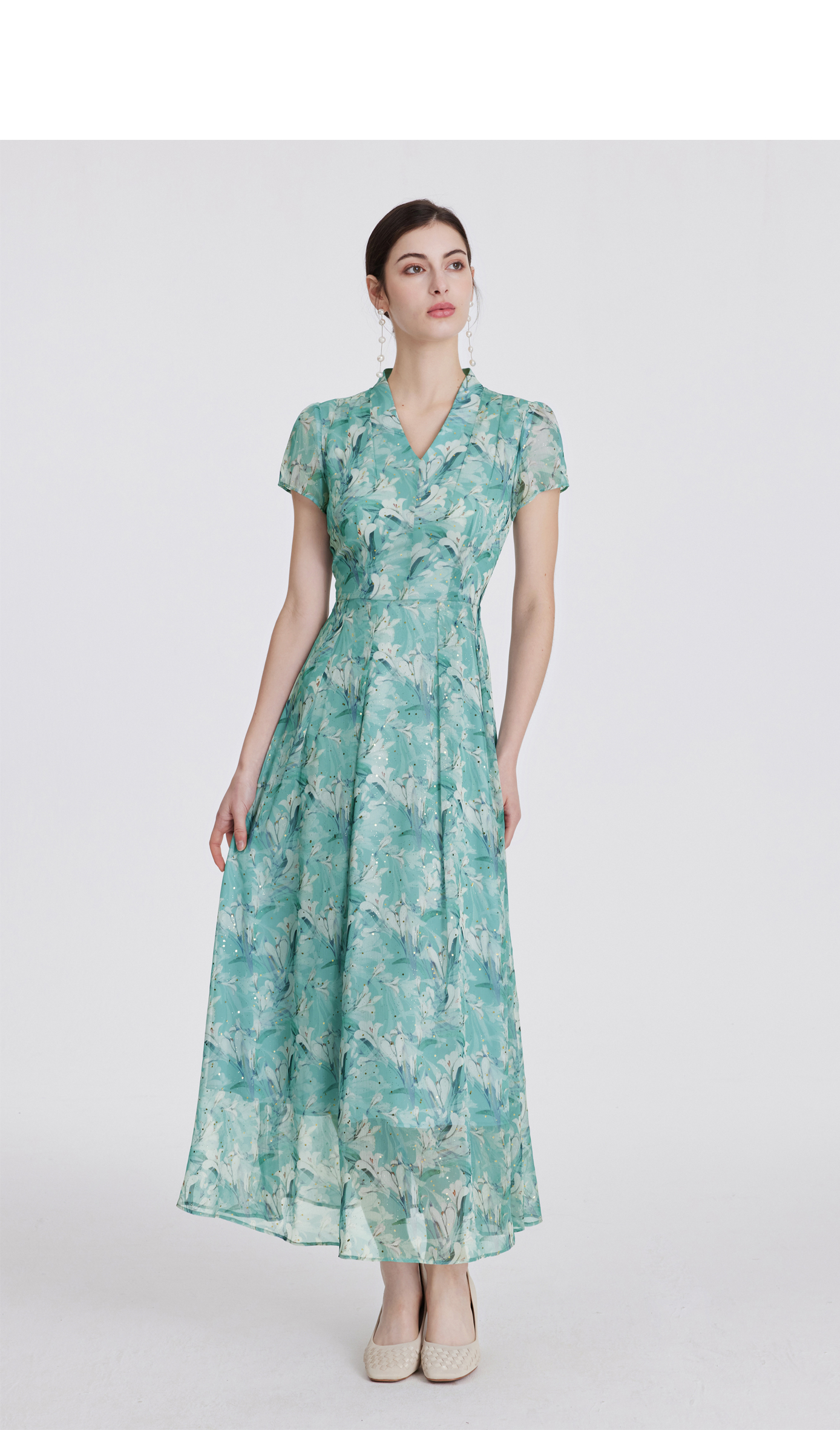 司歌印花飘逸雪纺连衣裙显瘦v领短袖复古A891047X