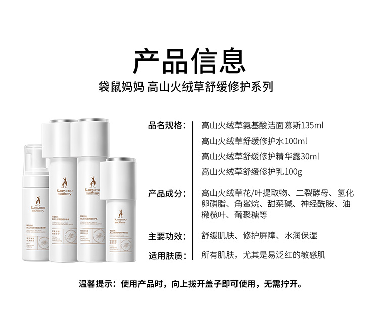 袋鼠妈妈 高山火绒草舒缓修护3件套(洁面+水+乳) +婴儿舒缓精华油80ml 改善泛红 长效保湿