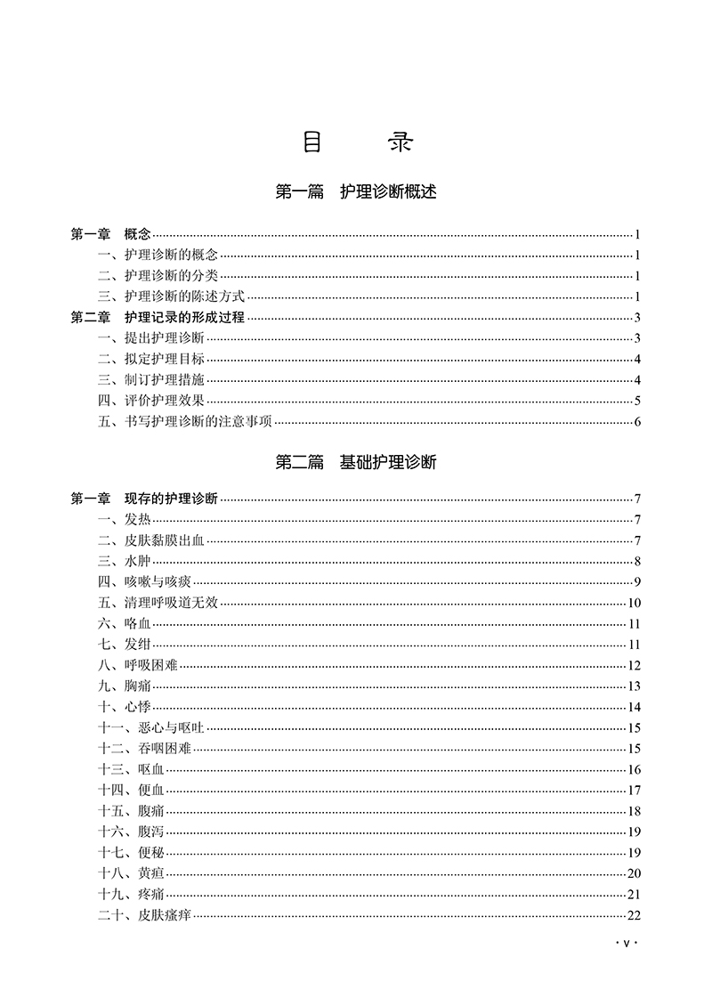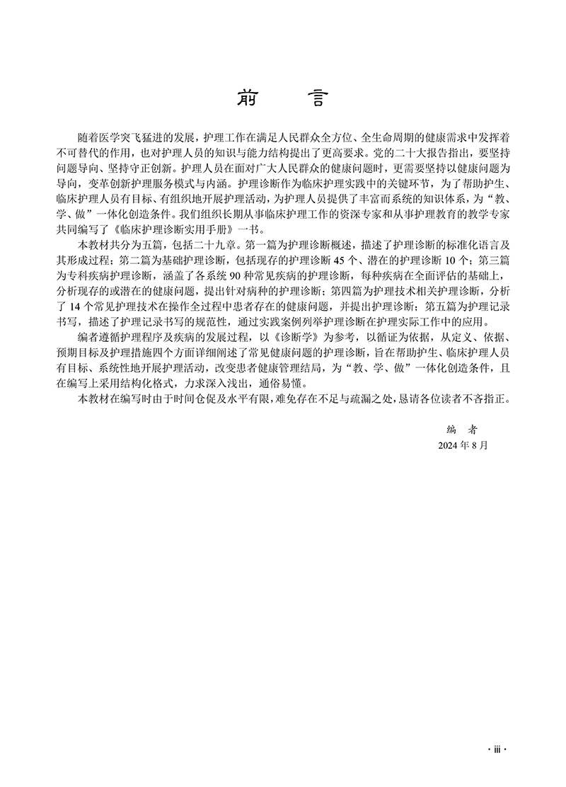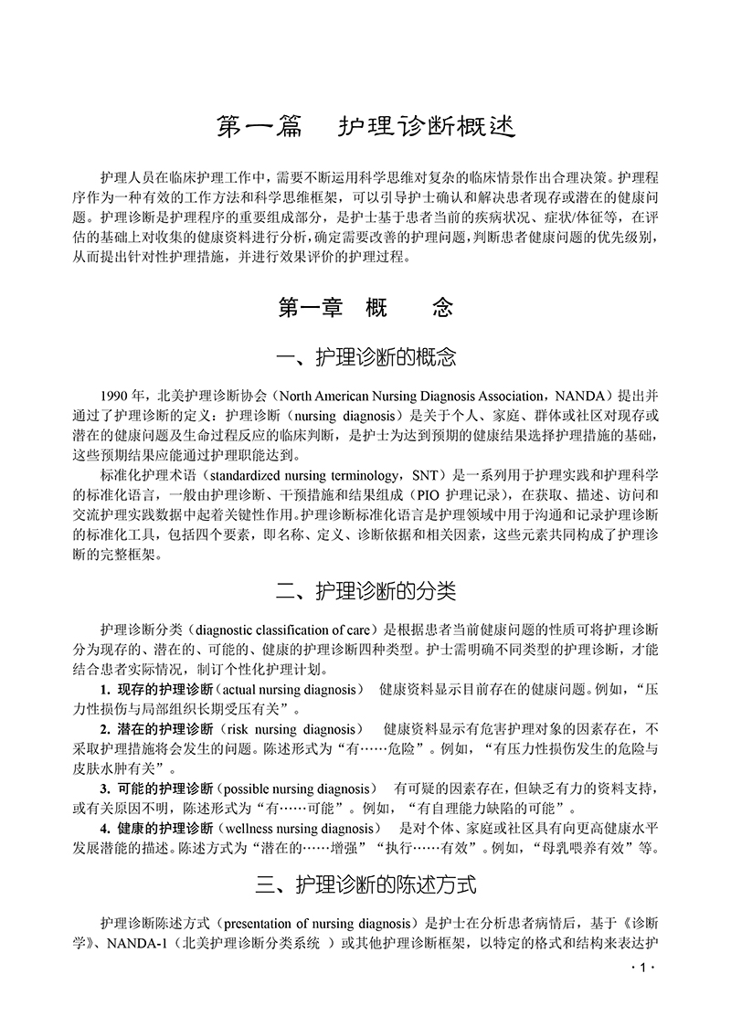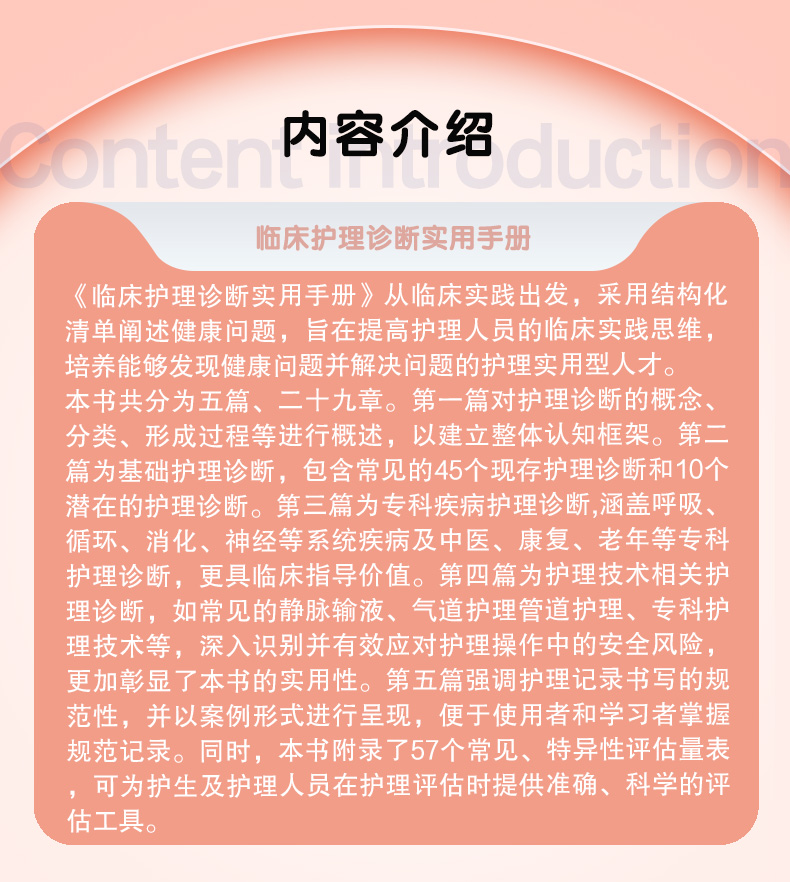 本书共分为五篇、二十九章。第一篇对护理诊断的概念、分类、形成过程等进行概述,以建立整体认知框架。第二篇为基础护理诊断,包含常见的45个现存护理诊断和10个潜在的护理诊断。第三篇为专科疾病护理诊断,涵盖呼吸、循环、消化、神经等系统疾病及中医、康复、老年等专科护理诊断,更其临床指导价值。第四篇为护理技术相关护理诊断,如常见的静脉输液、气道护理、管理护理、专科护理技术等,深入识别并有效应对护理操作中的安全风险,更加彰显了本书的实用性。第五篇强调护理记录书写的规范性,并以案例形式进行呈现,便于使用者和学习者掌握规范记录。