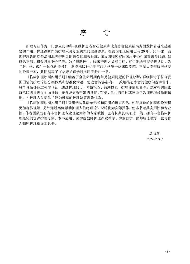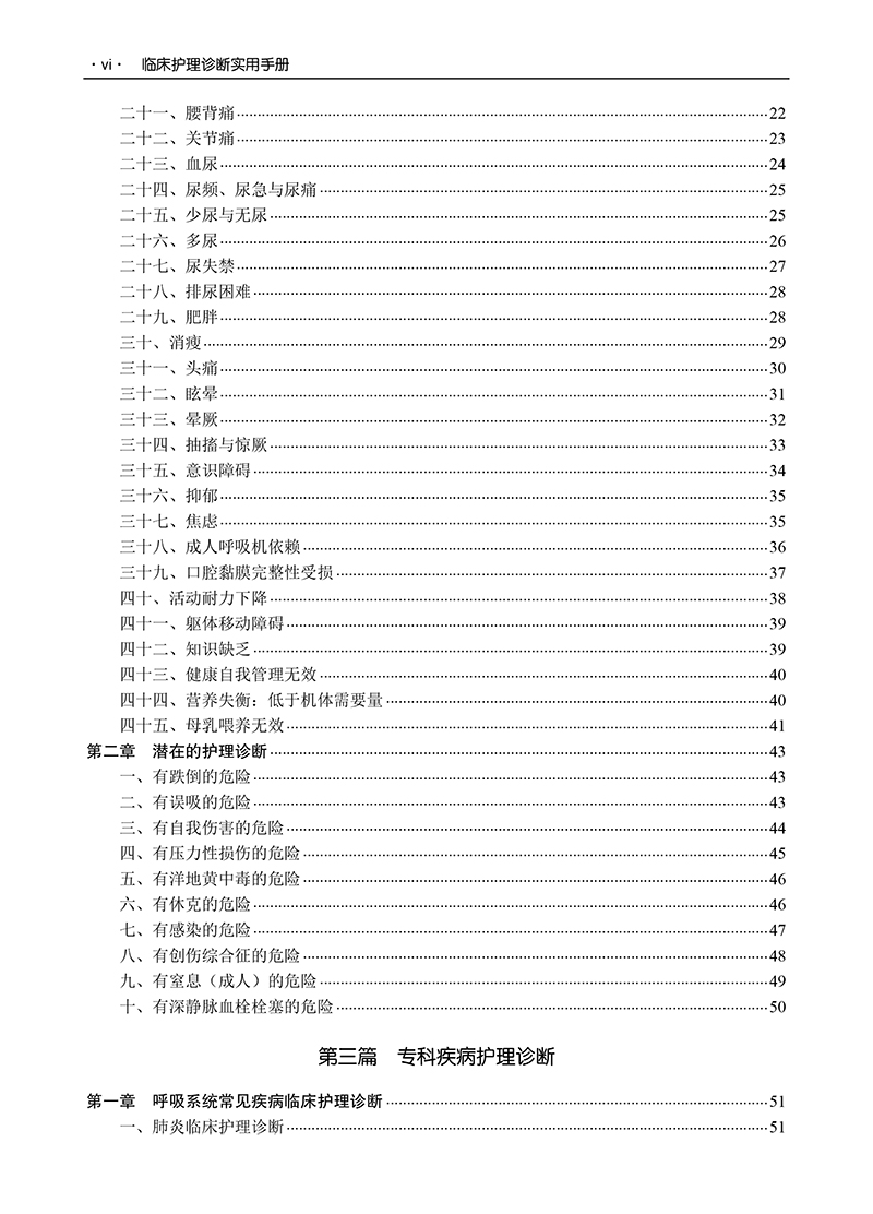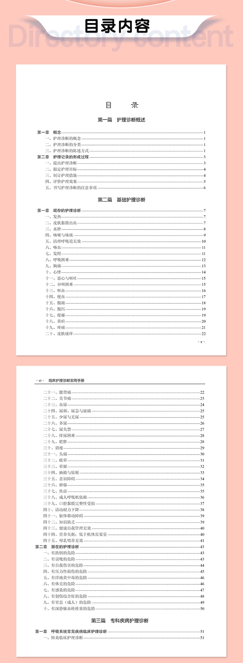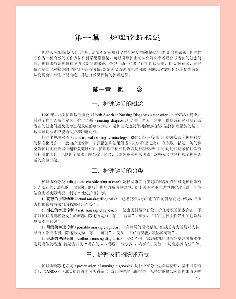 本书共分为五篇、二十九章。第一篇对护理诊断的概念、分类、形成过程等进行概述,以建立整体认知框架。第二篇为基础护理诊断,包含常见的45个现存护理诊断和10个潜在的护理诊断。第三篇为专科疾病护理诊断,涵盖呼吸、循环、消化、神经等系统疾病及中医、康复、老年等专科护理诊断,更其临床指导价值。第四篇为护理技术相关护理诊断,如常见的静脉输液、气道护理、管理护理、专科护理技术等,深入识别并有效应对护理操作中的安全风险,更加彰显了本书的实用性。第五篇强调护理记录书写的规范性,并以案例形式进行呈现,便于使用者和学习者掌握规范记录。