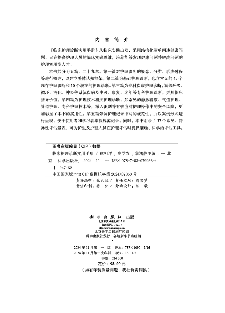 临床护理诊断实用手册 席祖洋 高学农 詹鸿静主编 护理专业学生 注册护士和执业护士 临床护理专业人士等9787030799364科学出版社
