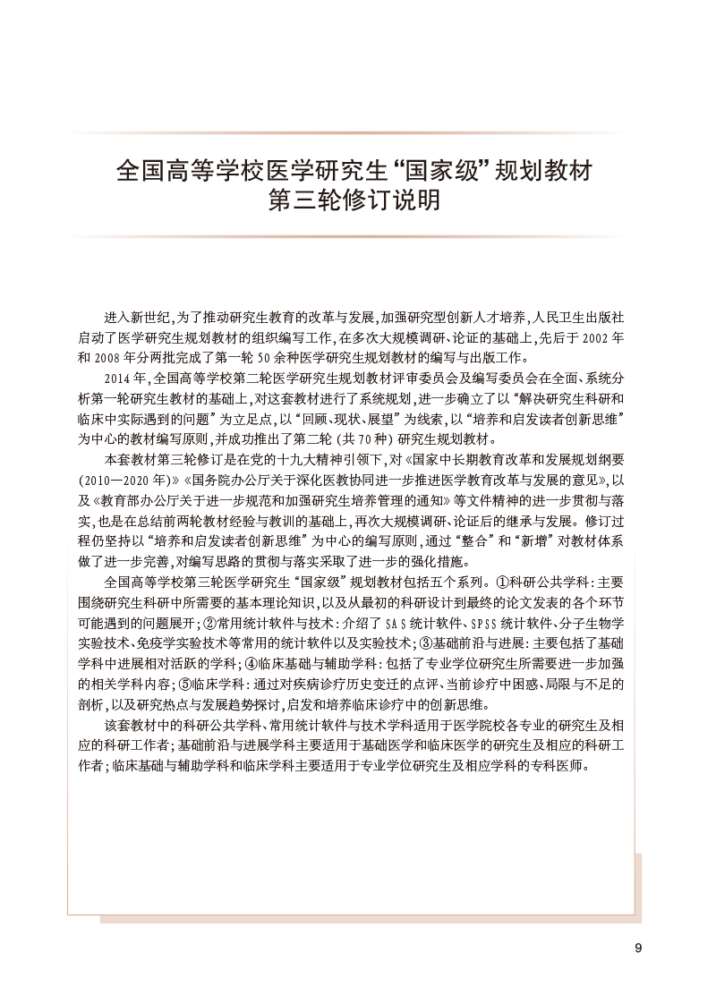 全套教材共包括五个系列:科研公共学科主要围绕研究生科研中所需要的基本理论知识,以及从最初的科研设计到最终的论文发表的各个环节可能遇到的问题展开;实验技术与统计软件系列介绍了SAS统计软件、SPSS统计软件、分子生物学实验技术、免疫学实验技术等常用的统计软件以及实验技术;基础前沿与进展系列主要包括了基础学科中进展相对活跃的学科;临床基础与辅助学科系列包括了临床型研究生所需要进一步加强的相关学科内容;临床专业学科系列通过对疾病诊疗历史变迁的点评、当前诊疗中困惑、局限与不足的剖析,以及研究热点与发展趋势探讨,启发和培养临床诊疗中的创新。