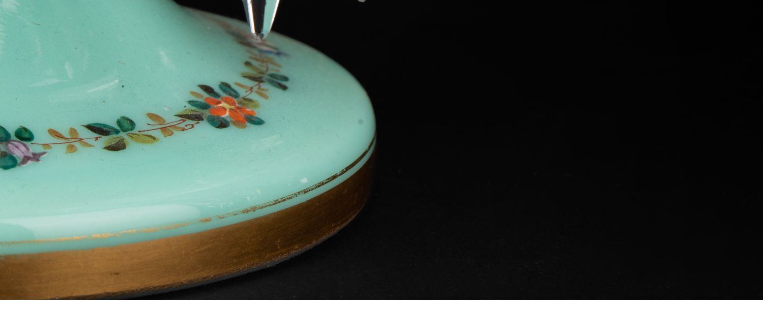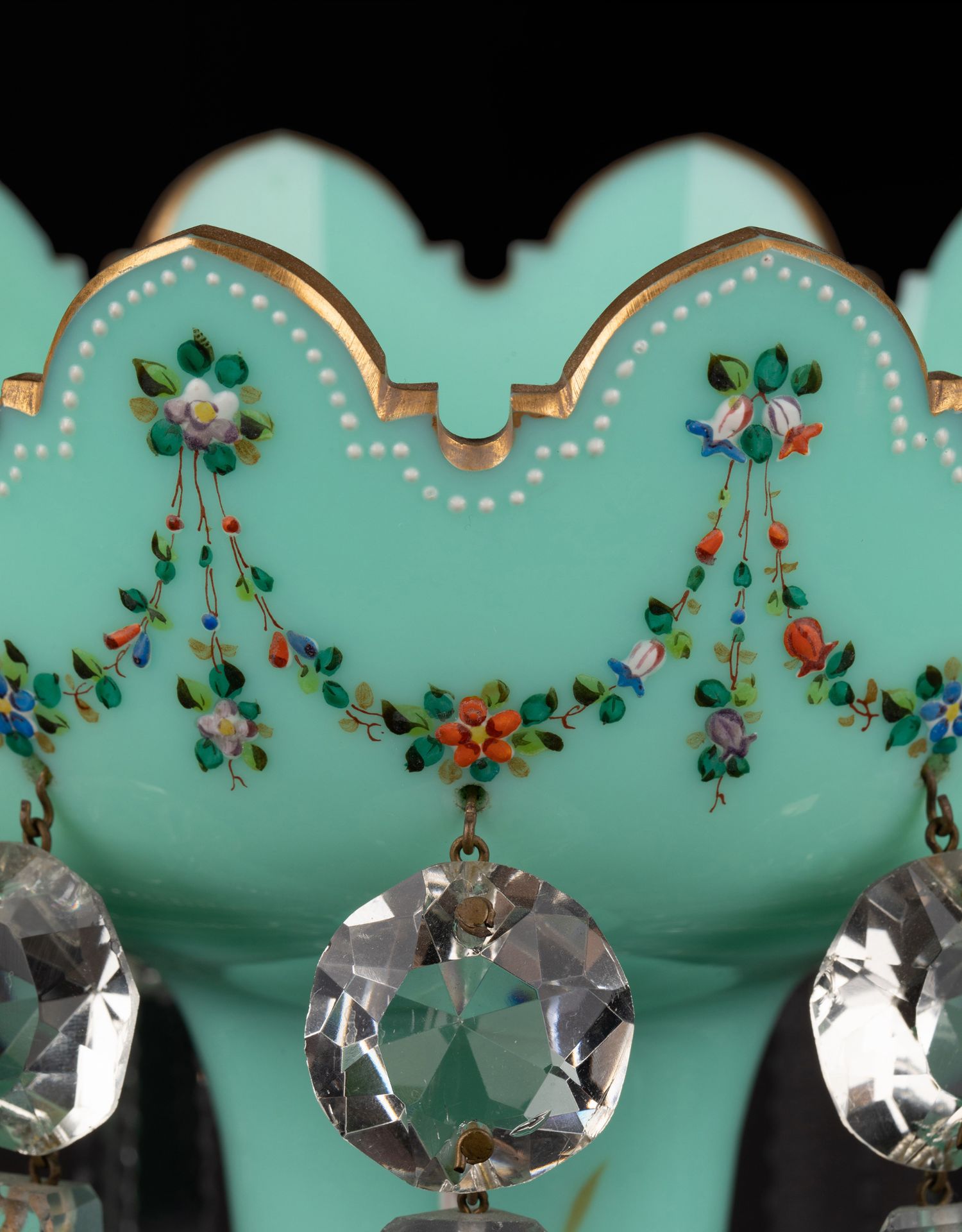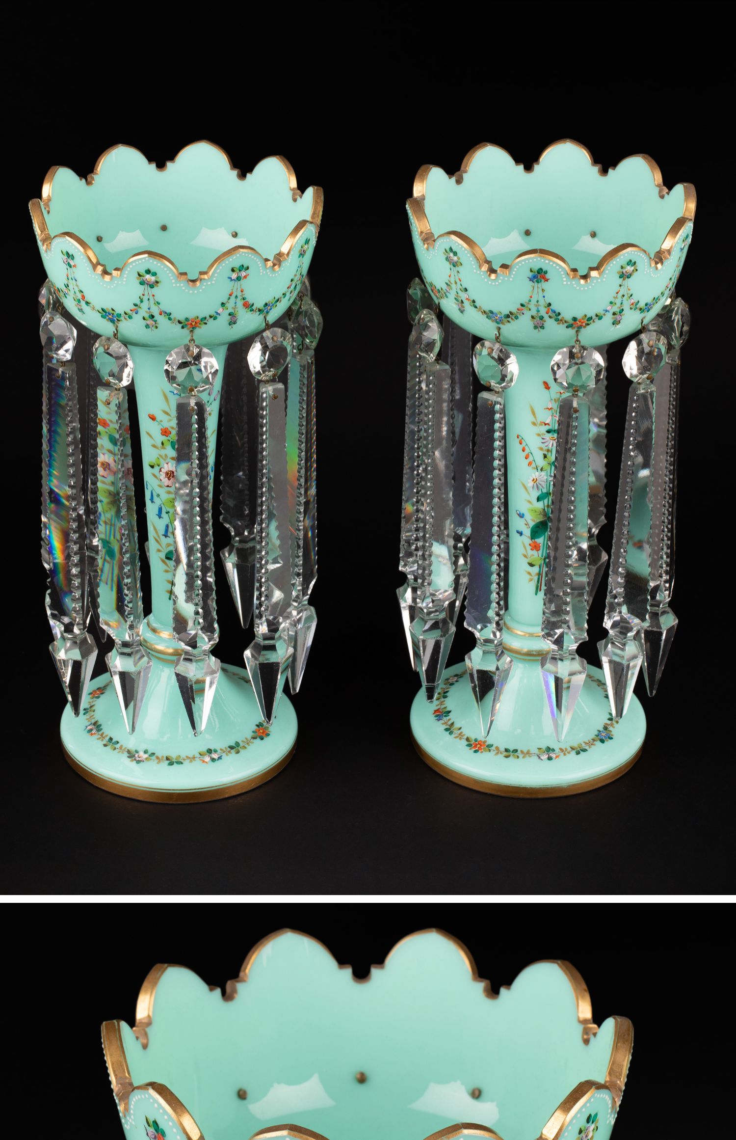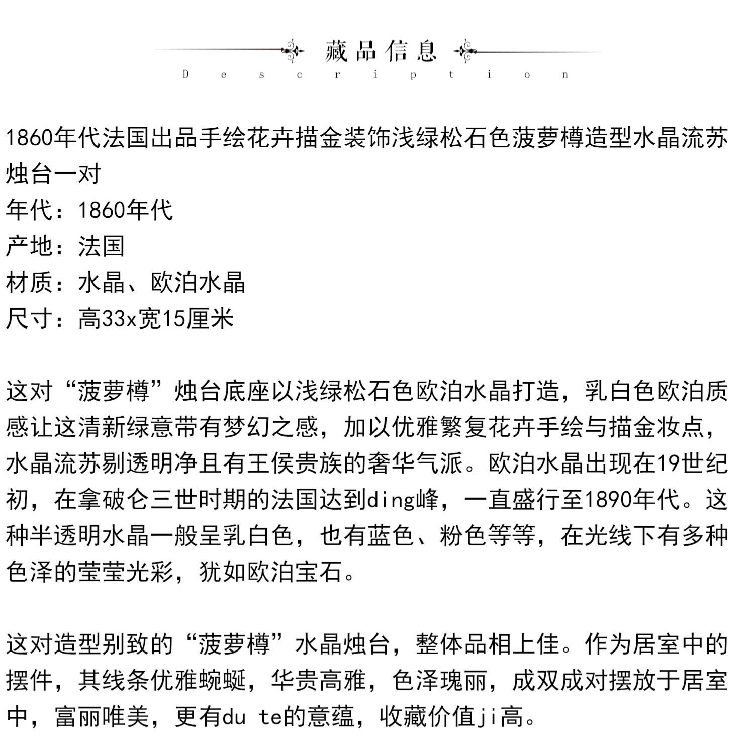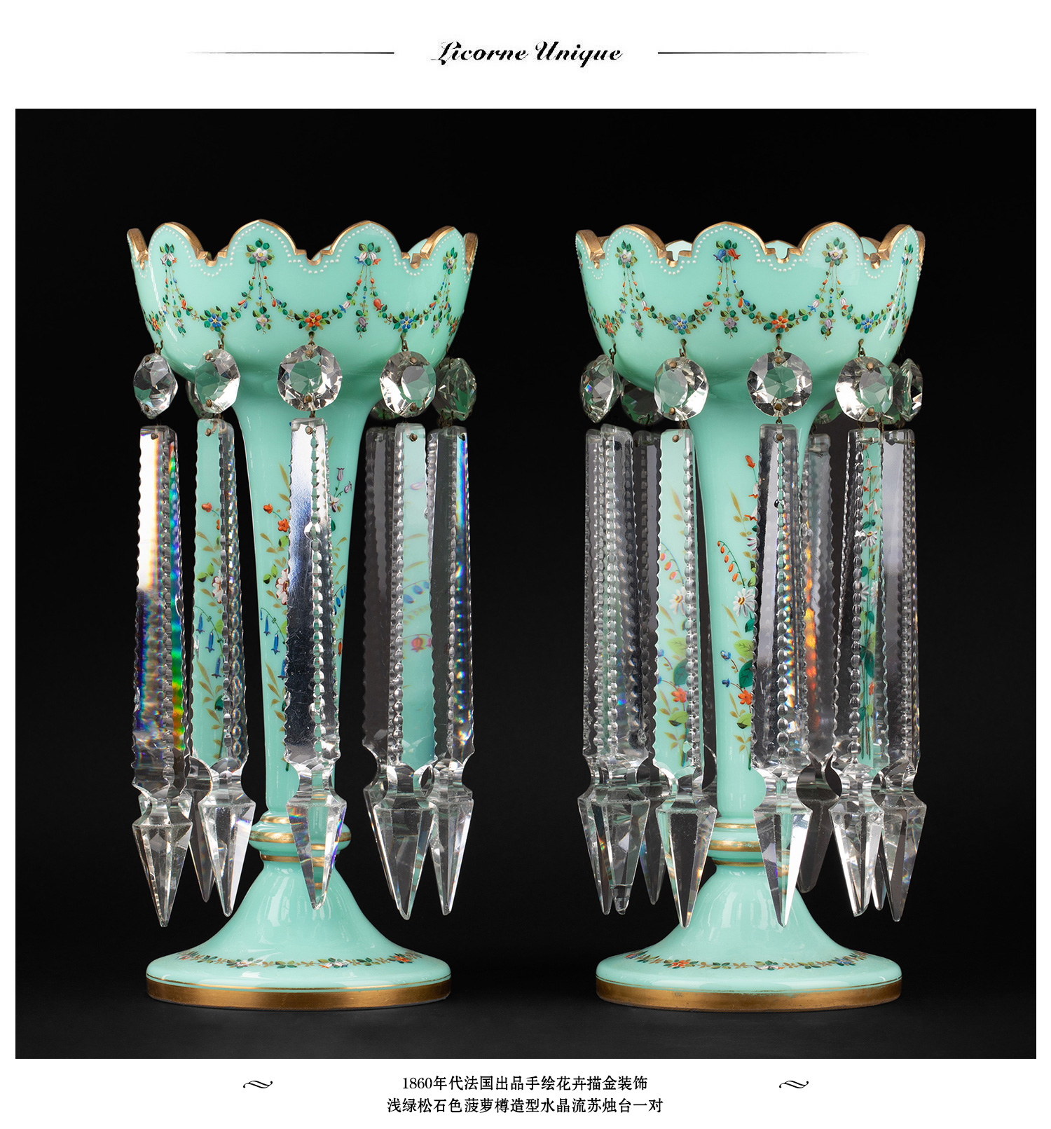 独角鹿西洋古董法国花卉描金浅绿松石色菠萝樽水晶流苏烛台一对