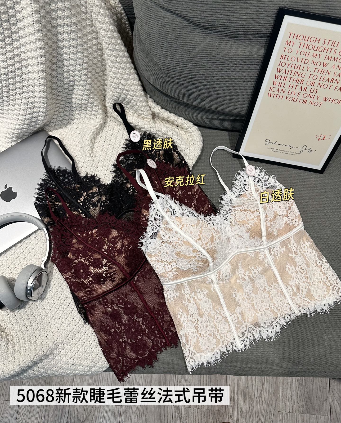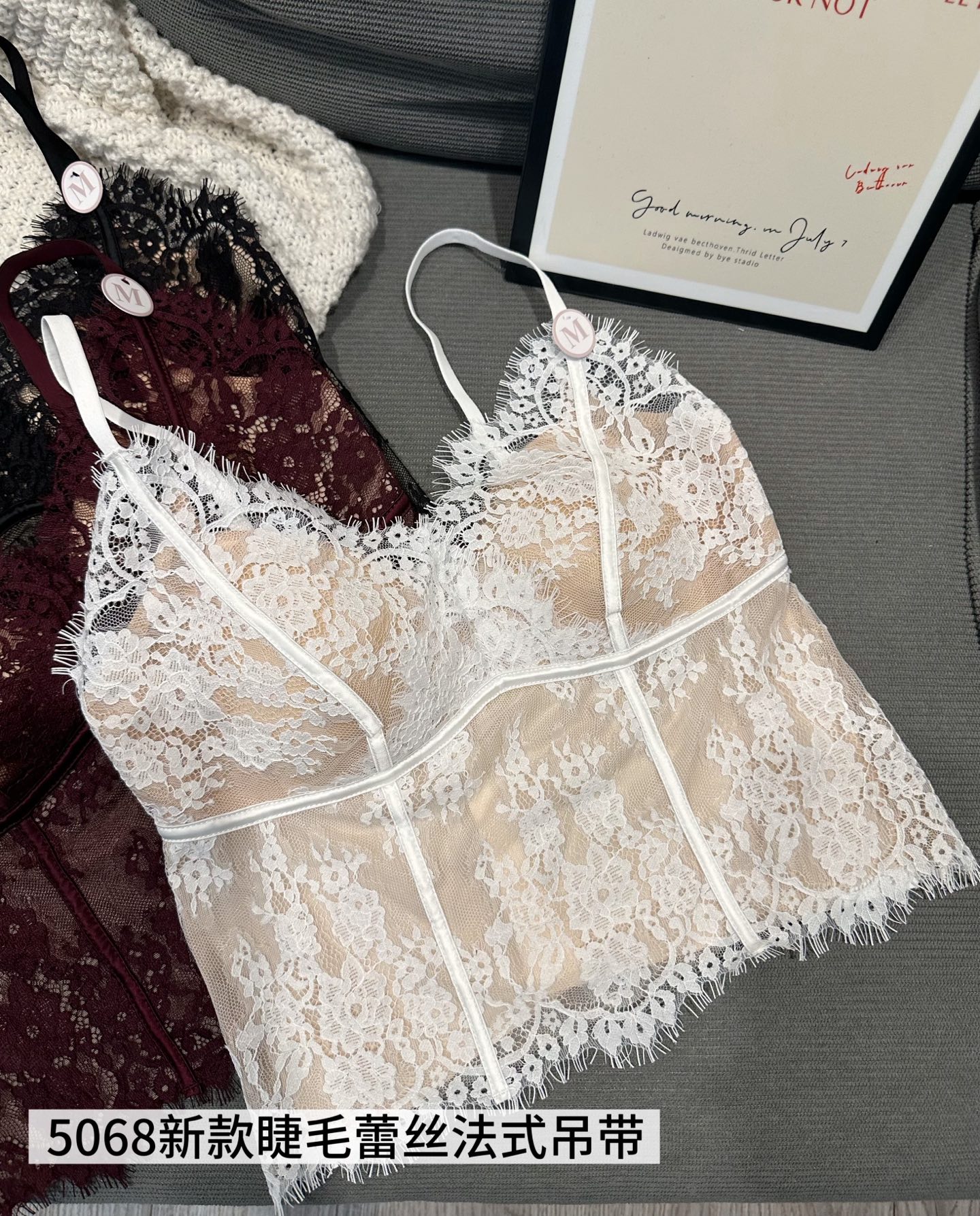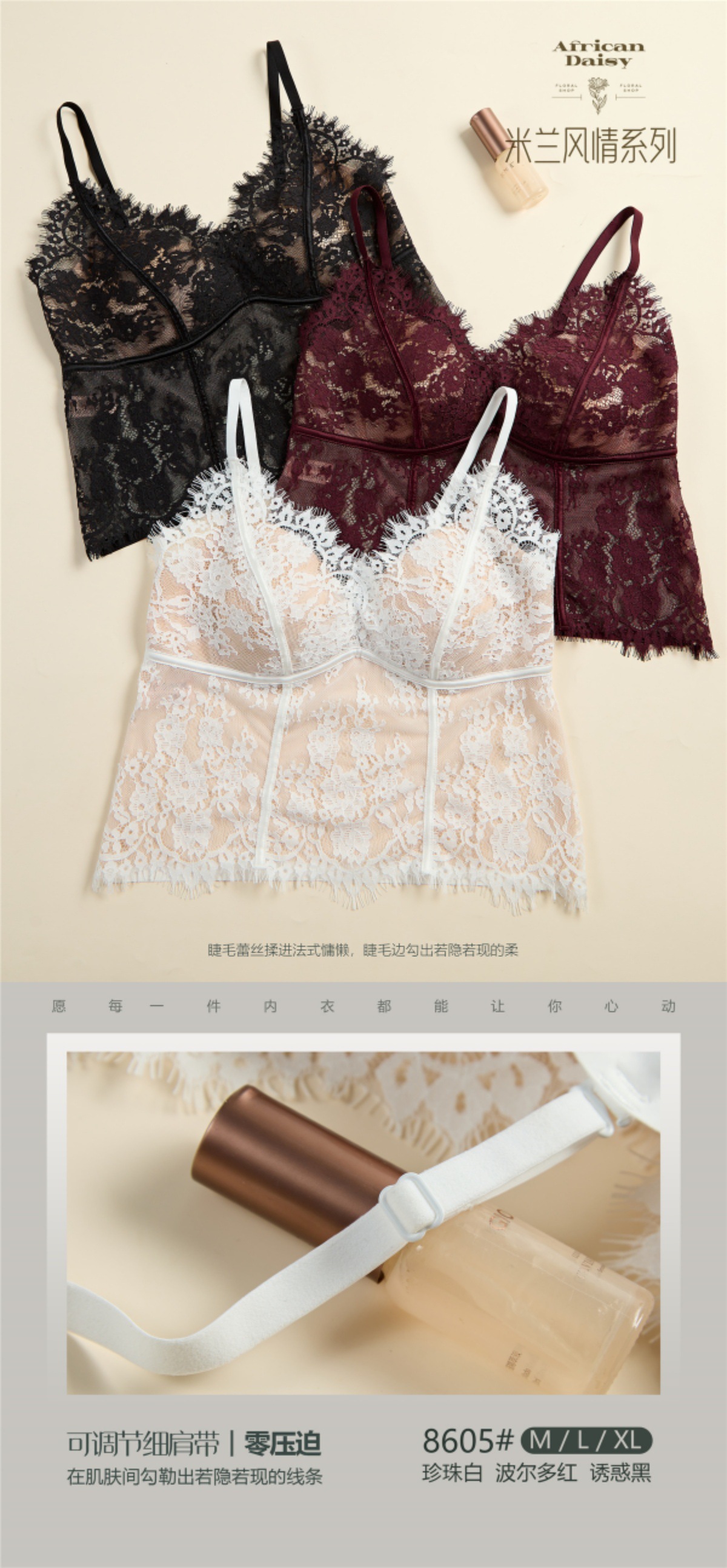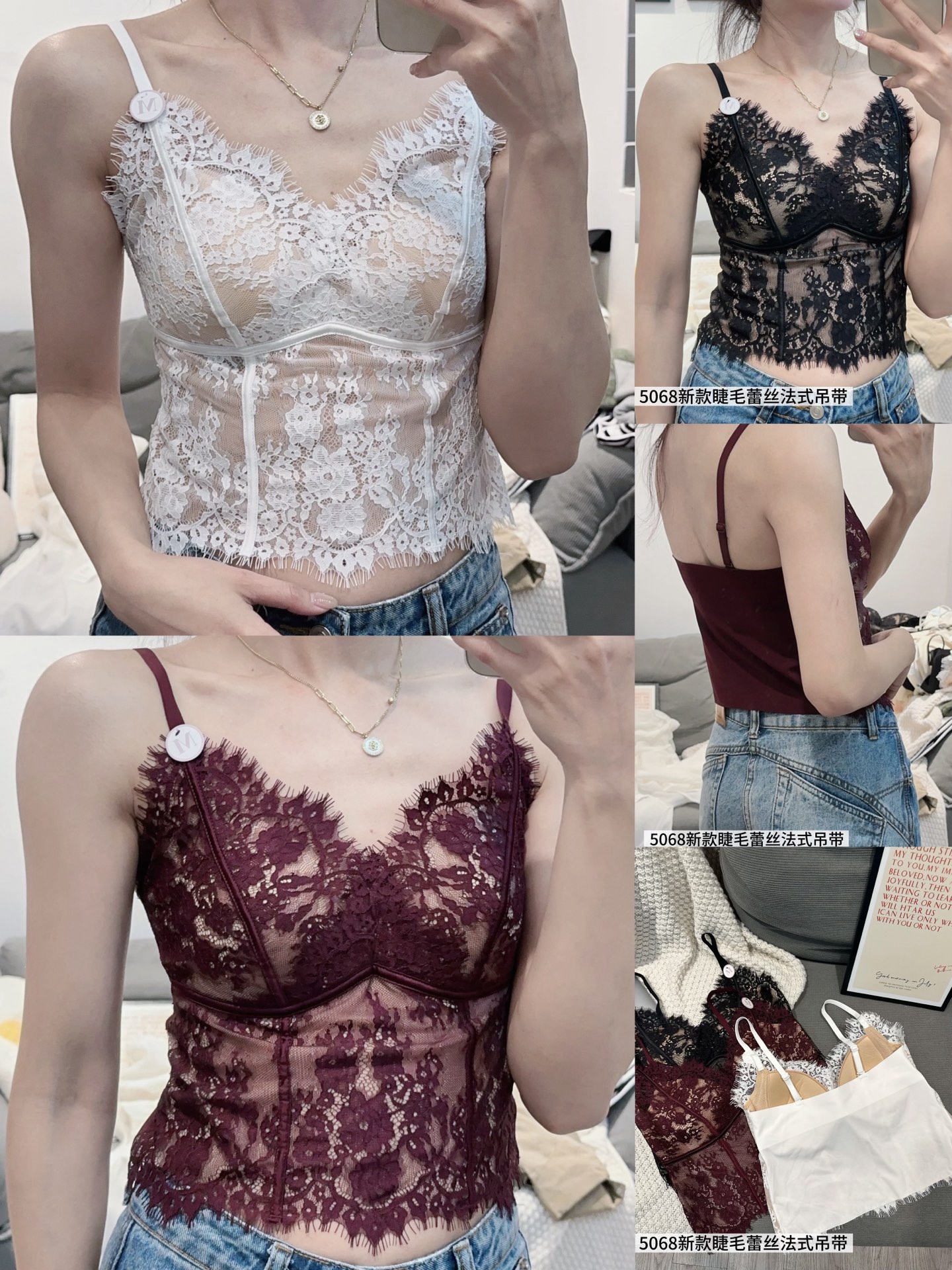 【GZ】无忧购春季新款睫毛法式蕾丝法式聚拢三角固定杯修身小细带背心5068(现货48小时内发货)