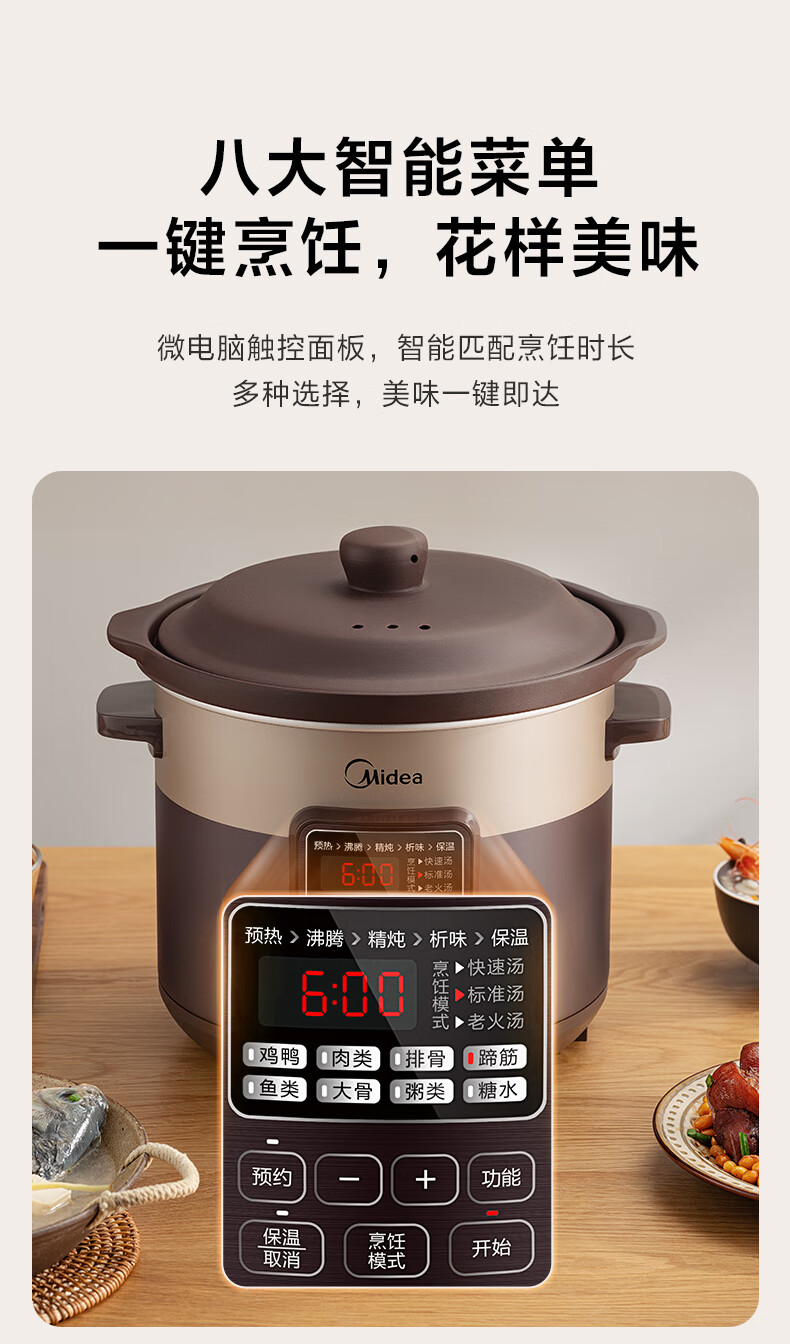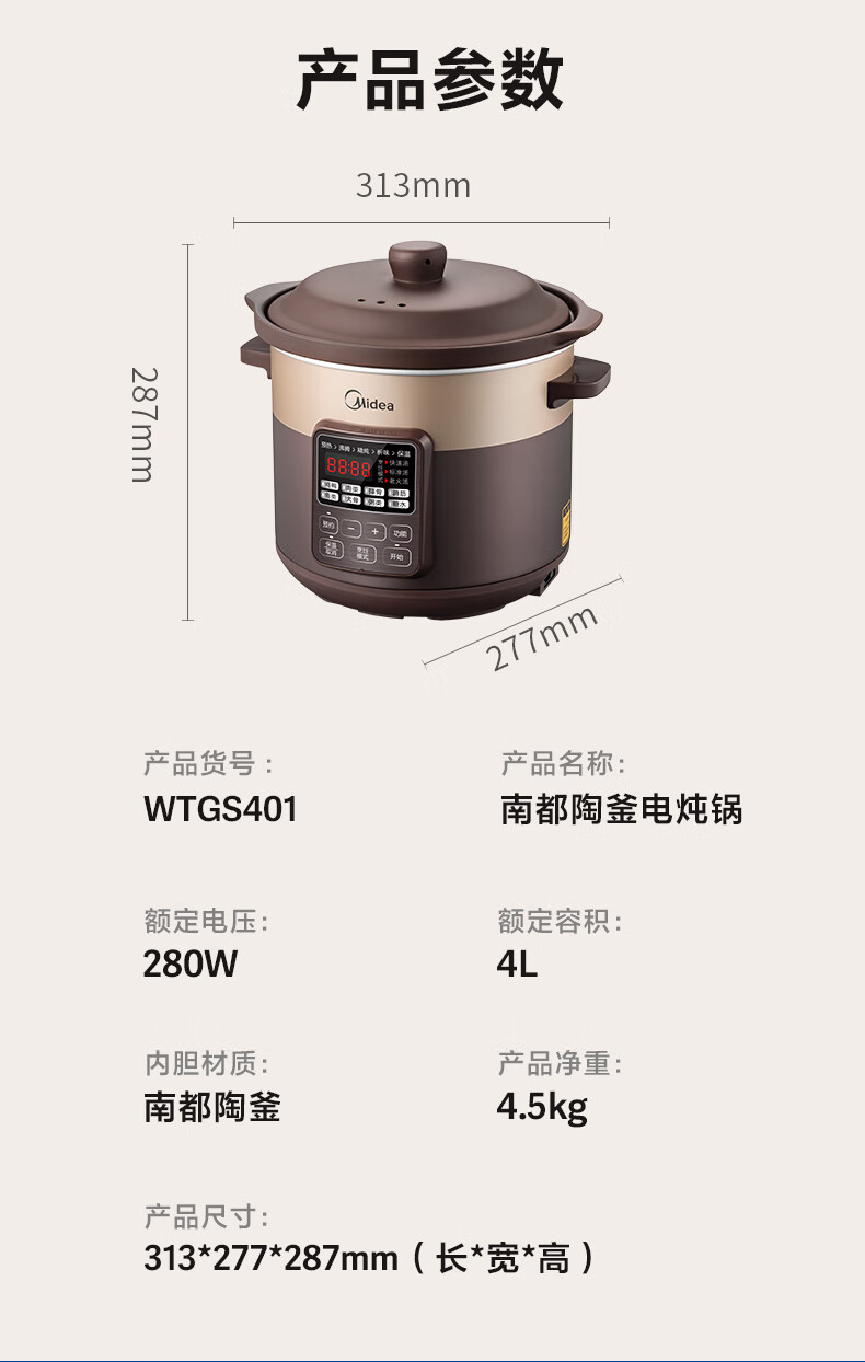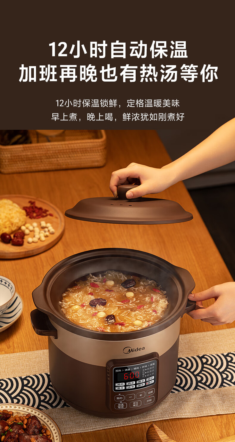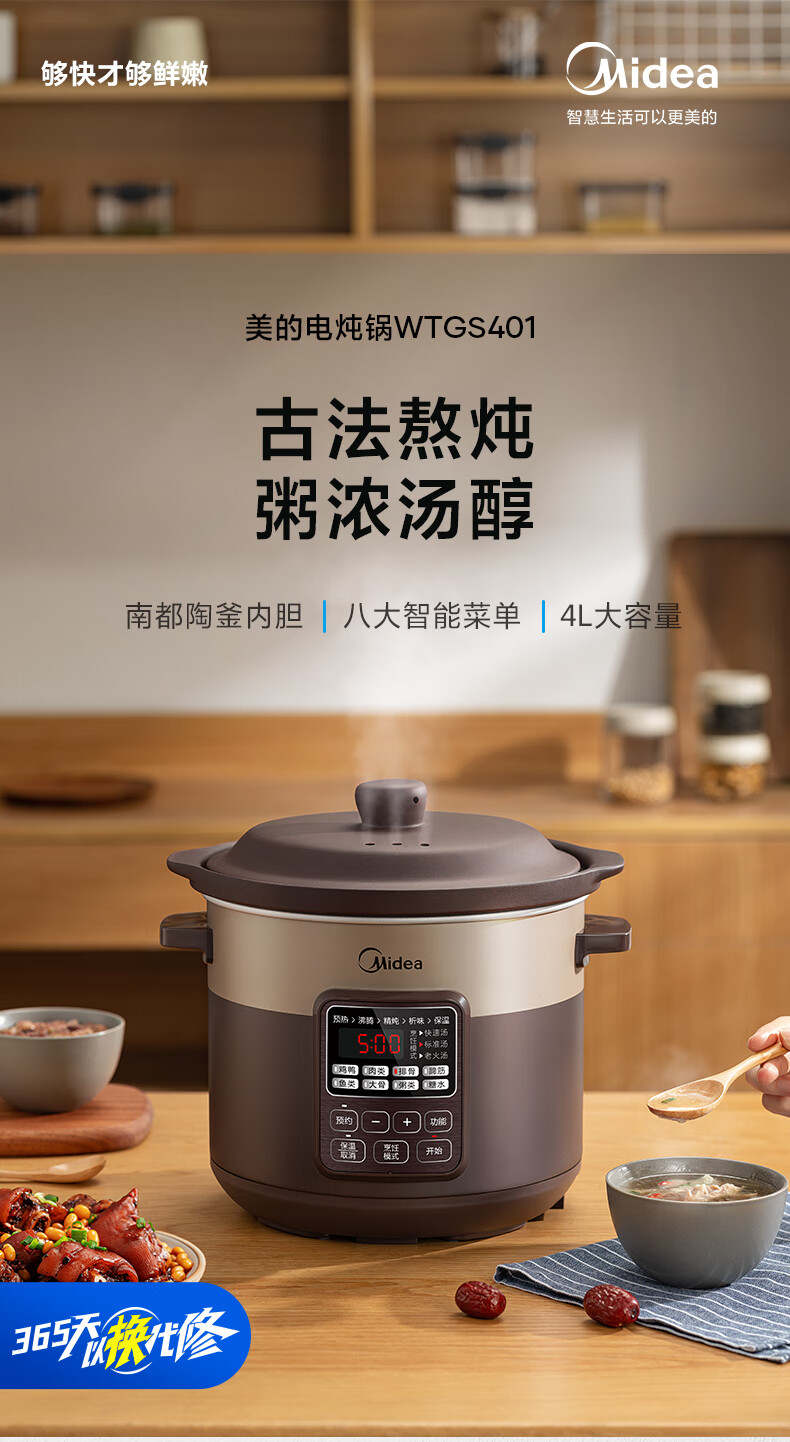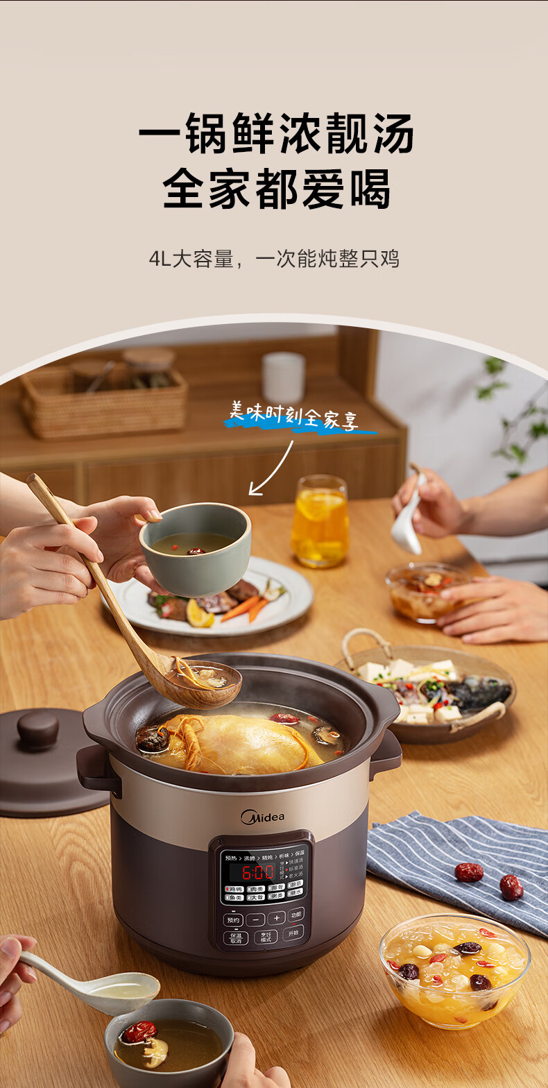 美的(Midea)电炖锅电炖盅养生锅4L大容量南都陶釜内胆陶瓷煲汤煮粥电砂锅家用预约全自动WTGS401