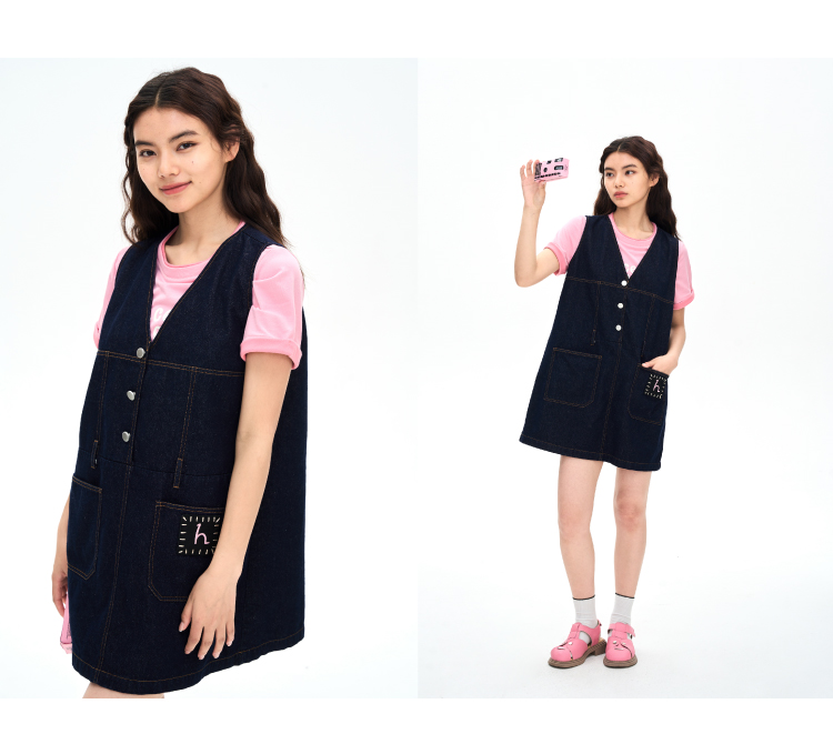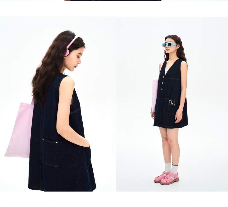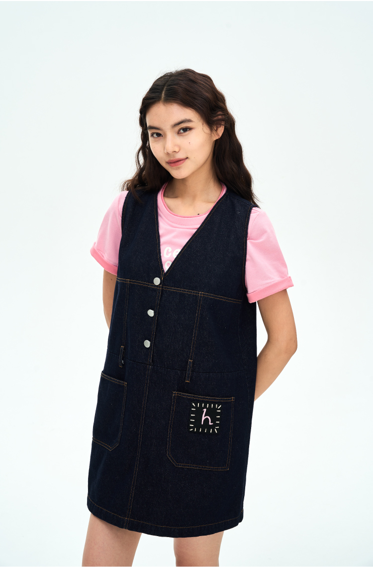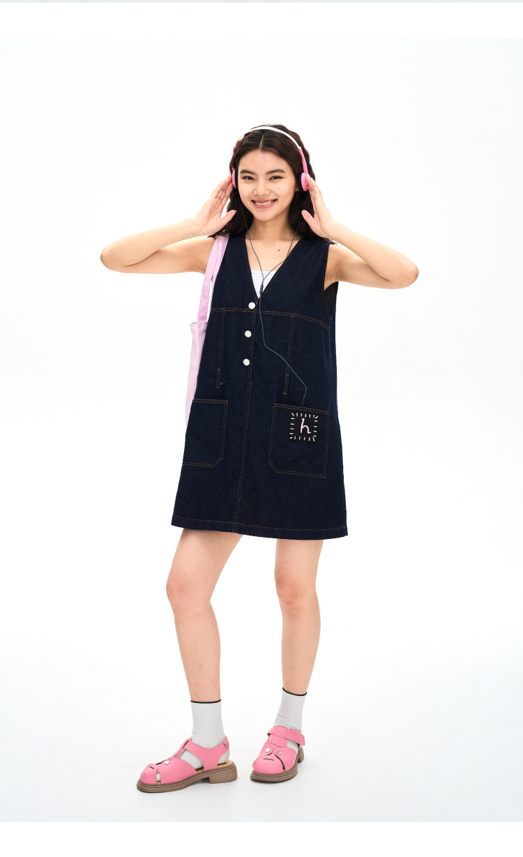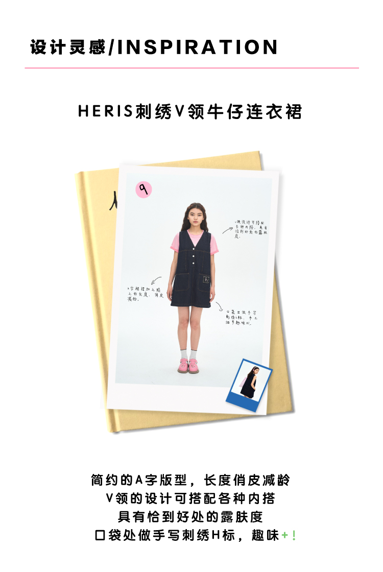 heris/H42106/手写线迹刺绣标 V领原色牛仔A摆减龄百搭连衣裙