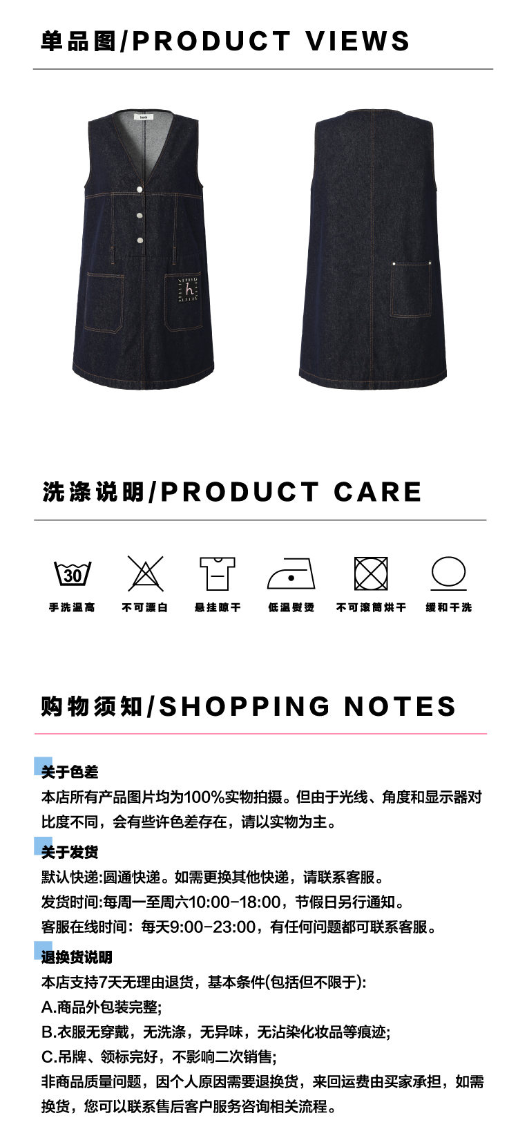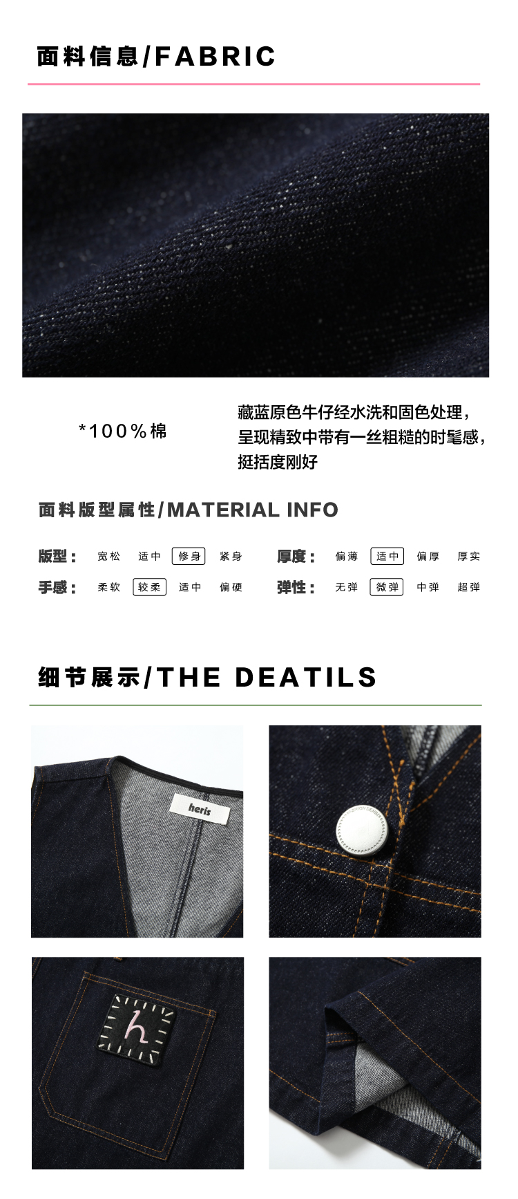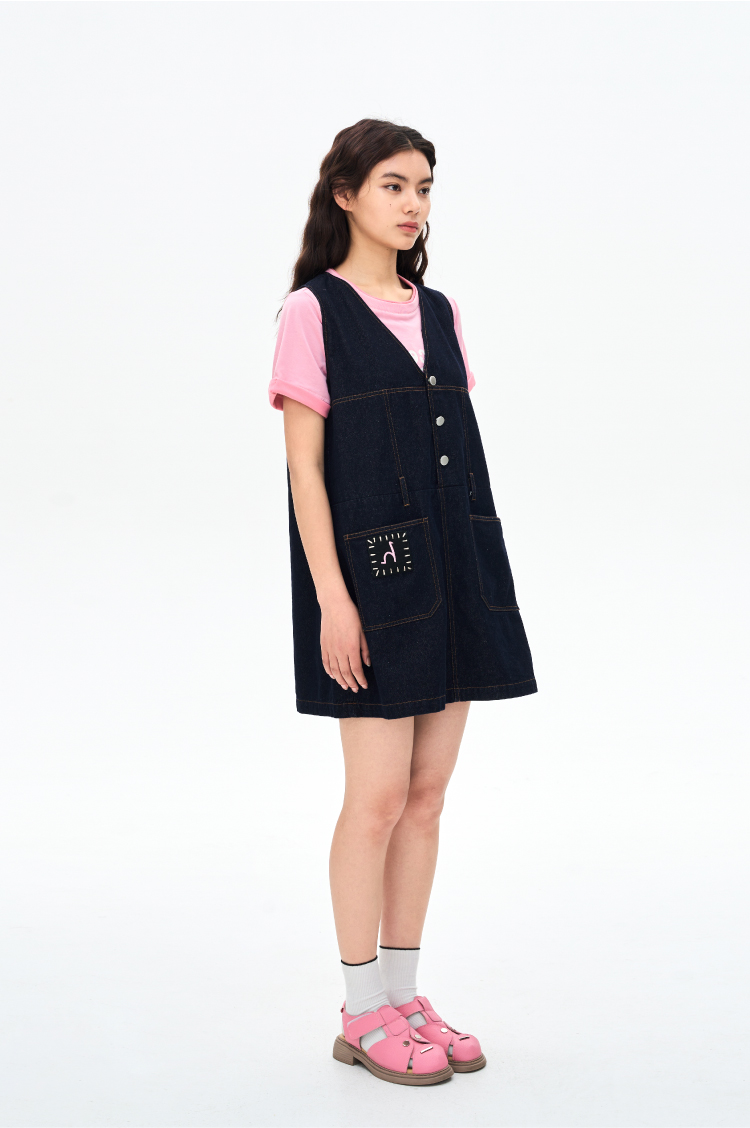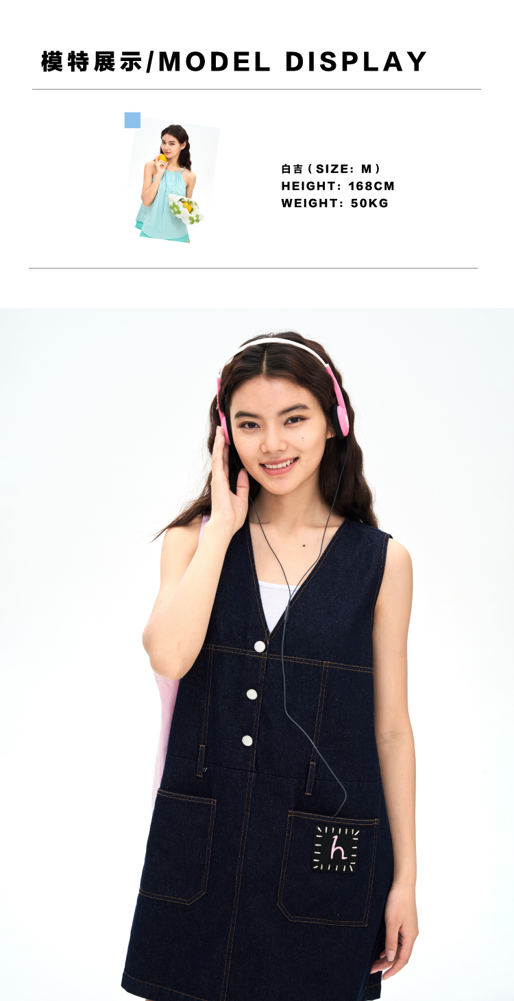 heris/H42106/手写线迹刺绣标 V领原色牛仔A摆减龄百搭连衣裙