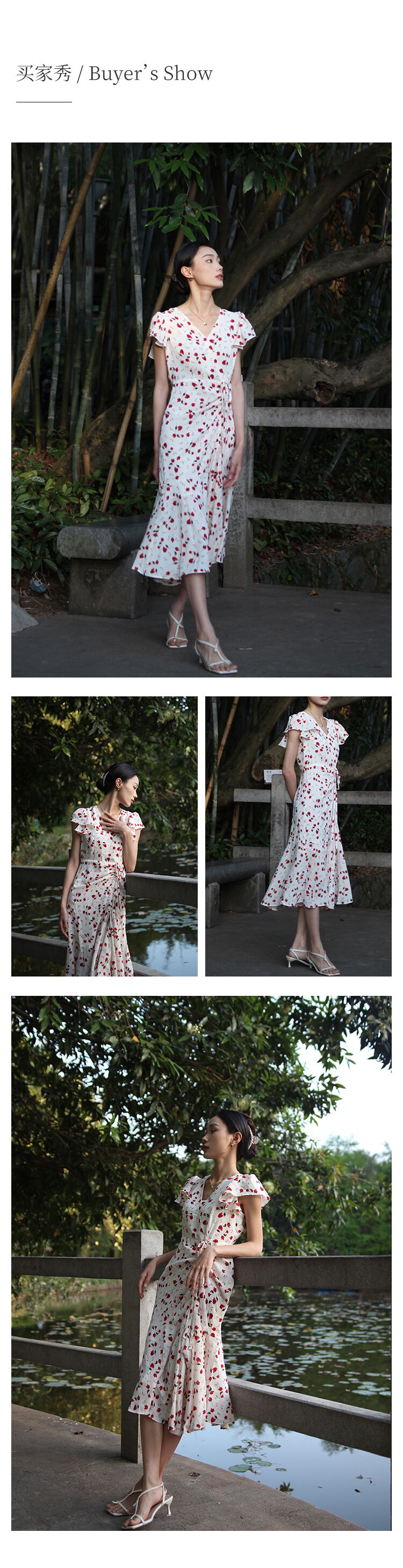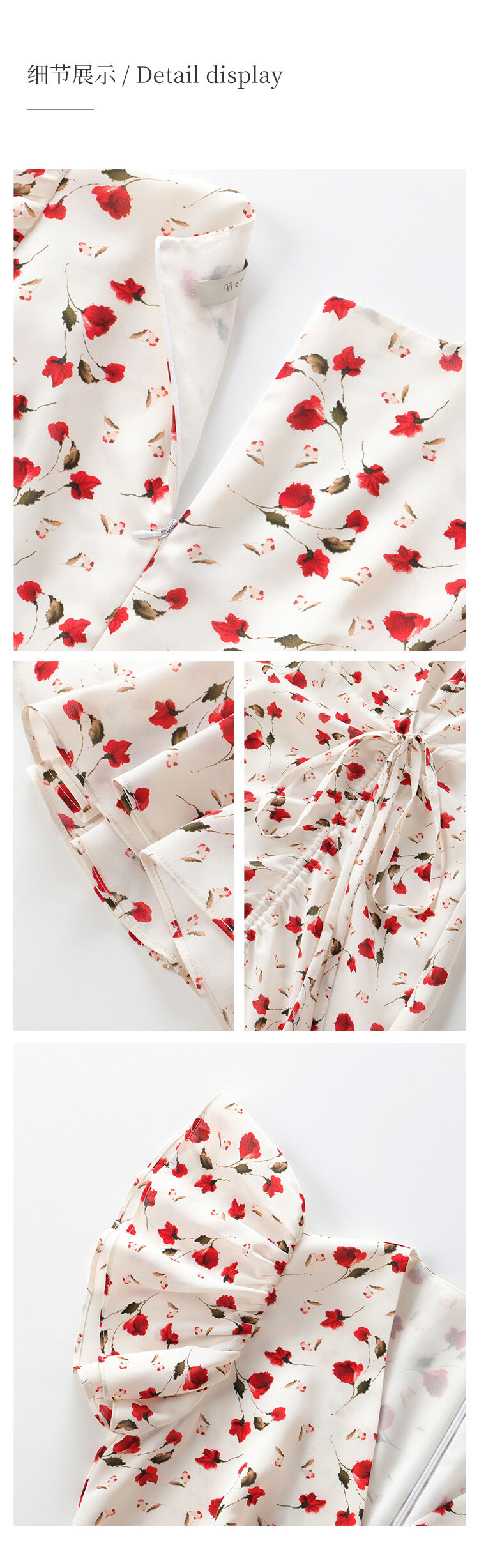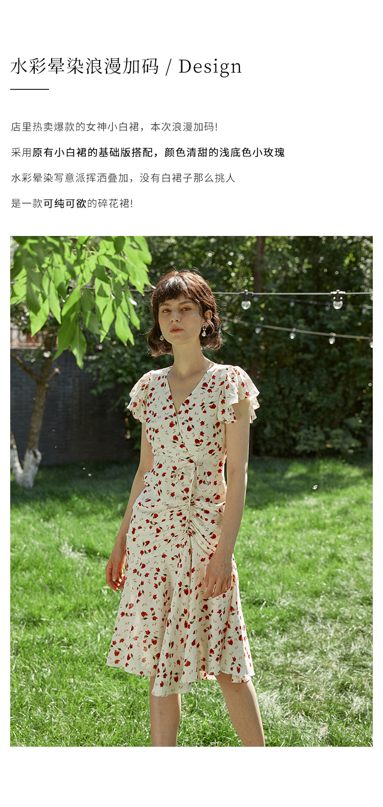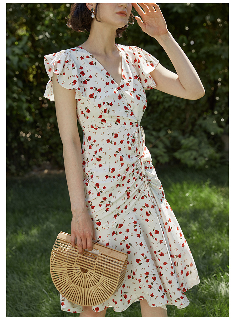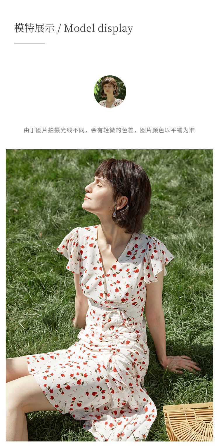 HeyDress法式碎花连衣裙女夏季V领抽褶茶歇裙复古玫瑰花气质收腰雪纺裙子